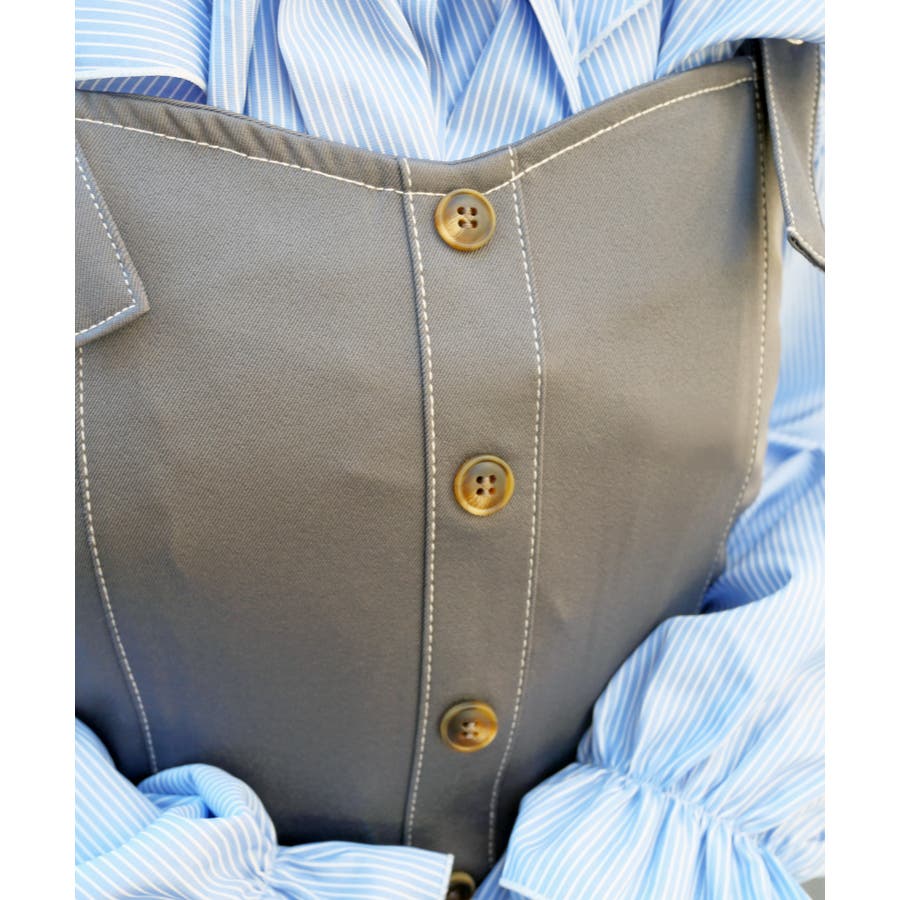 肩紐にあしらわれたバックルと太めのストラップが、デザインのアクセントに。