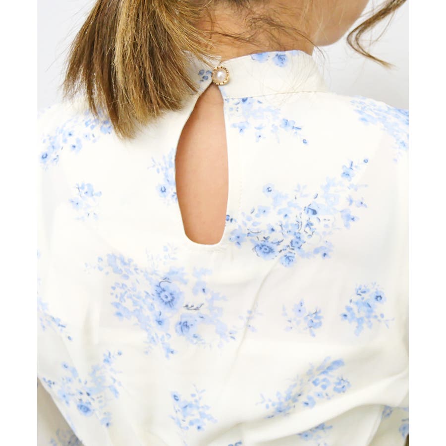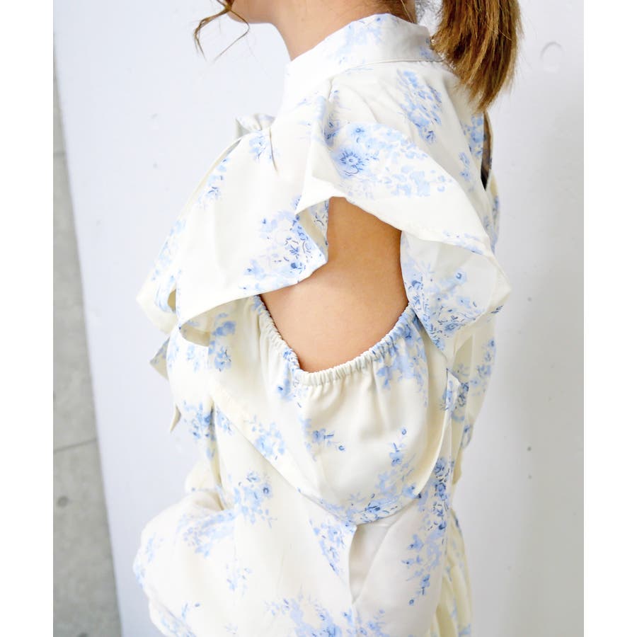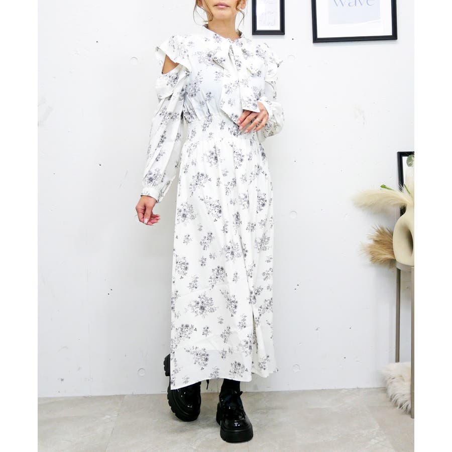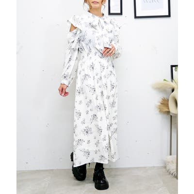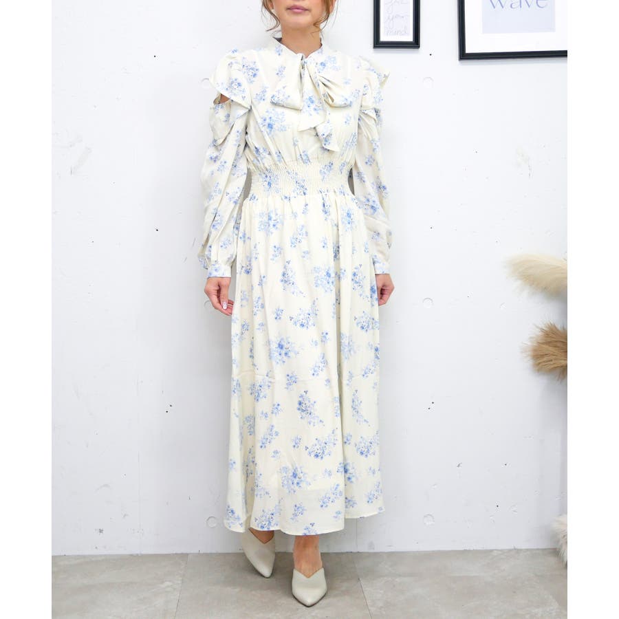 大きなボウタイリボンと繊細な花柄が上品な印象を与えつつ、肩あきデザインで程よい抜け感をプラス。