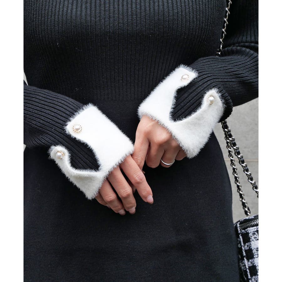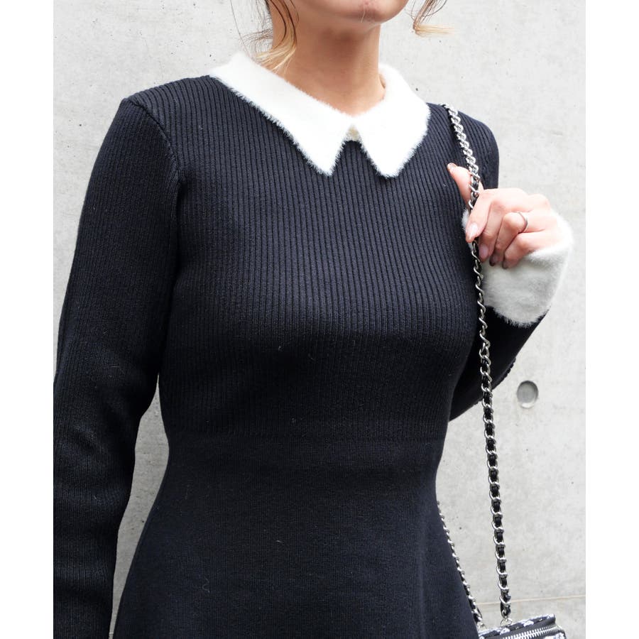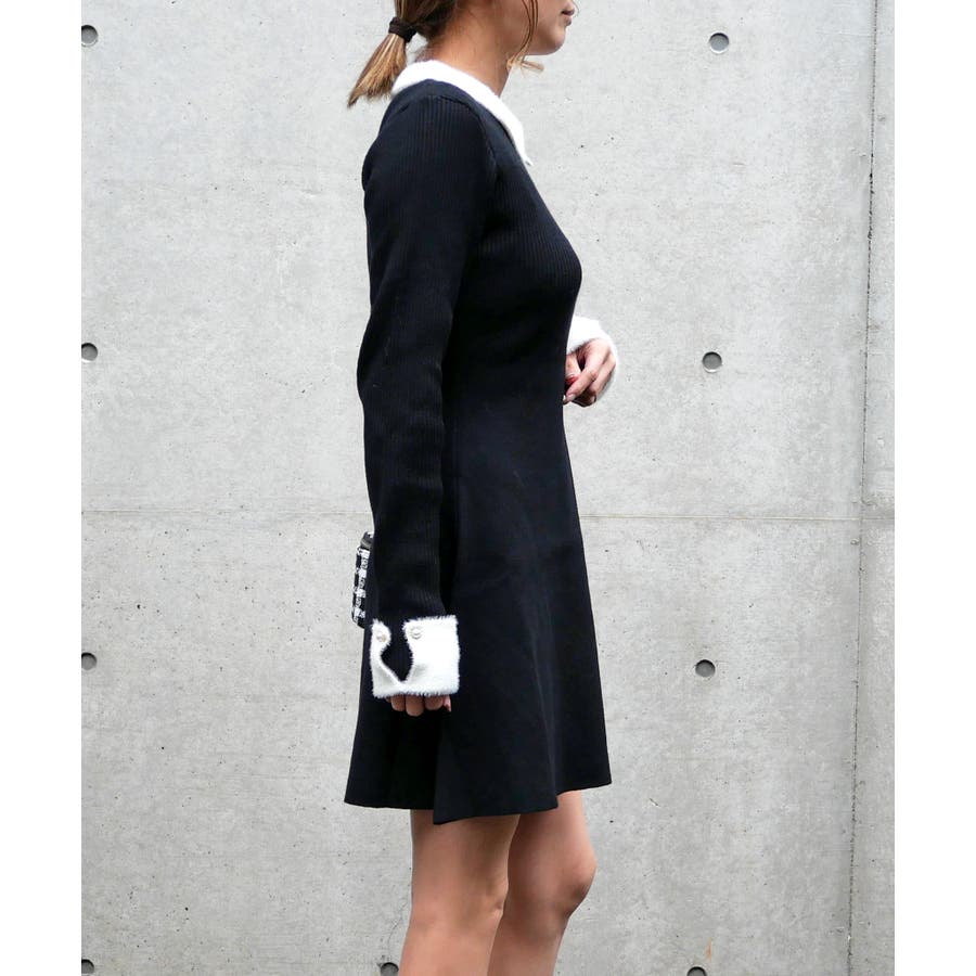 襟と袖口がフェザー素材で切り替えられており、単調になりがちなニットに華やかさと高感をプラス。