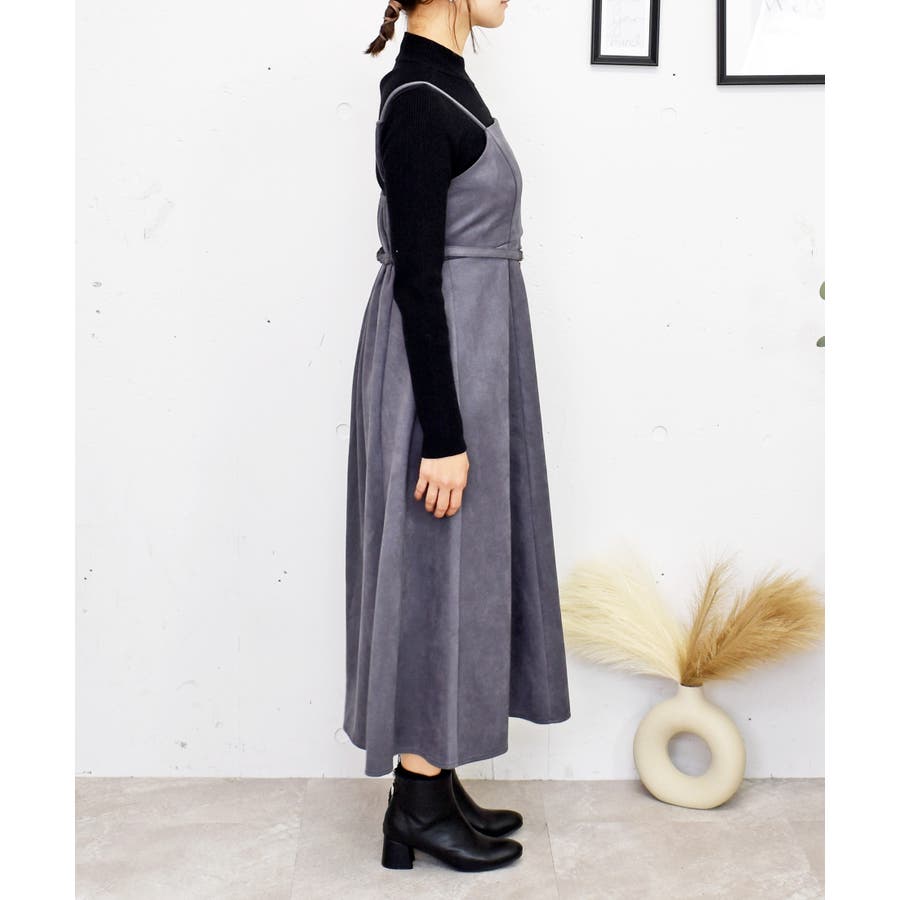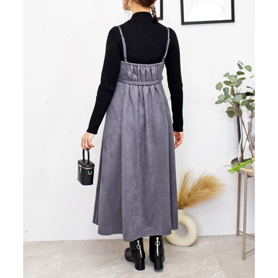 上品な光沢感としなやかな質感が魅力のスエポン素材を使用し、リッチで高見えする印象を与えるキャミワンピース。