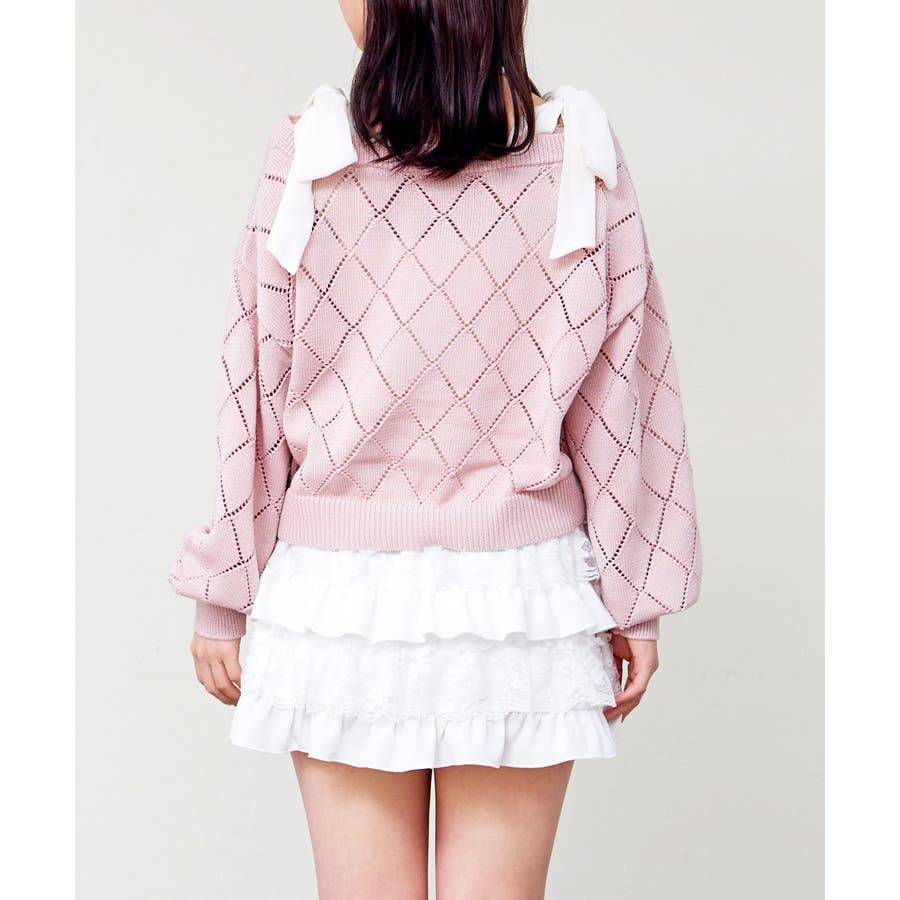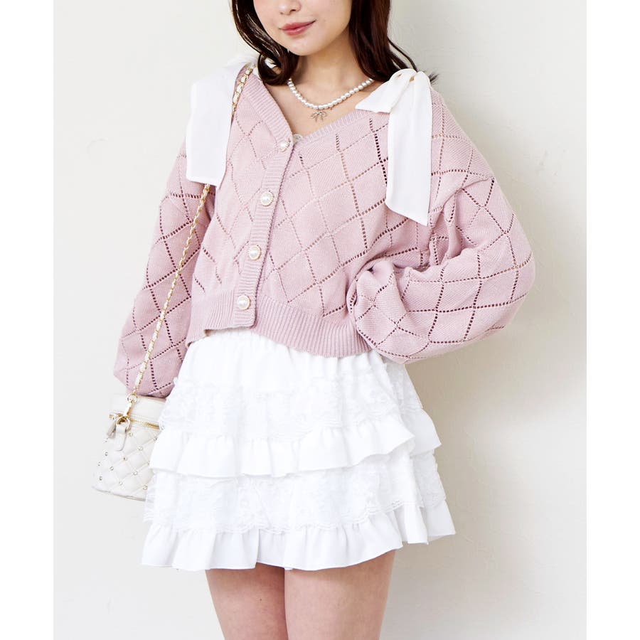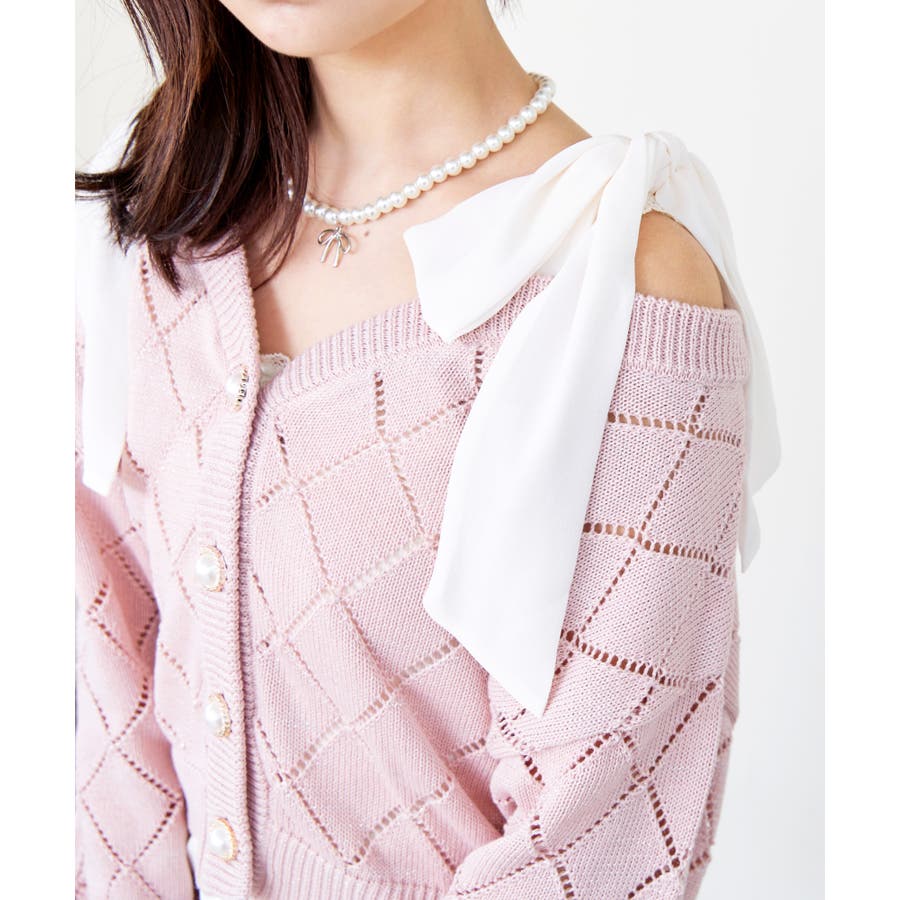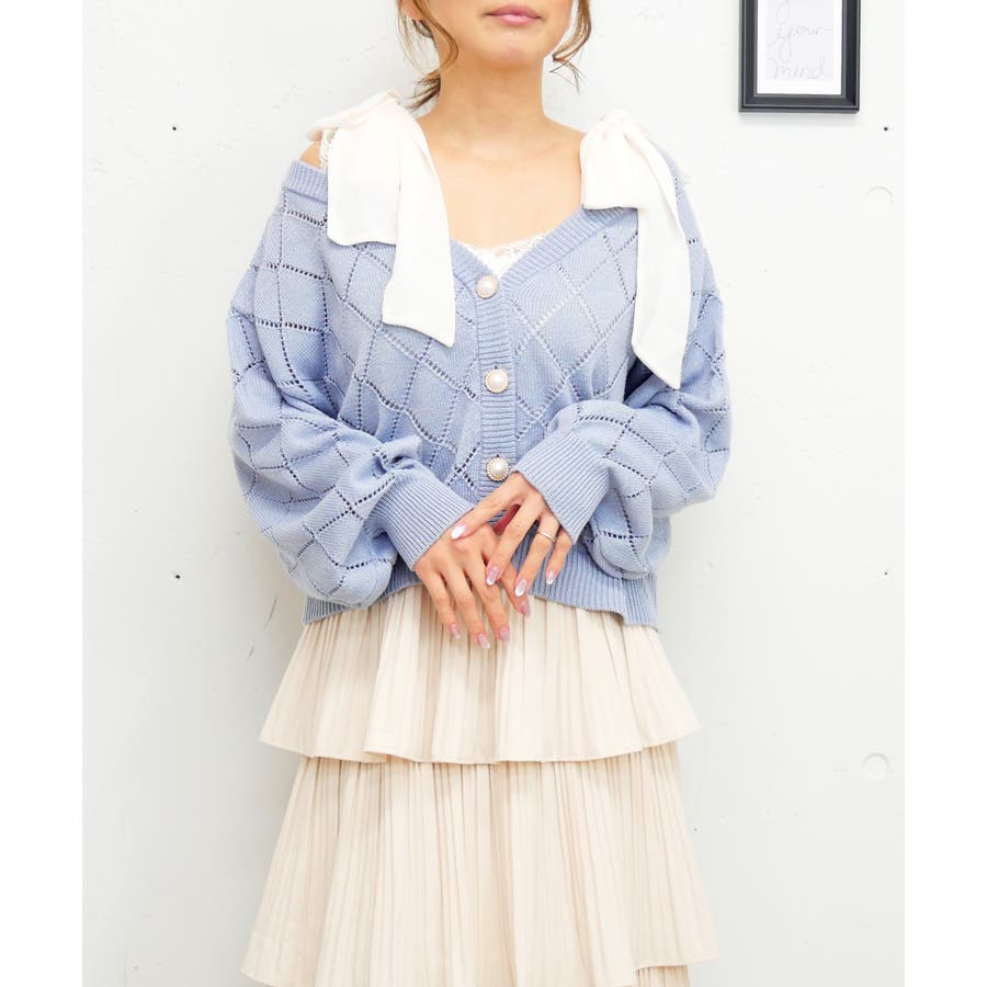 肩の大きなリボンが顔周りを華やかに見せてくれる主役級カーディガン。