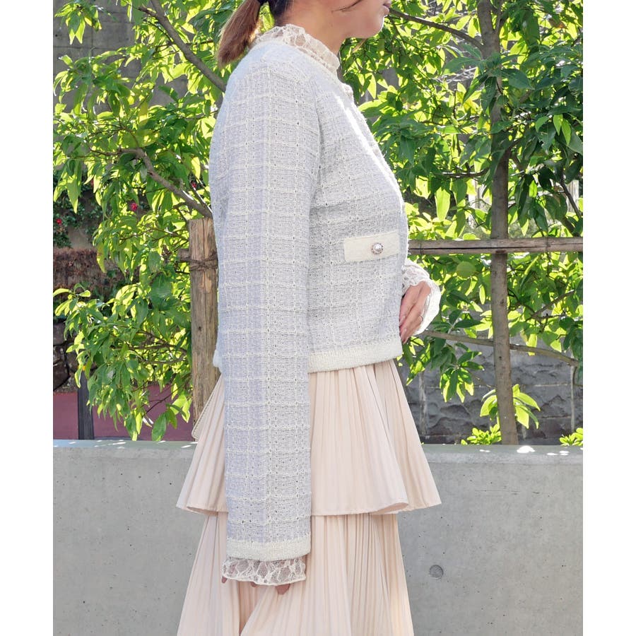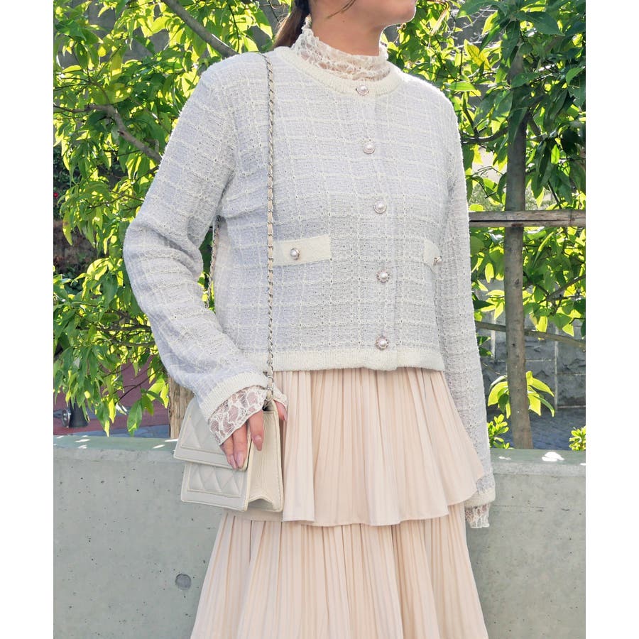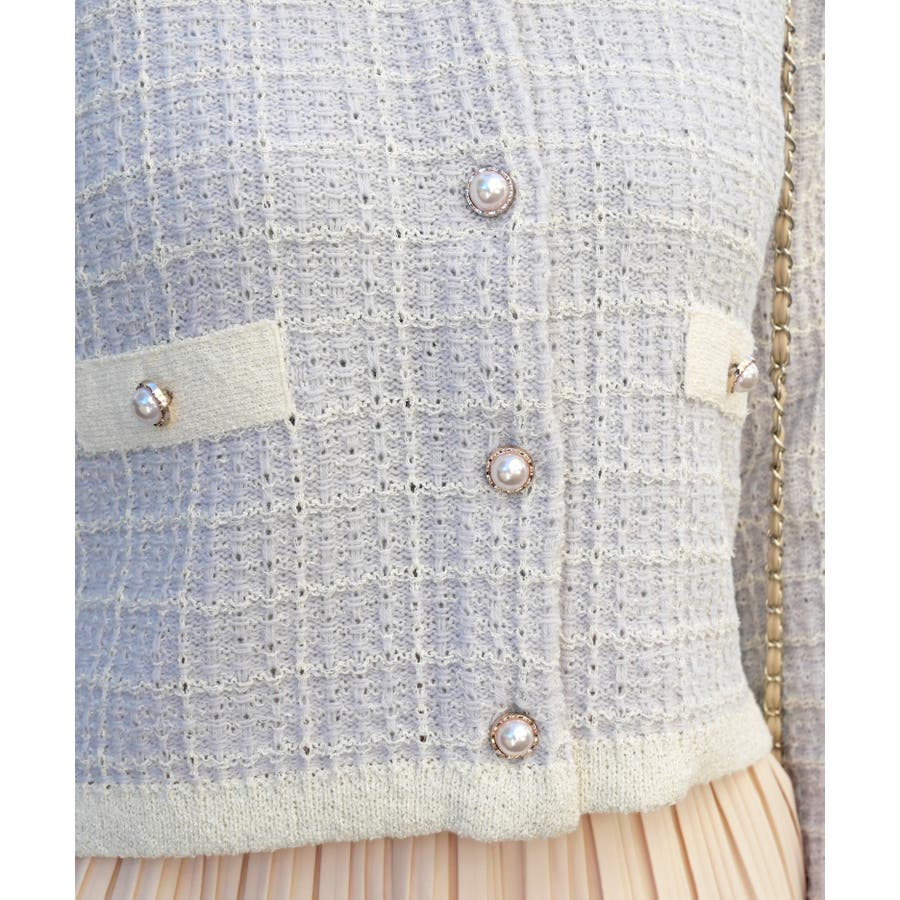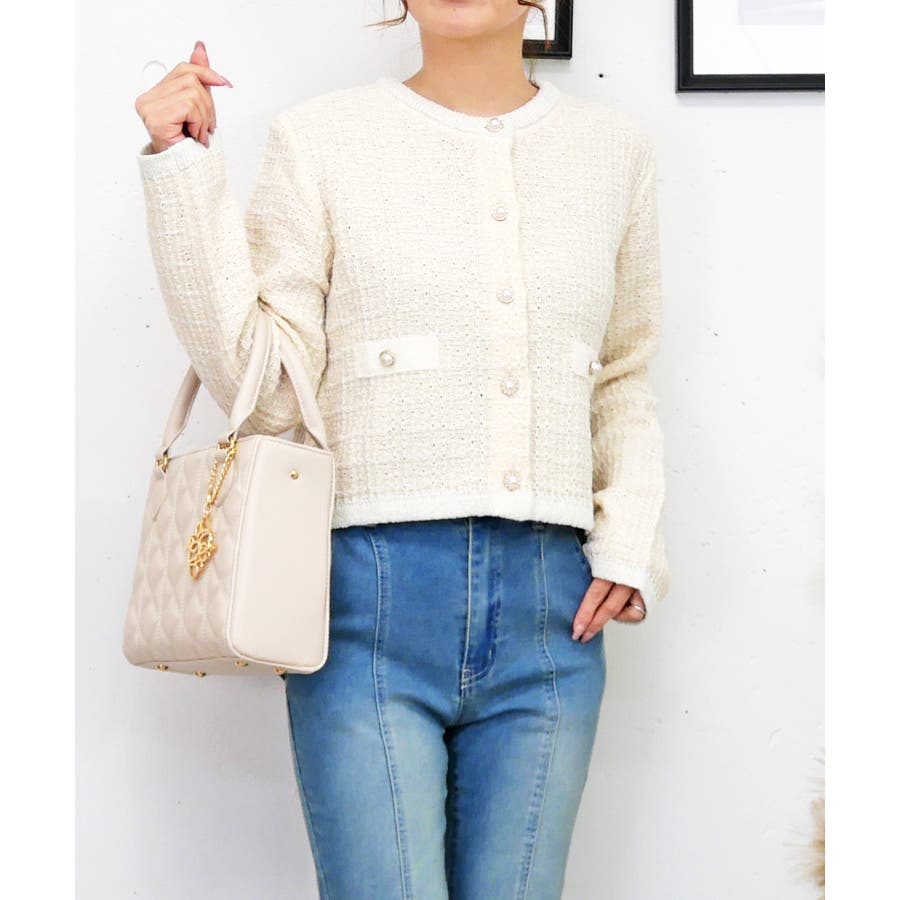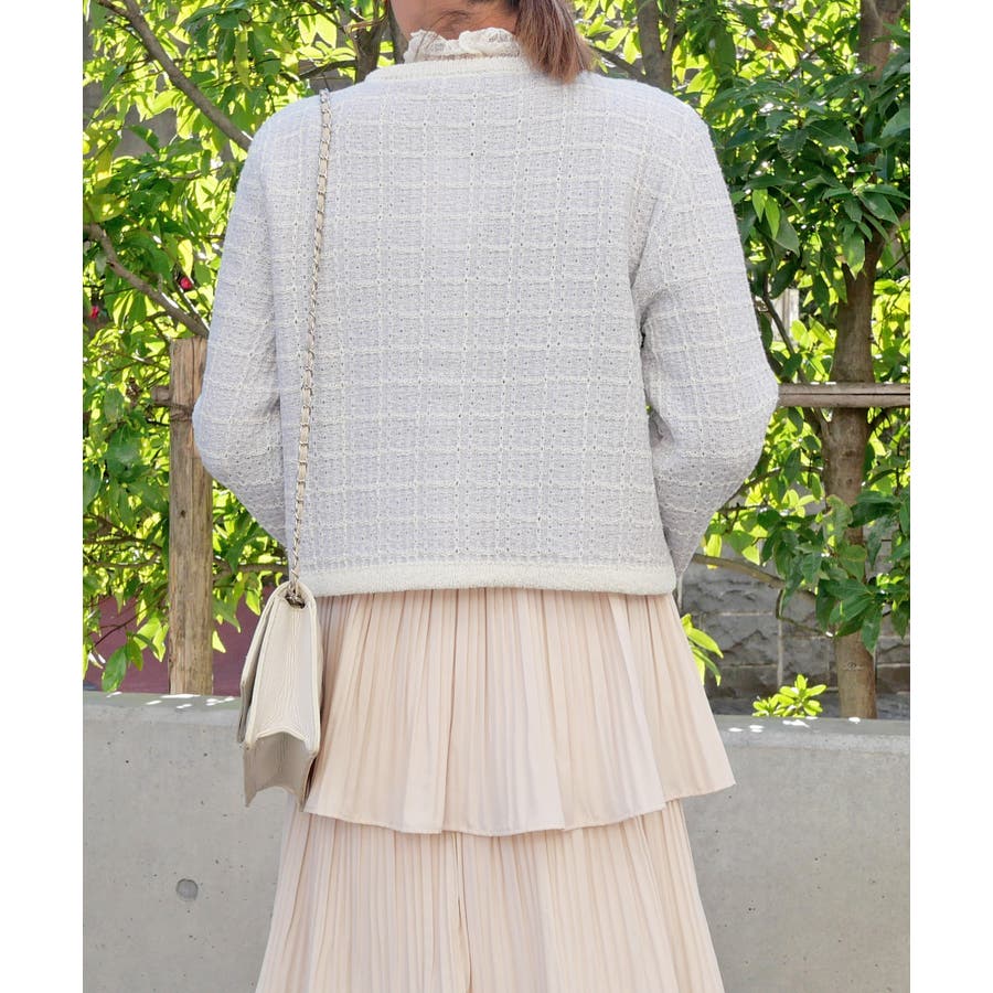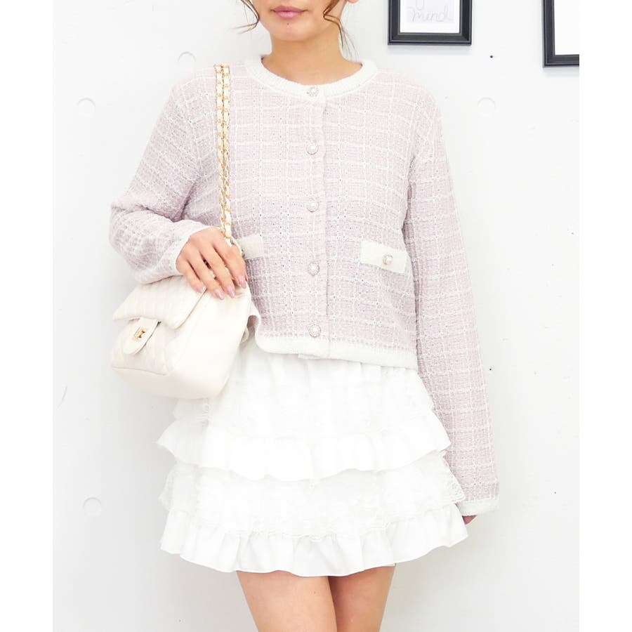 春らしい色味のツイード編みが、清潔感と透明感を演出してくれるラメツイードカーデ。