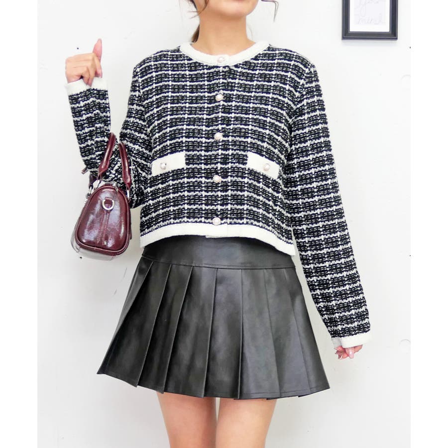 ツイード風の見た目ながらニット素材なので、寒暖差のある春先にもさっと羽織れて実用性も◎