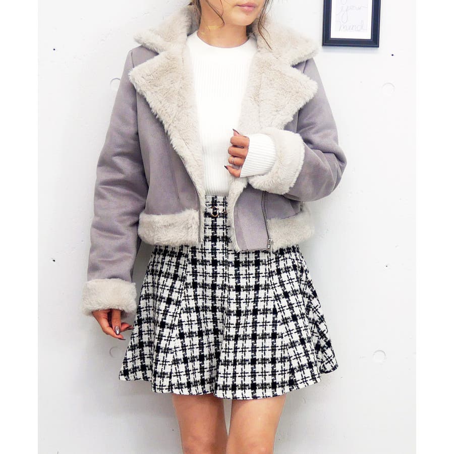 ライダースベースのデザインと、ファーのふんわりした甘さを併せ持つため、スカートやワンピースと合わせるきれいめコーデに活躍します。