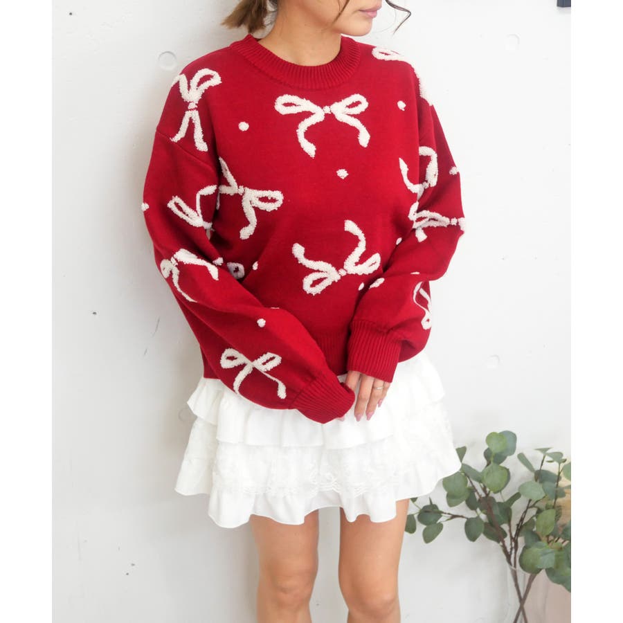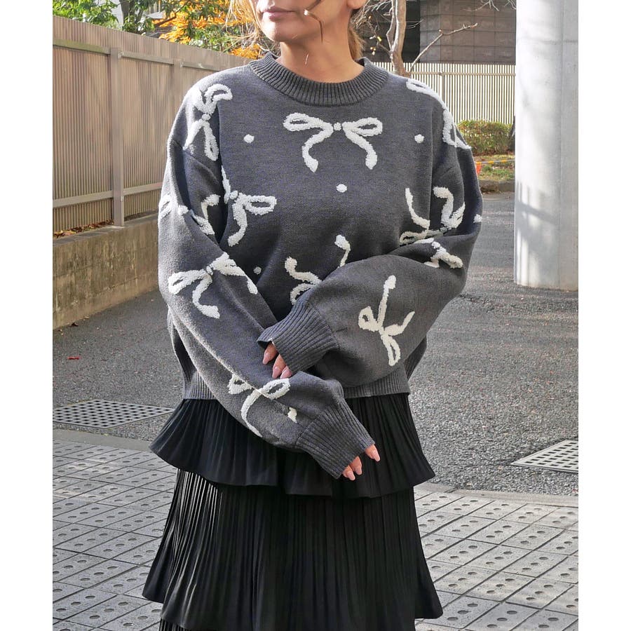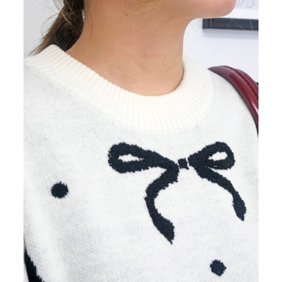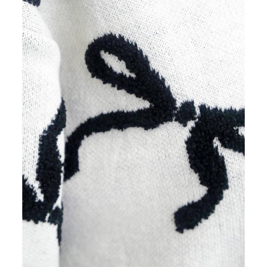 リボン柄部分をパイル編みで仕上げた、ポコポコとした立体感が可愛いジャガードニット。