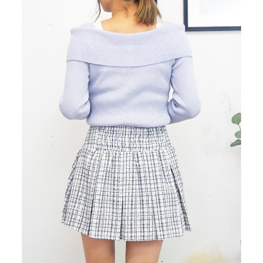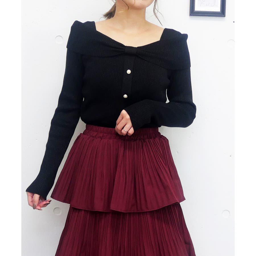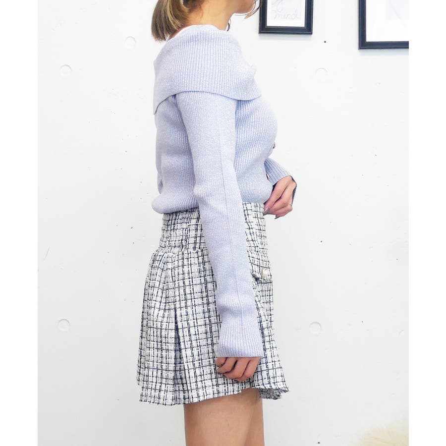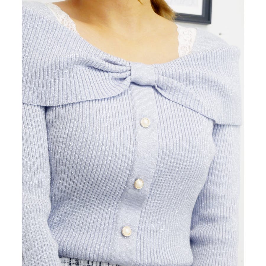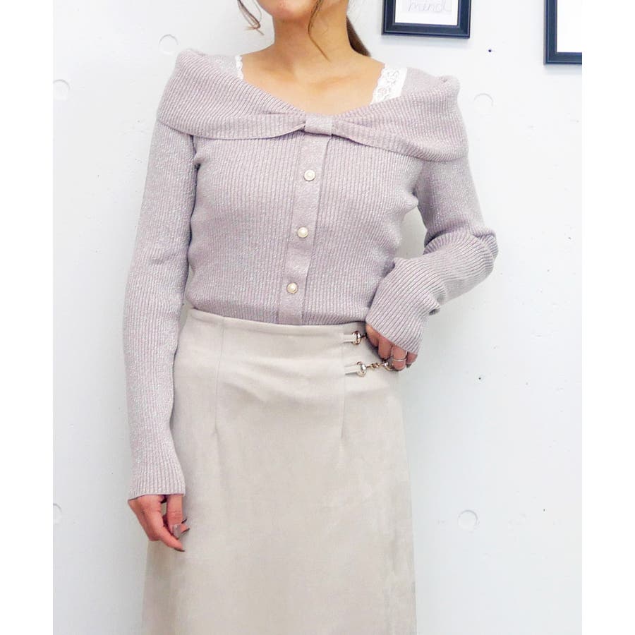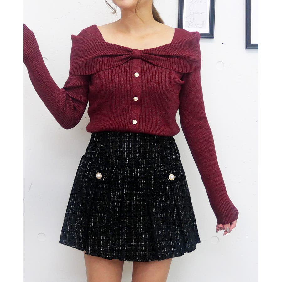 ラメ入りニットやフロントのボタンが上品にきらめき、パーティーやお出かけにもぴったりな華やかさがあります。