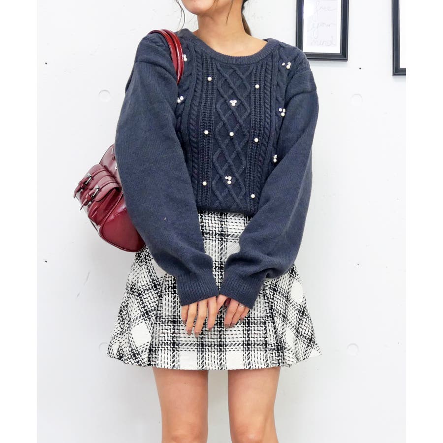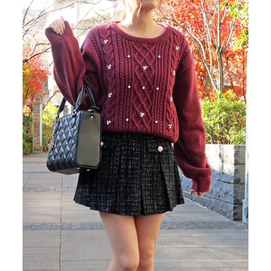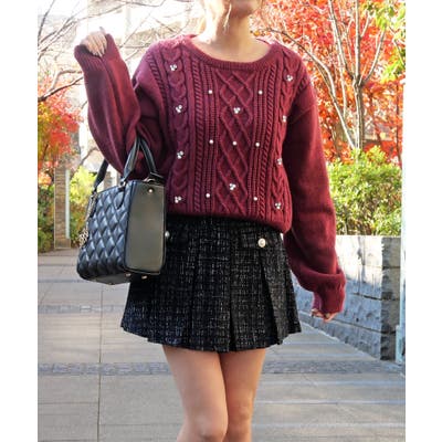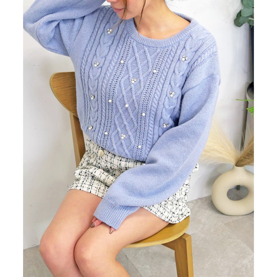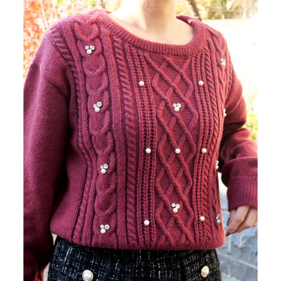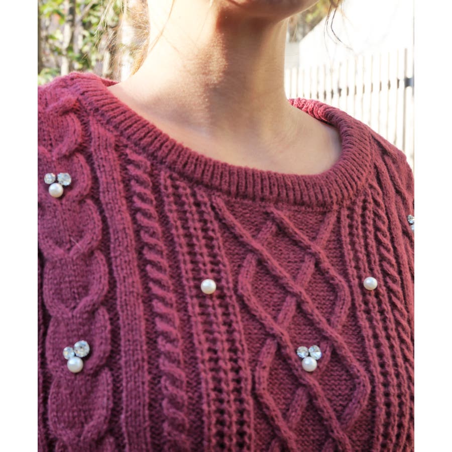 ケーブル編み模様に散りばめられたビジューとパールが、顔周りを明るく華やかに見せてくれるニット。