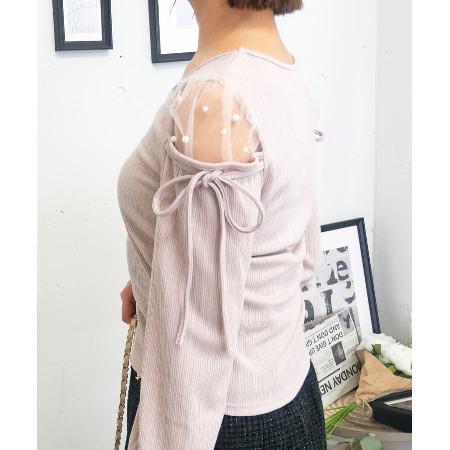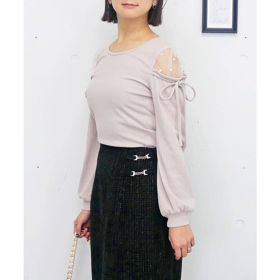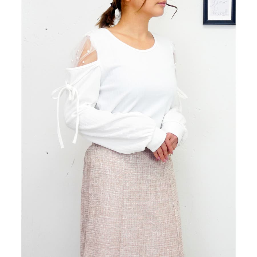 肩のチュールの部分にパールを散りばめて、上品かつガーリーな印象に。