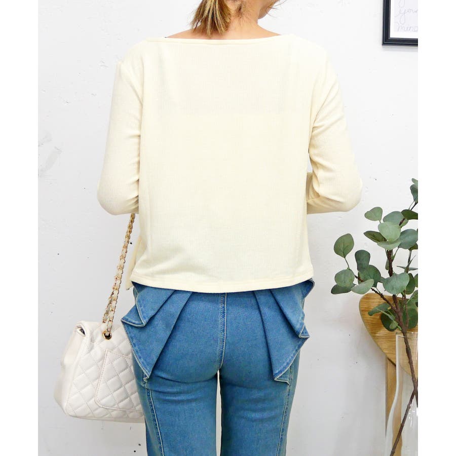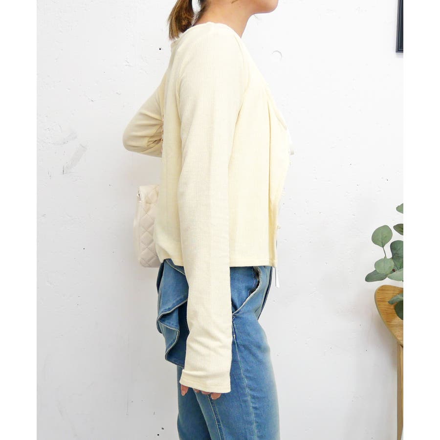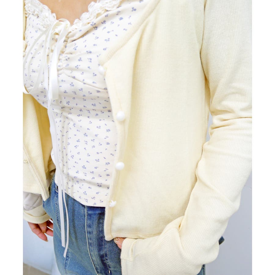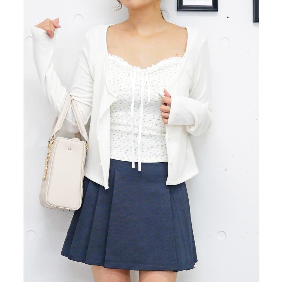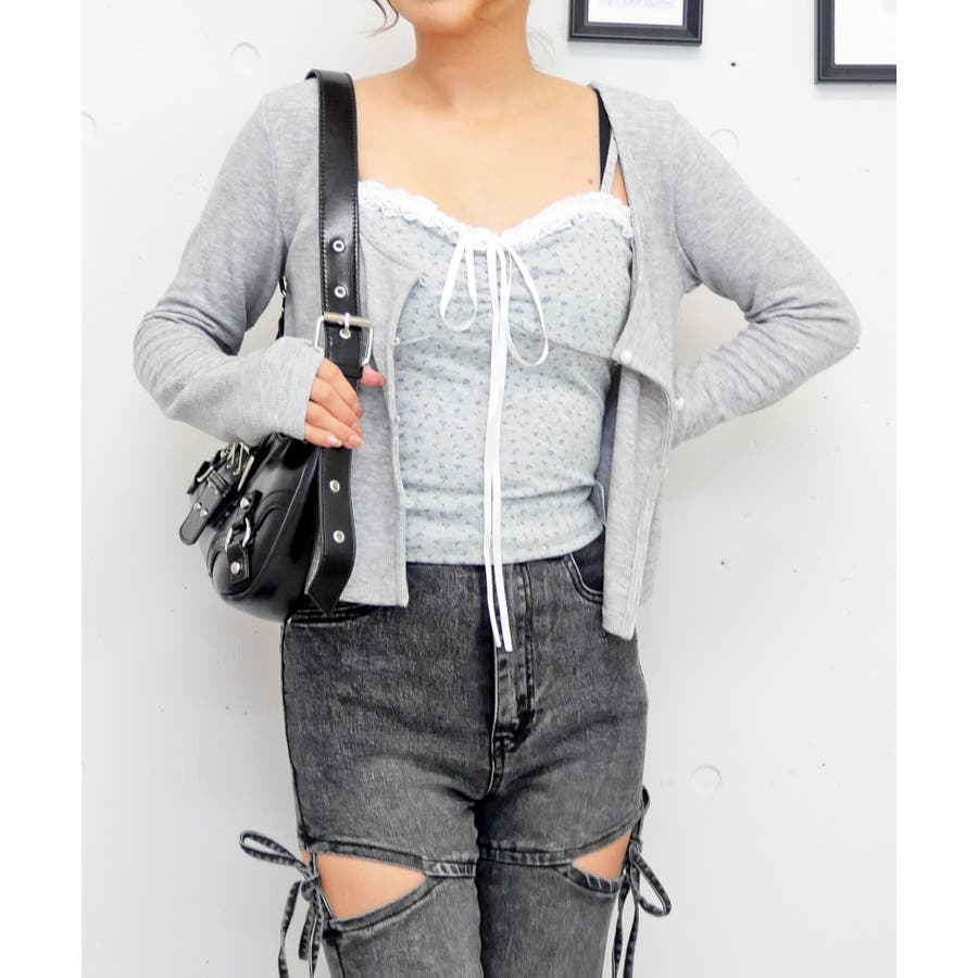 キャミソールの胸元にある長めのリボンが視線を上に集め、スタイルアップ効果を発揮します。