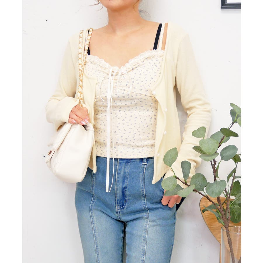 フェミニンな花柄キャミソールと、シンプルで使いやすいカーディガンを組み合わせた、甘くなりすぎずデイリーに使いやすいアンサンブル。