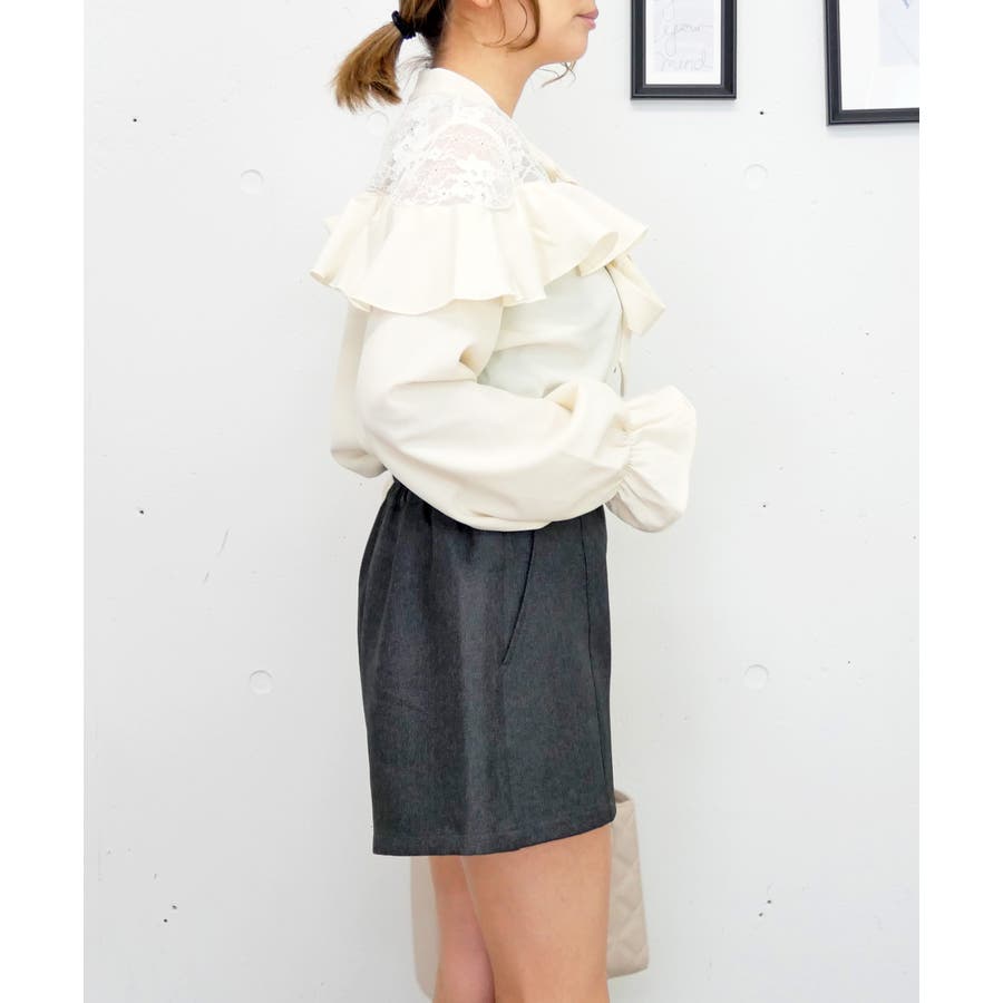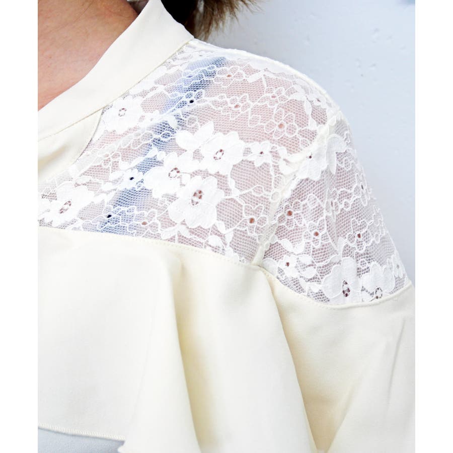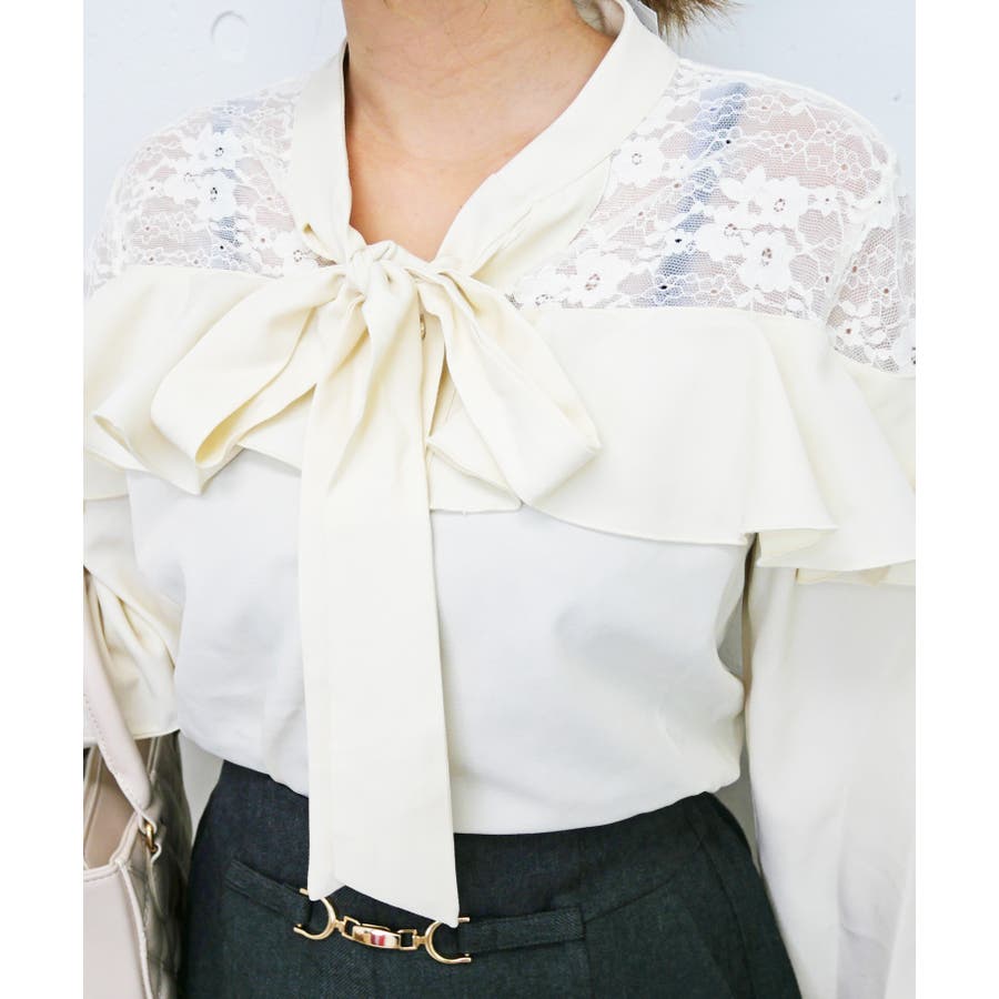 肩のレース切り替えにより肌が程よく透けることで、重たくなりがちなフリルブラウスに抜け感を与え、上品な女性らしさを演出します。