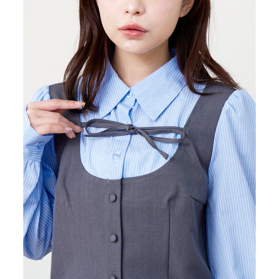 胸元の華奢なリボンタイと、ふんわりとしたパフスリーブが女性らしく可憐でクラシックな印象を与えます。