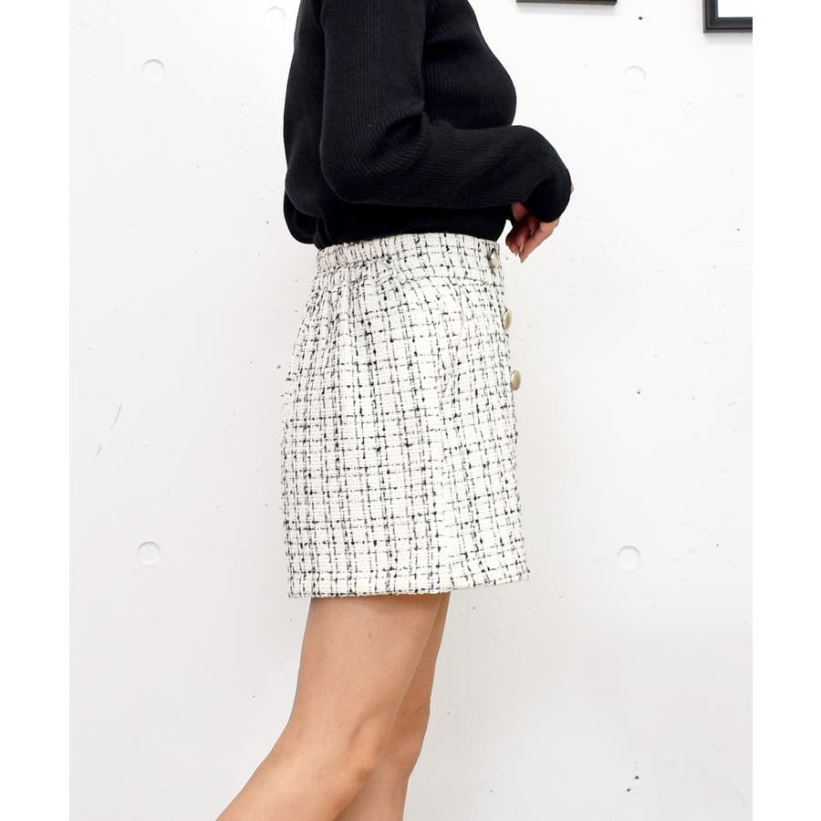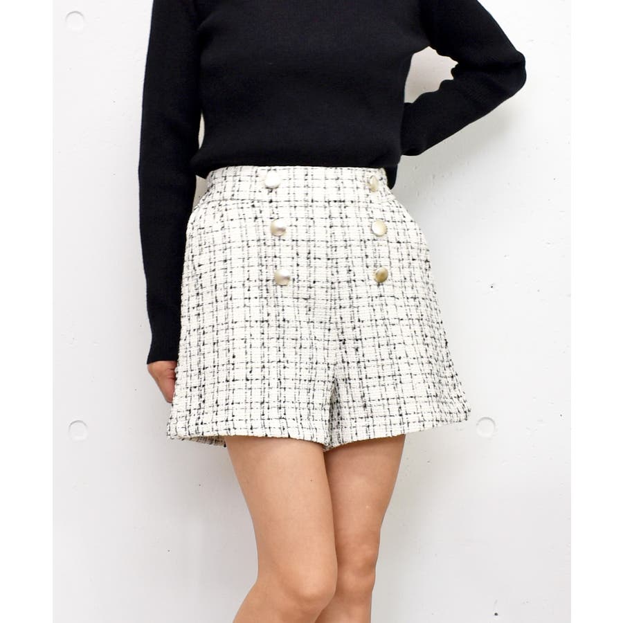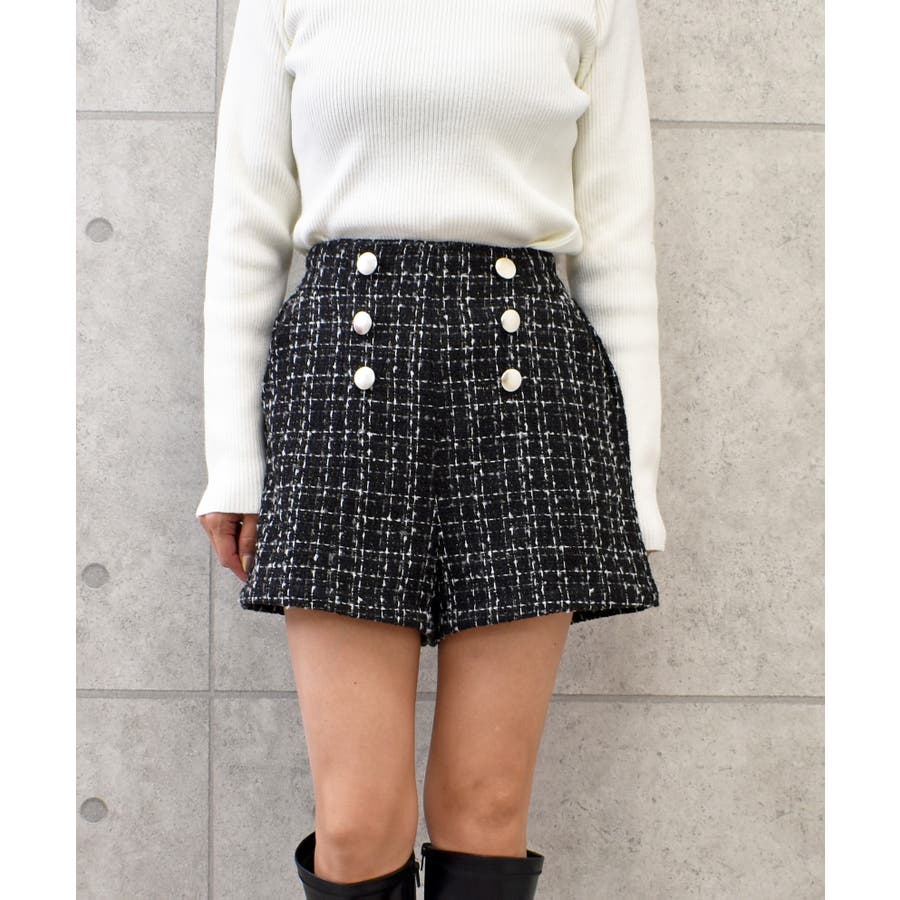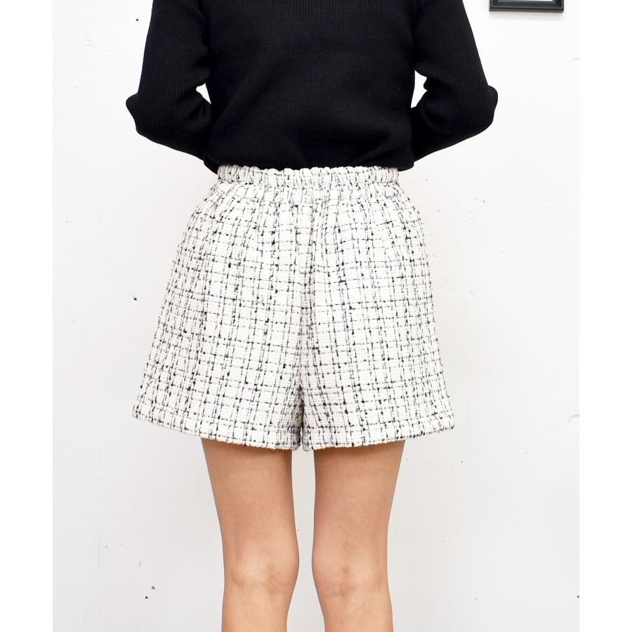 上品なツイード素材がカジュアルすぎず、上品で高見えする印象を与えます。
