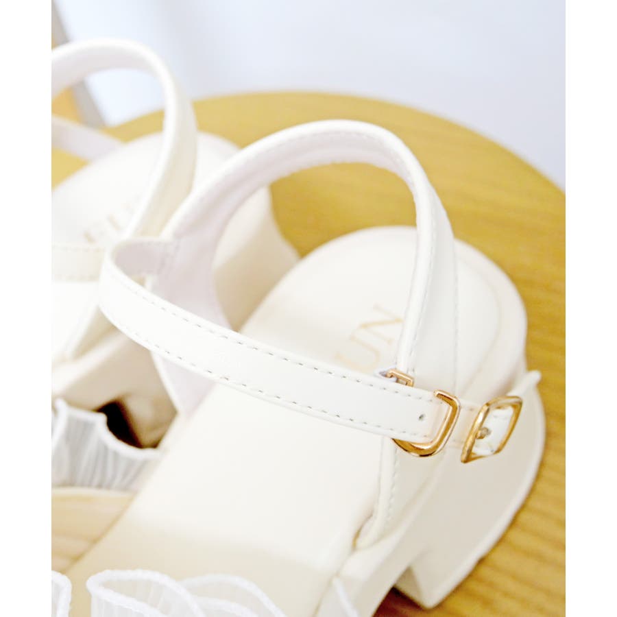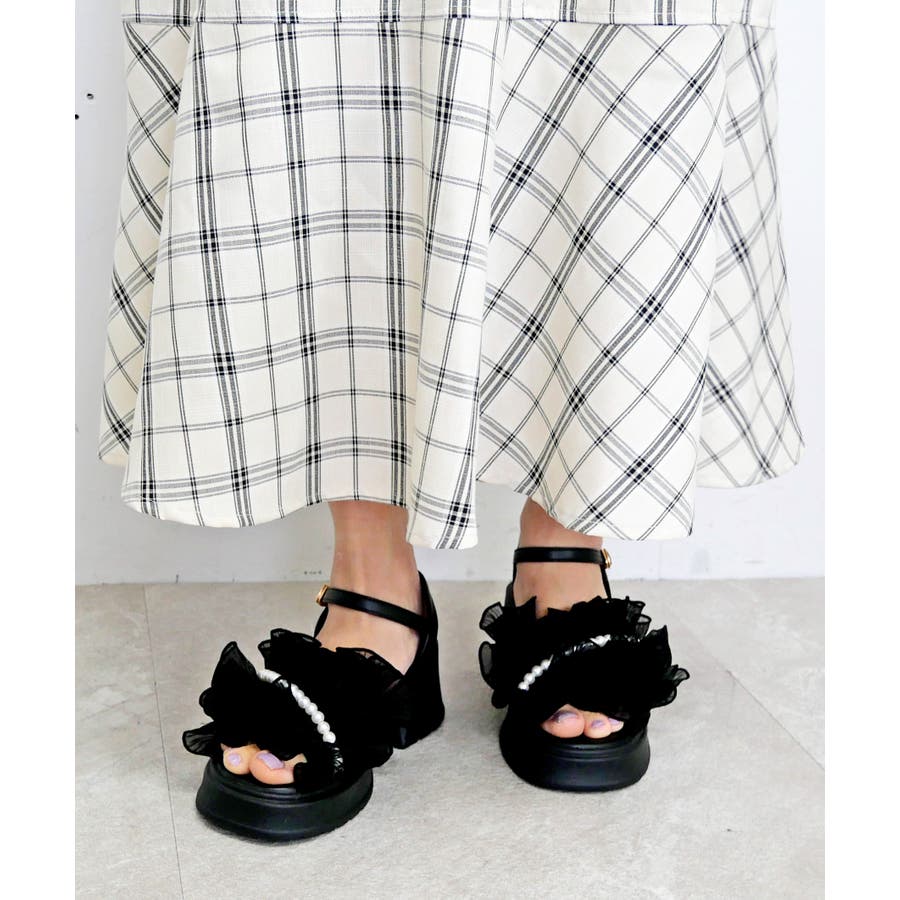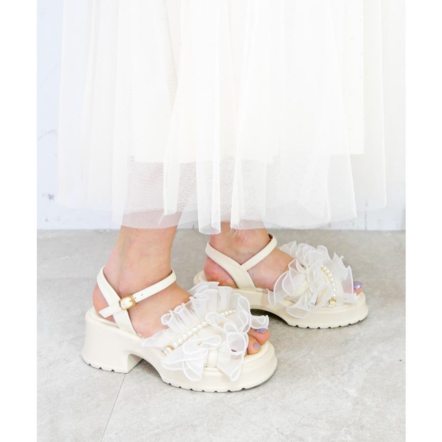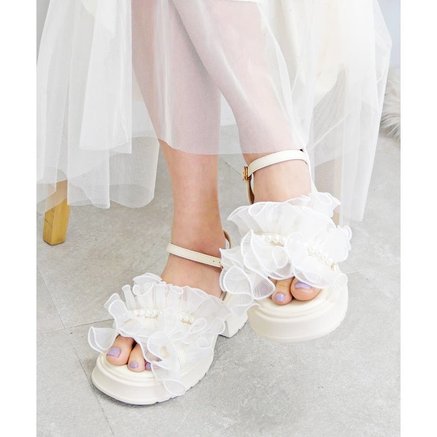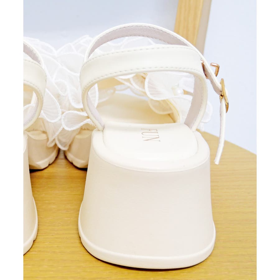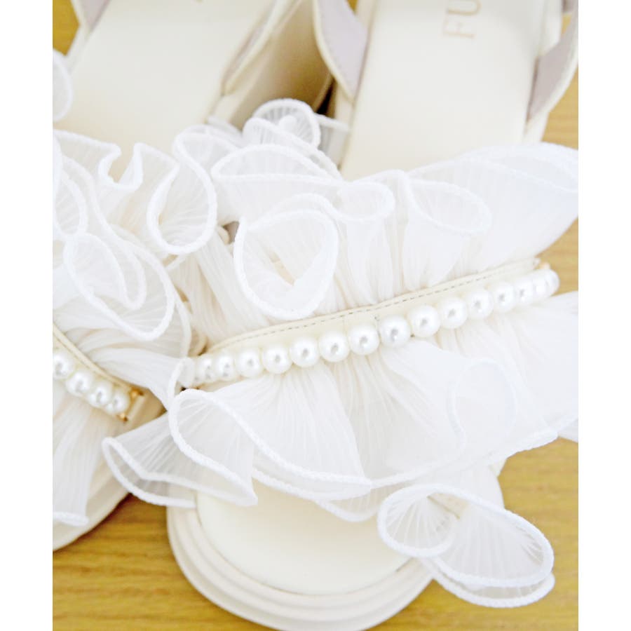 たっぷりのチュールフリルに大粒パールをあしらった、華やかな足元を演出するサンダル。