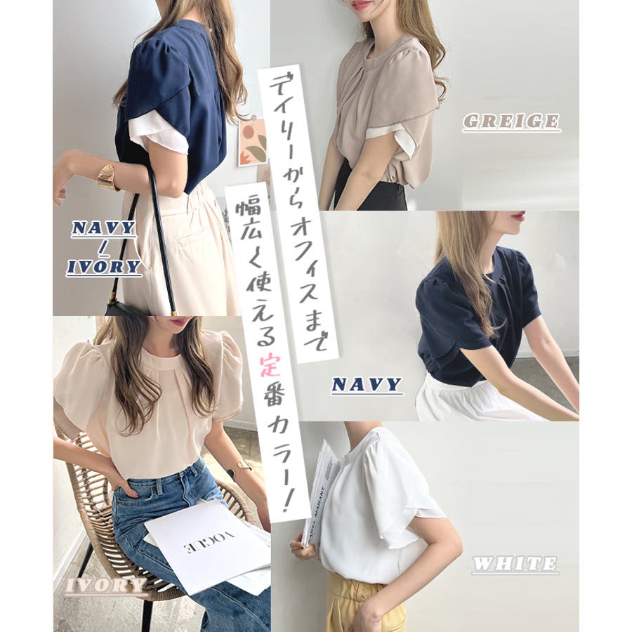 ラクケアシリーズ。チューリップ袖レイヤー風パワショルブラウス