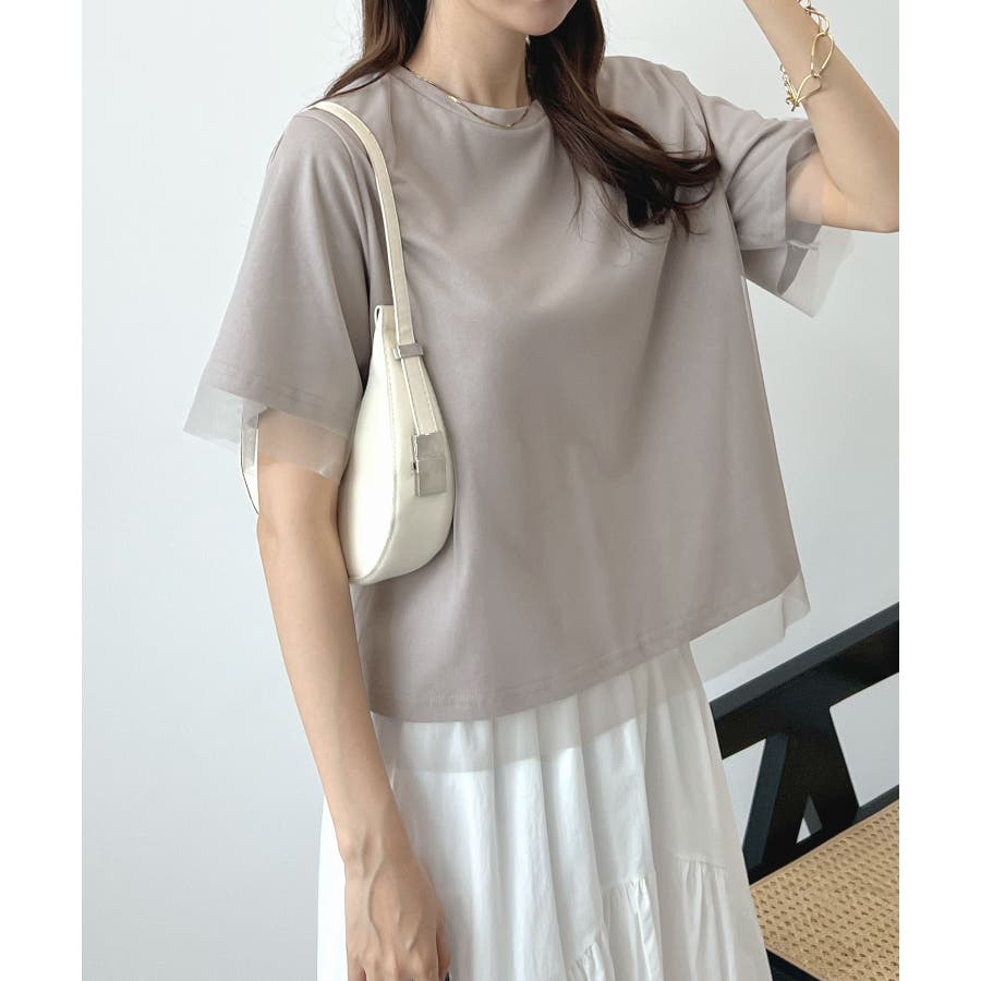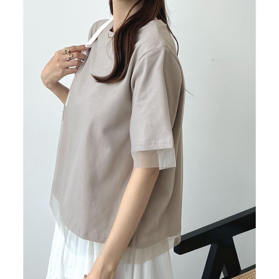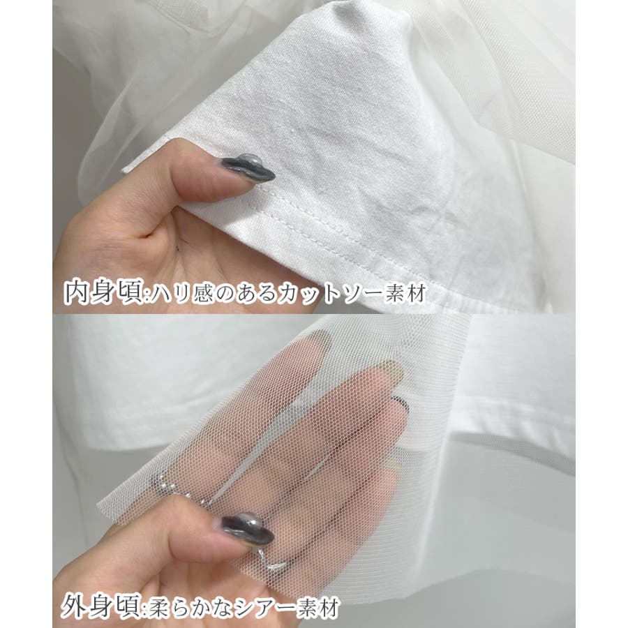 ・チュールの透け感が春らしさを演出する、レイヤード風Tシャツ。