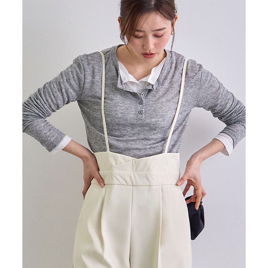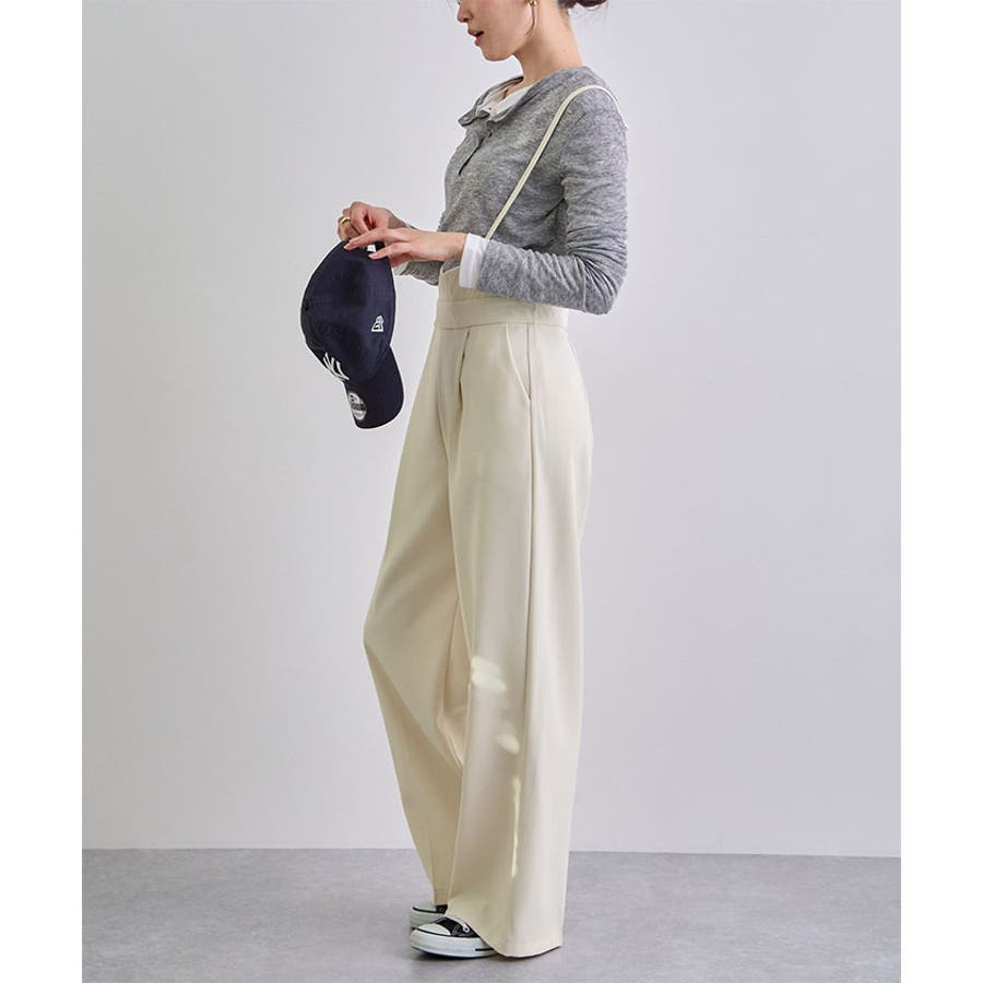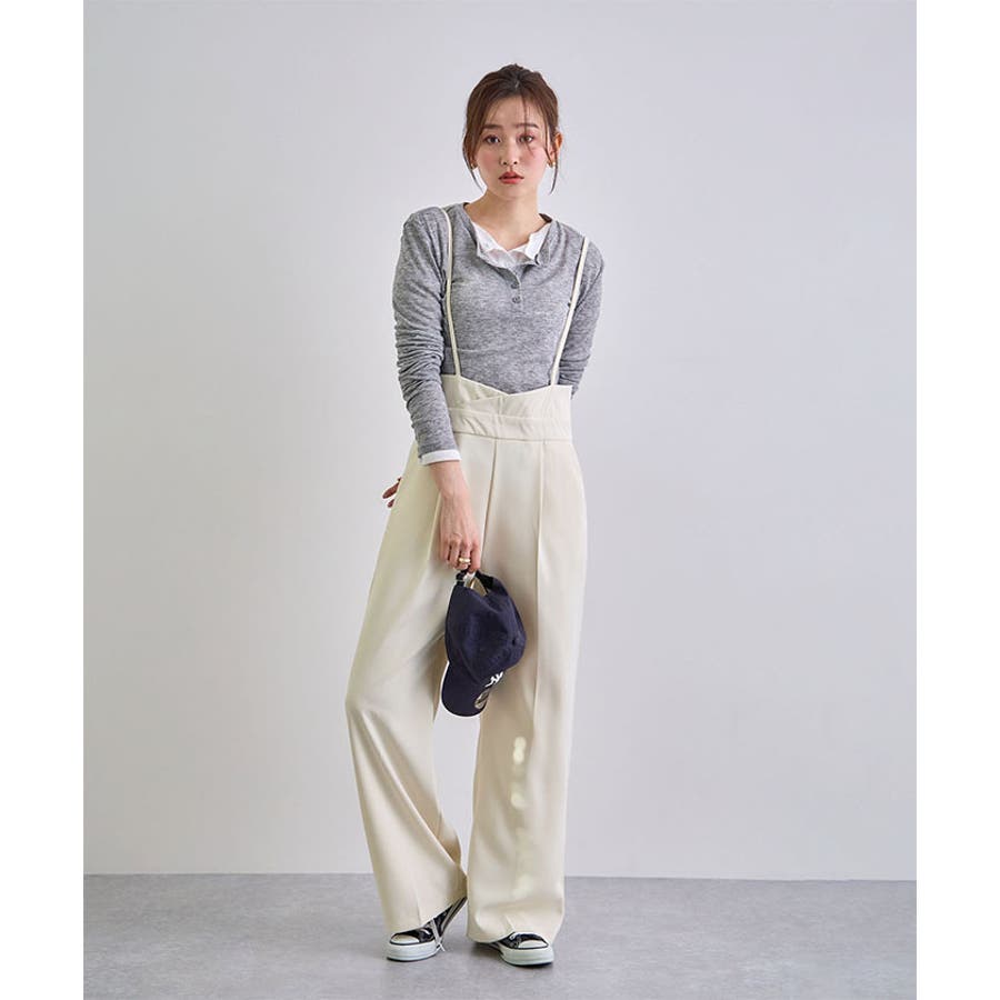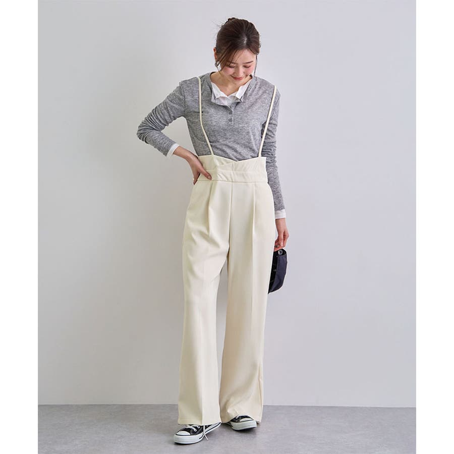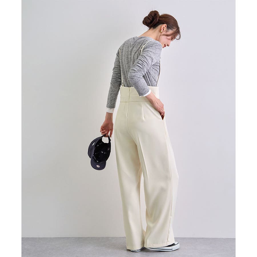ハイウエストの位置でシェイプさせて、お腹まわりをすっきりと見せつつ、パンツ部分はタックを入れたワイドシルエットでリラックスした仕上がりに。