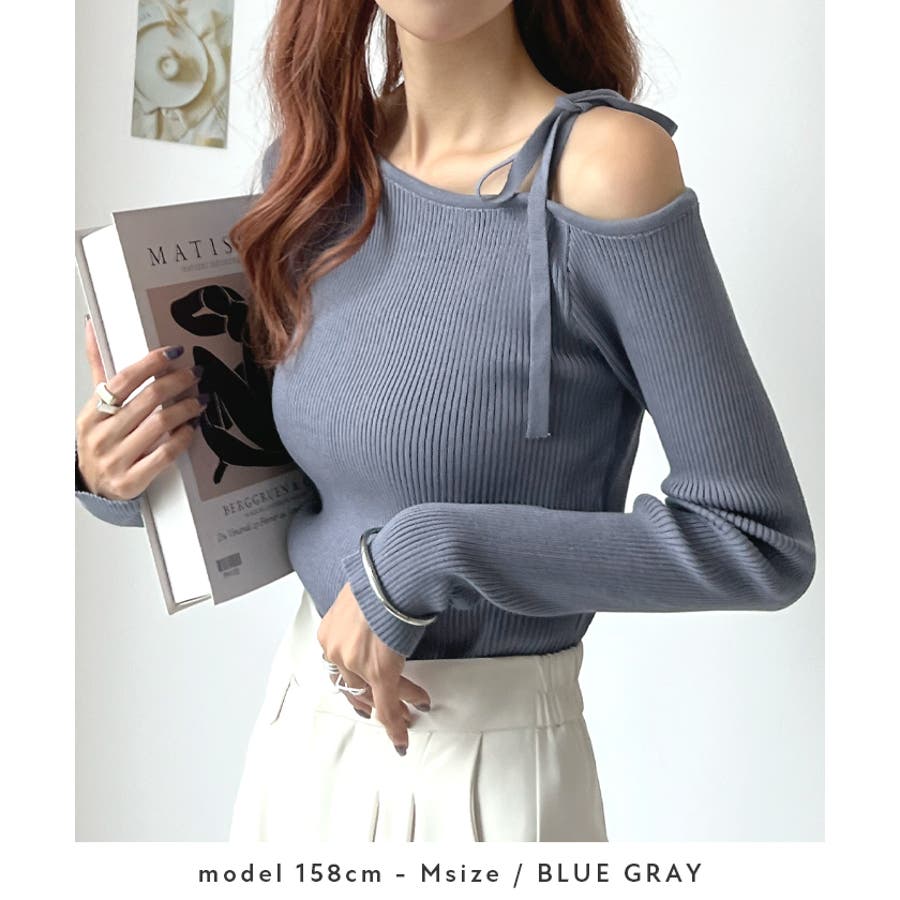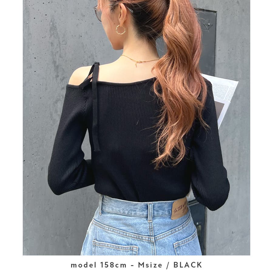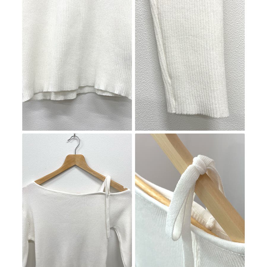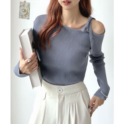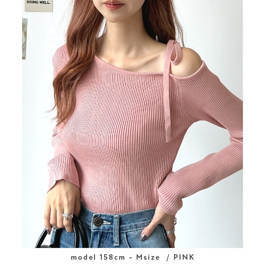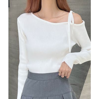 オトナリボンかわいい。ショルダーリボンリブニットトップス