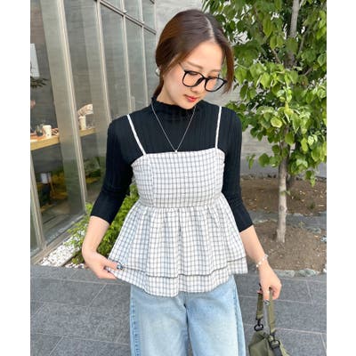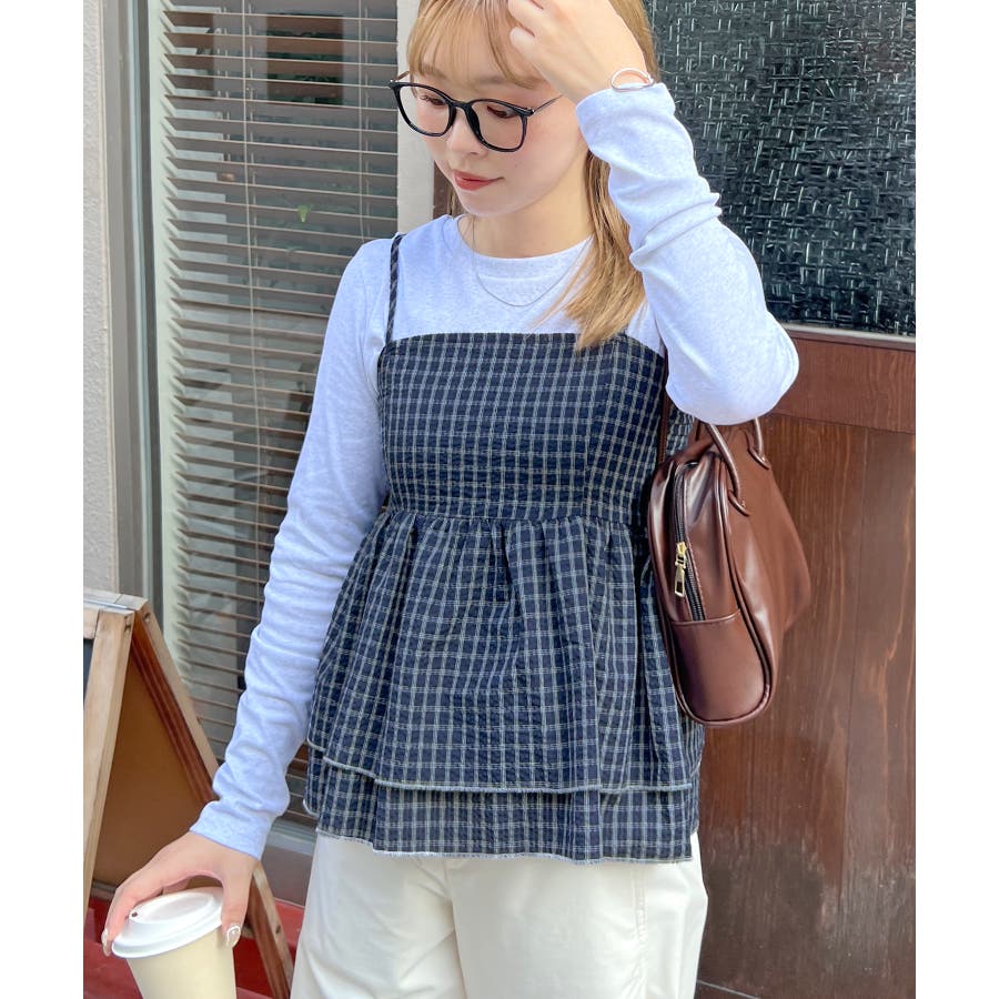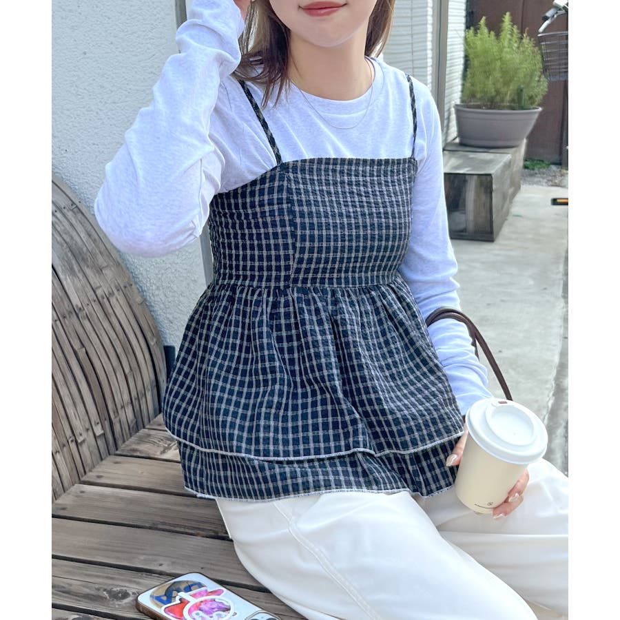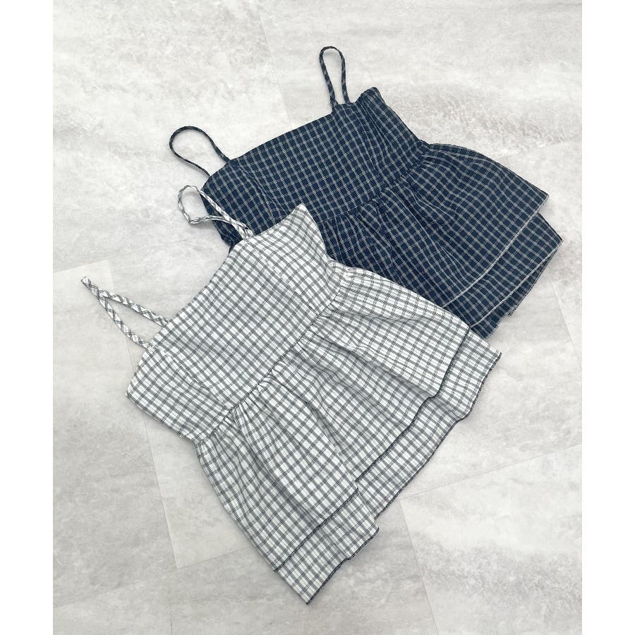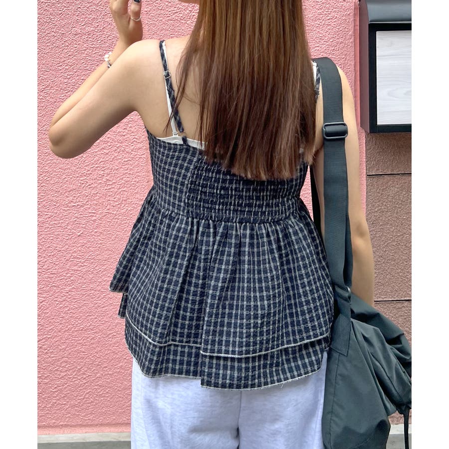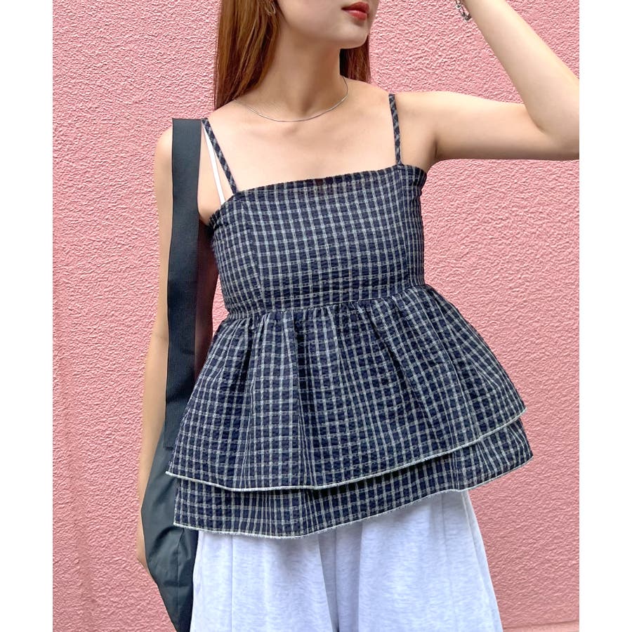 2段フリル×チェックで大人可愛い主役トップス。チェックキャミビスチェ