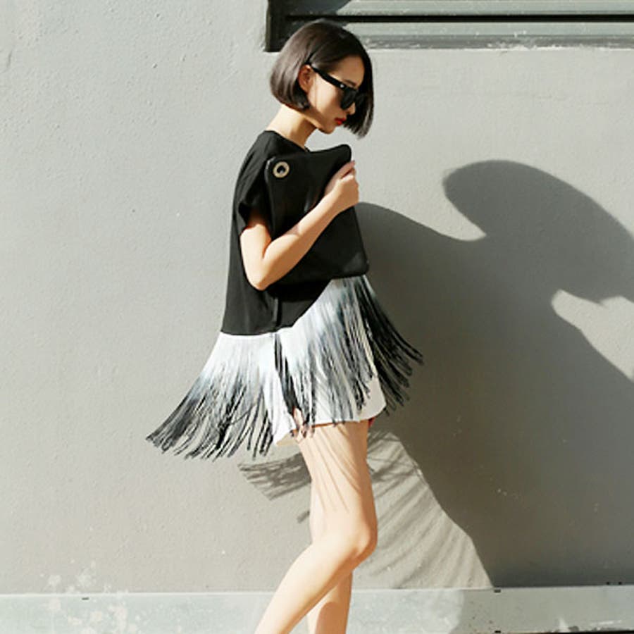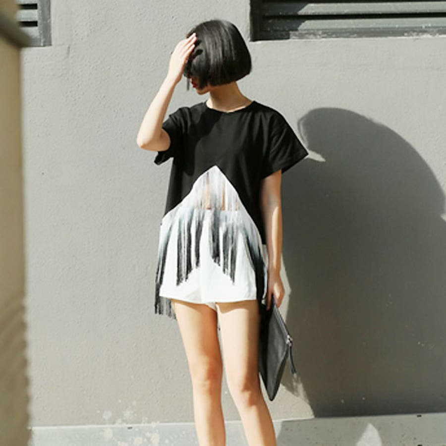 ボヘミアンなムードが溢れる裾フリンジのTシャツです☆!!ボリュームとさらさらしたフリンジが女性らしさを演出♪今季トレンドのボヘミアンスタイルになれちゃいます♪^^フロントがVラインにデザインされていて、体型がすっきりと見えるのもオススメポイントです☆!!!※裾のフリンジをきれいに保つために仕付け糸がついている場合がありますので、お手数ですが、外してお使いください。