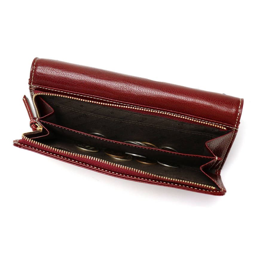 収納部は3層になっており、お札の種別管理や、領収書なども分けて収納できる設計。両サイドがジャバラマチになっているので、大きく開き、パッと見渡せる、視認性に優れた設計となっています。背面側に備わった小銭入れは、硬貨の種別管理が行える仕切り付き。内蔵されているポケットやカードに、頻繁に使用するカードやクーポンを保管しておけるのも魅力的です。