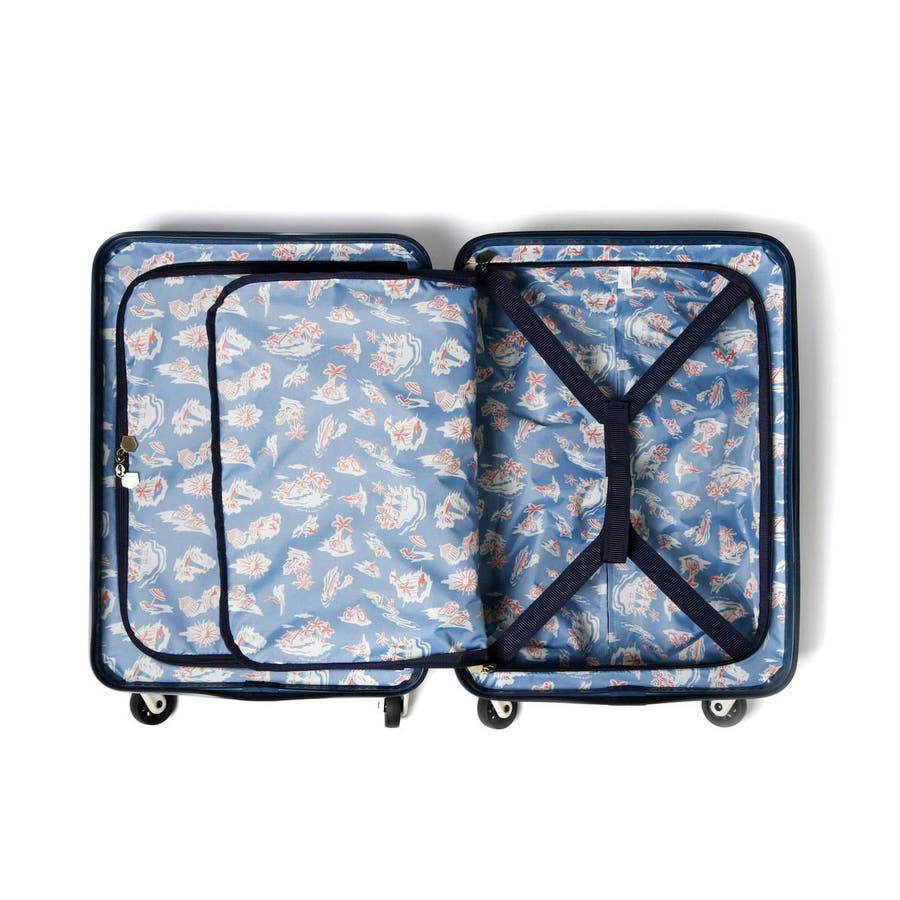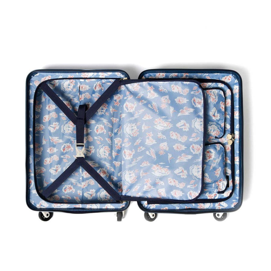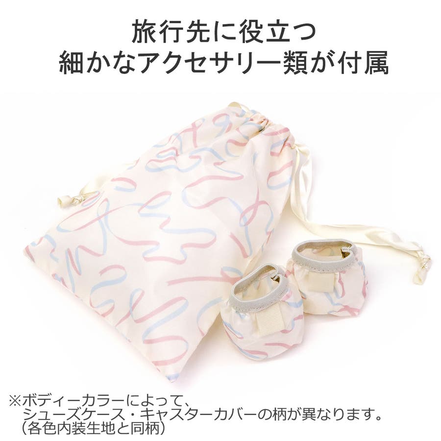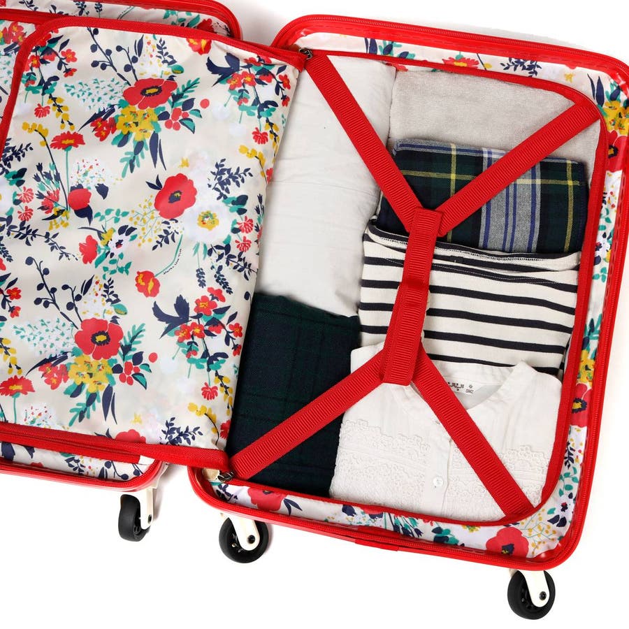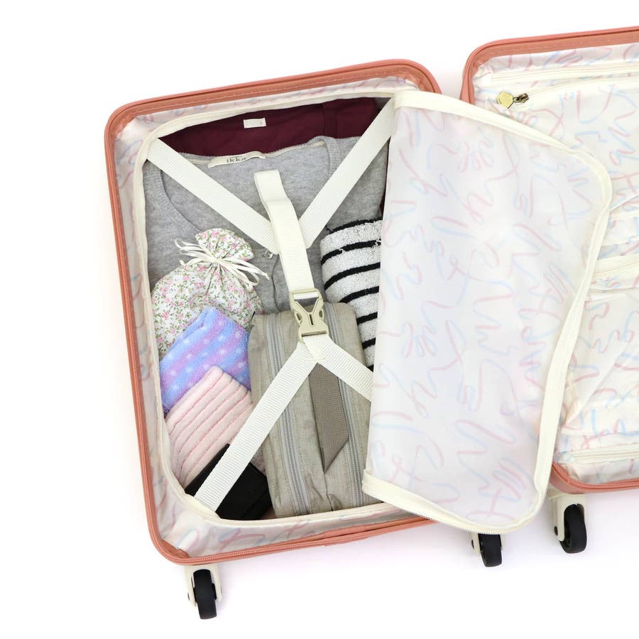 33L容量の収納部は、1~2泊程度の旅行にぴったり。可愛いだけでなく機能的で使い勝手に優れたつくりが魅力です。開けた際に荷物が見えないだけでなく、荷崩れを防ぐ仕切りやベルトを備え、小物類をたっぷり収納できるマチ付きのジップポケットも備えています。