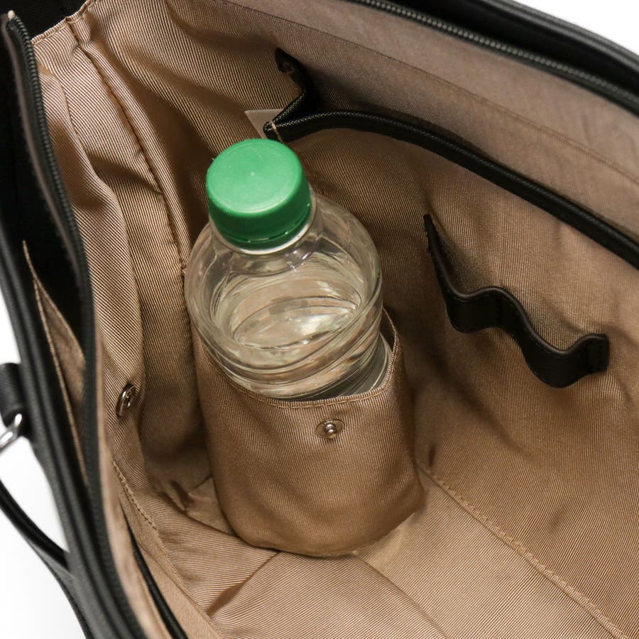 収納部には、A4用紙が折り曲がらず収納可能なクッション材入りのポケットを内蔵しており、大切な書類の管理も安心。ペットボトルや折りたたみ傘がしまえるホルダーは、使用しない際はスナップボタンで簡単に留めておくことが可能です。さらに、スマートフォンなどの小物を素早く出し入れできる口元のあおりポケットを設けることで、移動中でも扱いやすいデザインになっているのもポイントです。