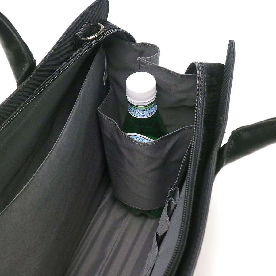 A4サイズの本体には、バッグの中で散らばりがちなビジネス小物をすっきり収納できるオーガナイザーポケットを装備。片面にクッション性のある素材を使用した背面側のポケットは、ケースに入れたPCなどの管理に役立ちます。さらに、ペットボトルや折りたたみ傘を立てて管理できる便利なホルダーを設けているなど、バッグの中の整理整頓に配慮された設計が魅力的です。本体の背面部分には、マグネット付きのアウトポケットを設けており、移動時に荷物をスムーズに取り出せる機能的なデザインになっています。