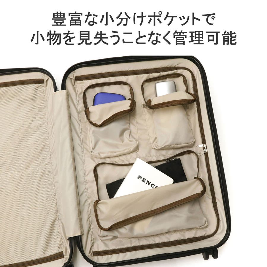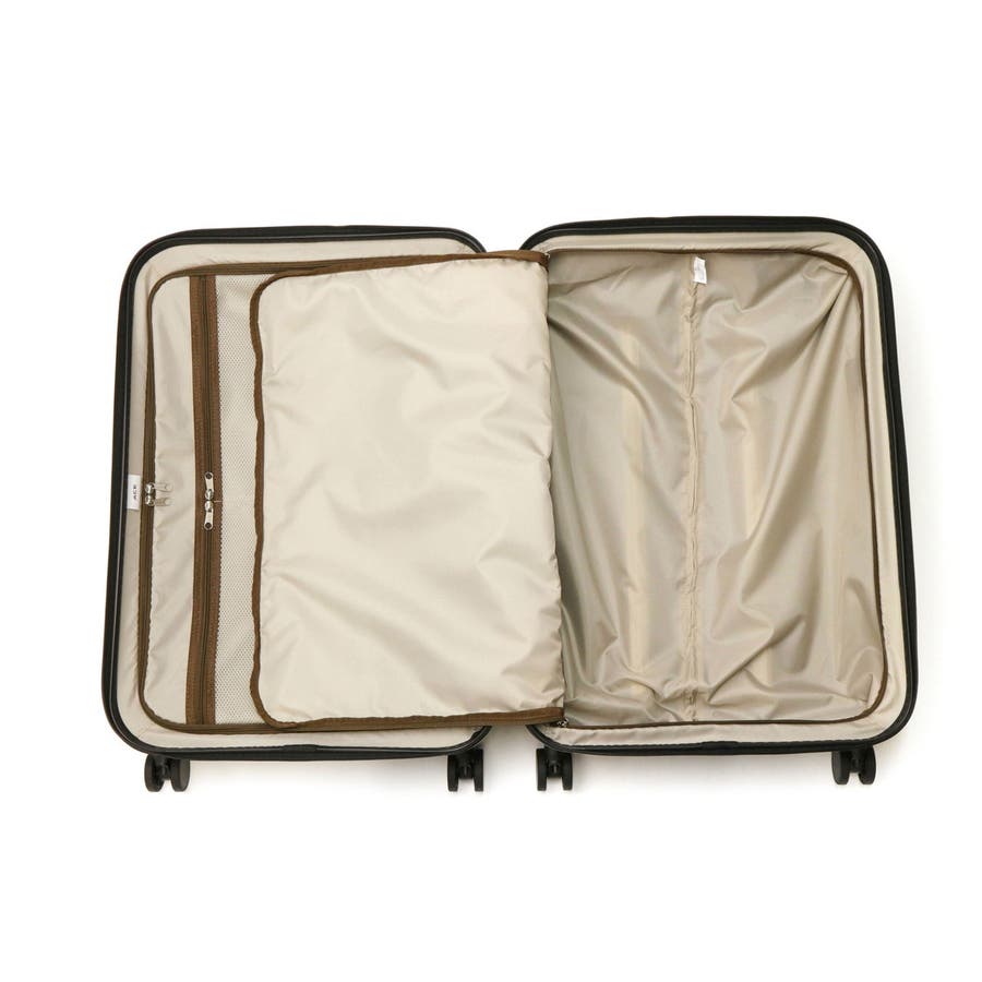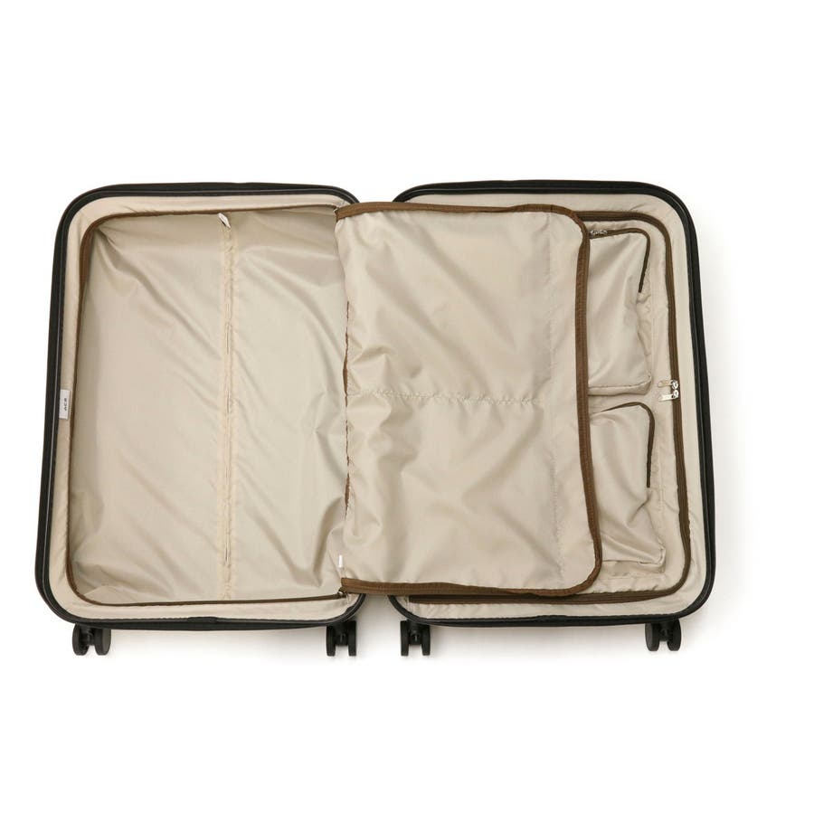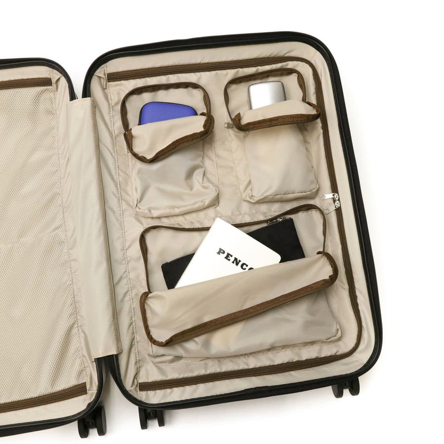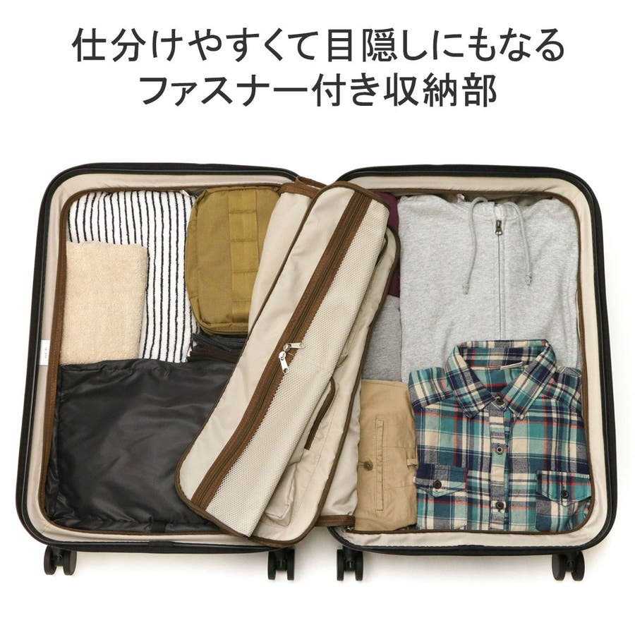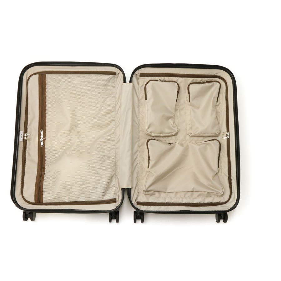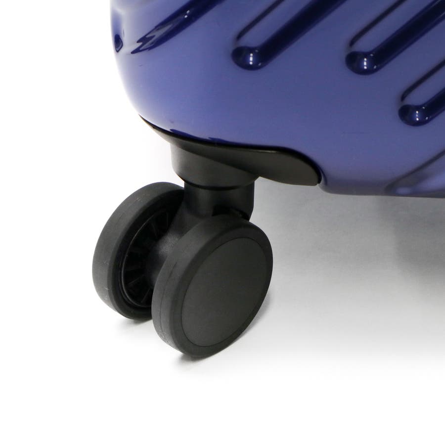 内装の収納部分は両側コの字ファスナーで中身が見えず安心してお使いいただけます。大容量のスーツケースの中では見失いがちな細かなアイテムの収納に役立つ仕分けポケットを豊富に備え、荷物を見失う心配がないのも使いやすさのポイントです。キャスターは旋回性に優れた双輪仕様で、快適に移動を行うことが可能。サイドにはグライドが付いており、気兼ねなく横置きすることができるのも魅力となっています。