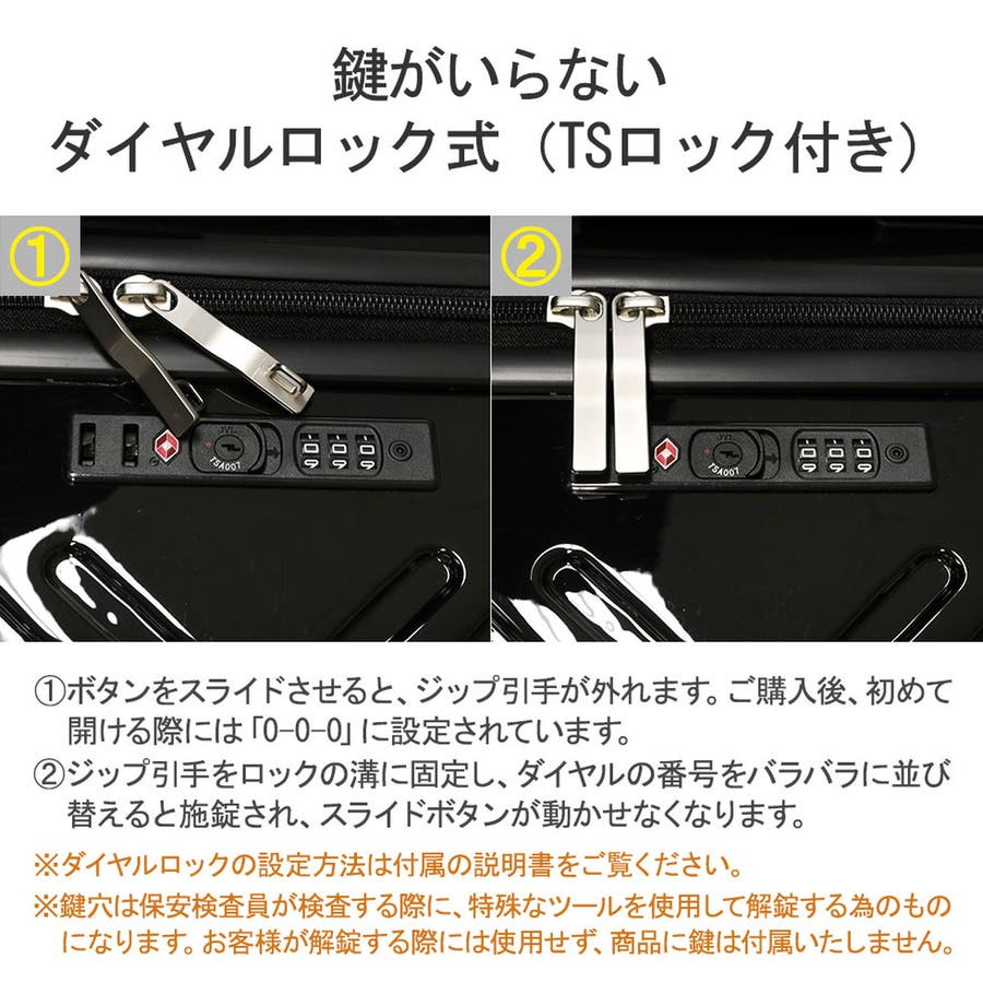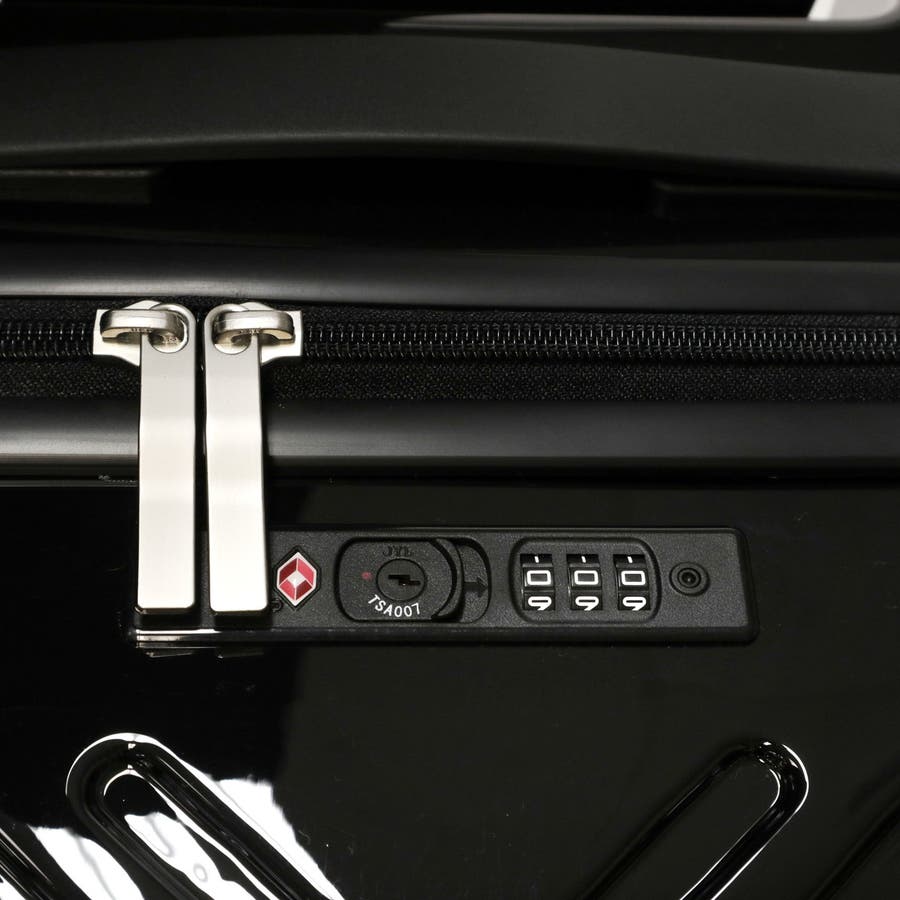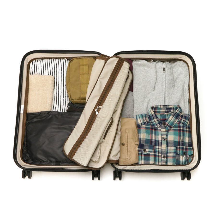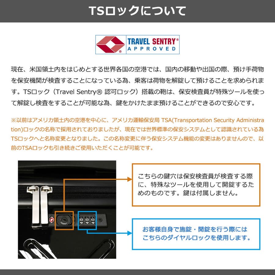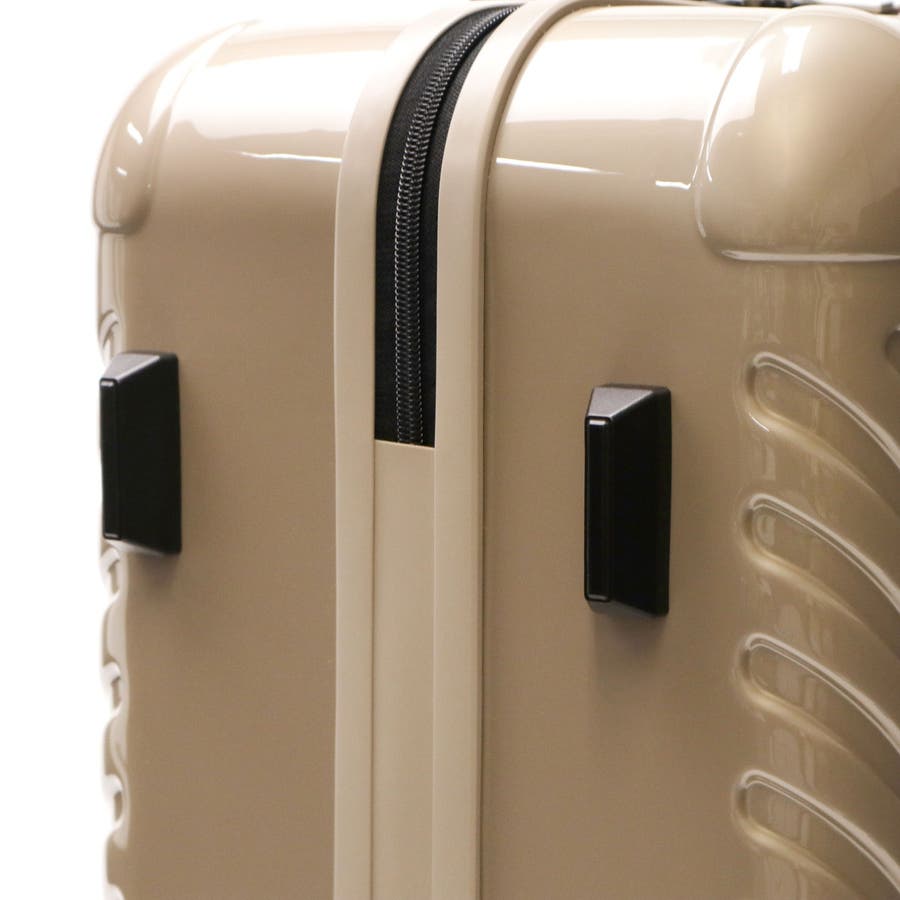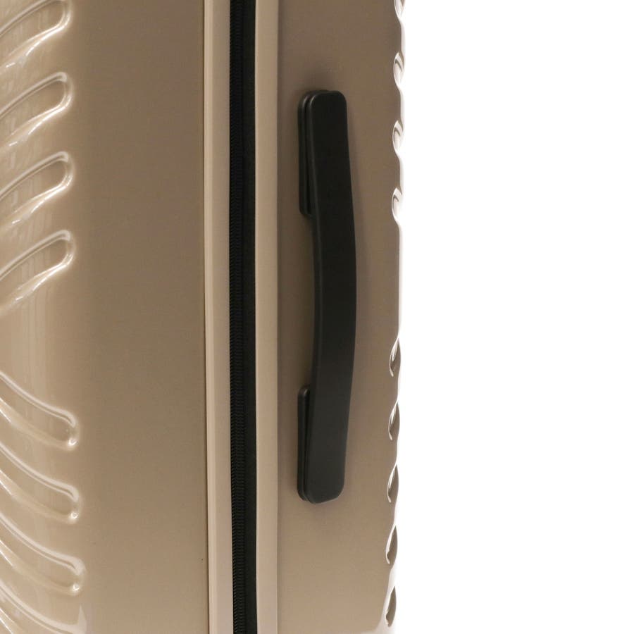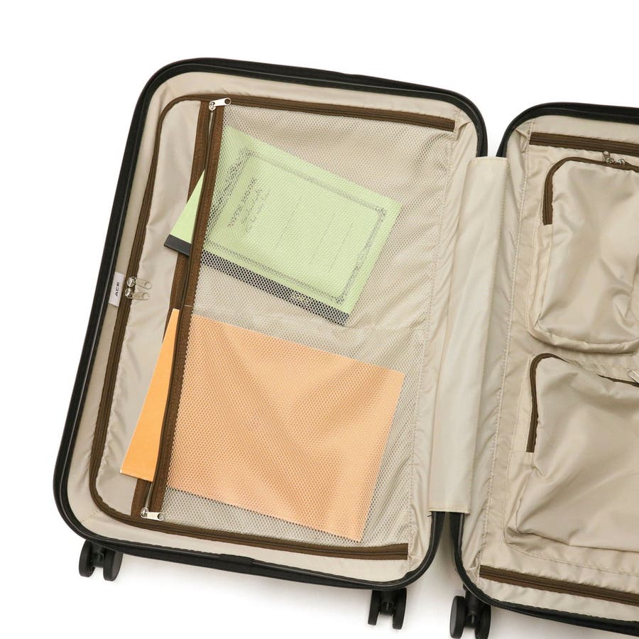 内装の収納部分は両側コの字ファスナーで中身が見えず安心してお使いいただけます。大容量のスーツケースの中では見失いがちな細かなアイテムの収納に役立つ仕分けポケットを豊富に備え、荷物を見失う心配がないのも使いやすさのポイントです。キャスターは旋回性に優れた双輪仕様で、快適に移動を行うことが可能。サイドにはグライドが付いており、気兼ねなく横置きすることができるのも魅力となっています。
