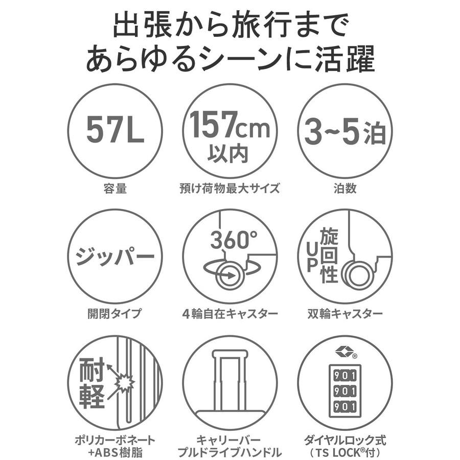 スタイリッシュな鏡面仕様のボディが目を惹き、旅行は勿論、出張にも最適な『ラディアル』シリーズのスーツケース。こちらは、容量57Lで、3~5泊の旅に最適なモデルになっています。シンプルでありながら、使い心地の良い内装設計や、TSAダイヤルロックなどの機能性を併せ持ち、快適な旅を演出してくれます。展開カラーのガンメタリック(02)、シルバー(09)は注目の別注カラーです。