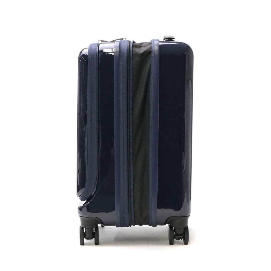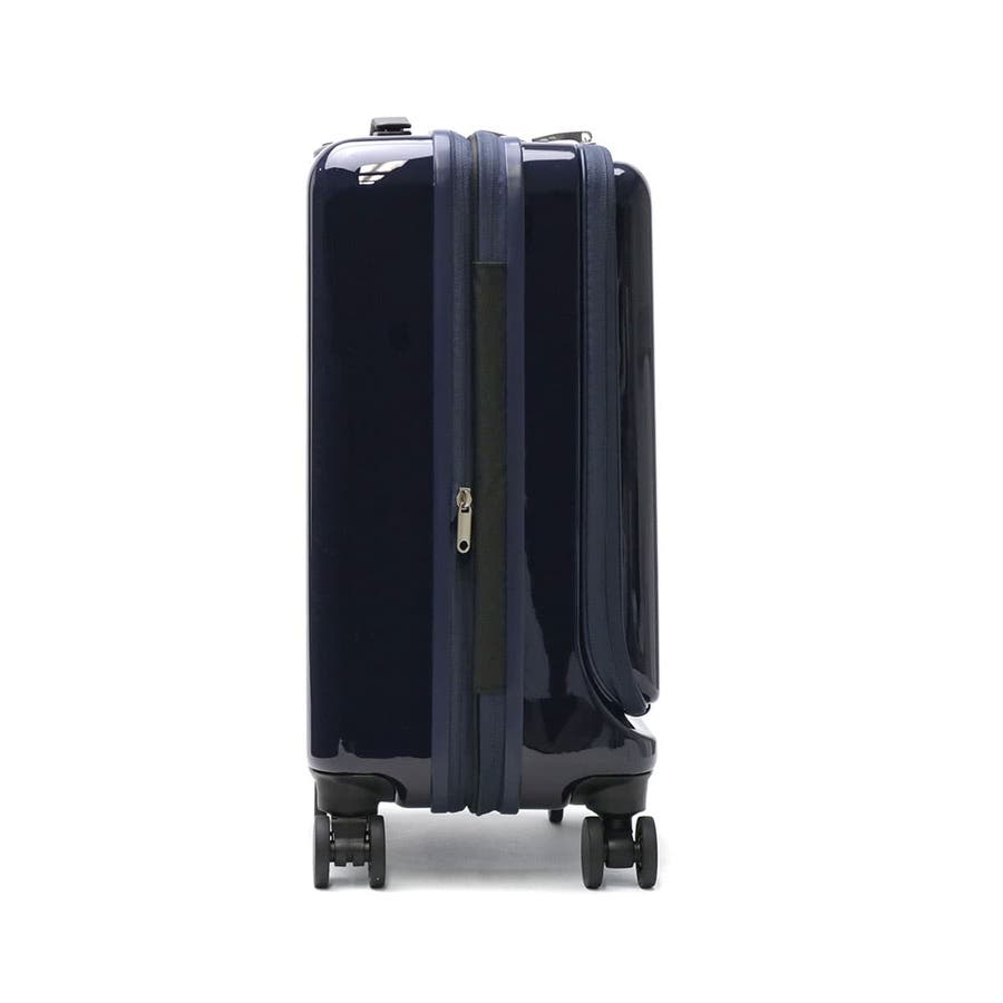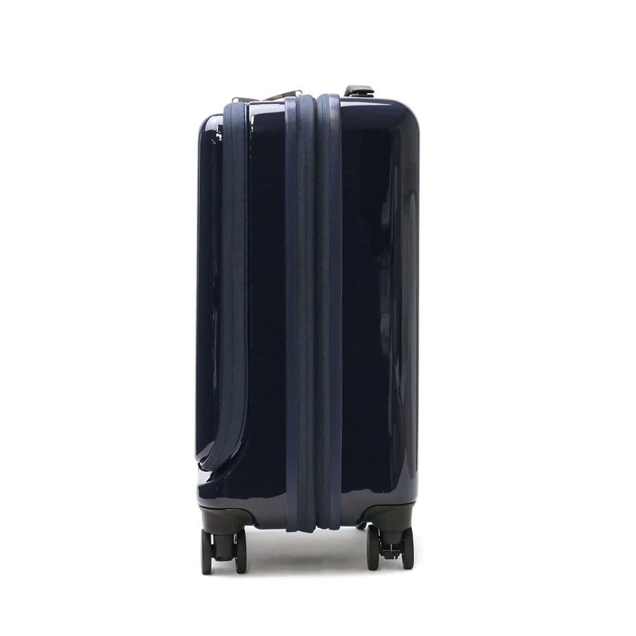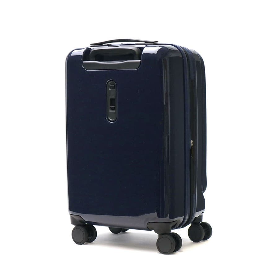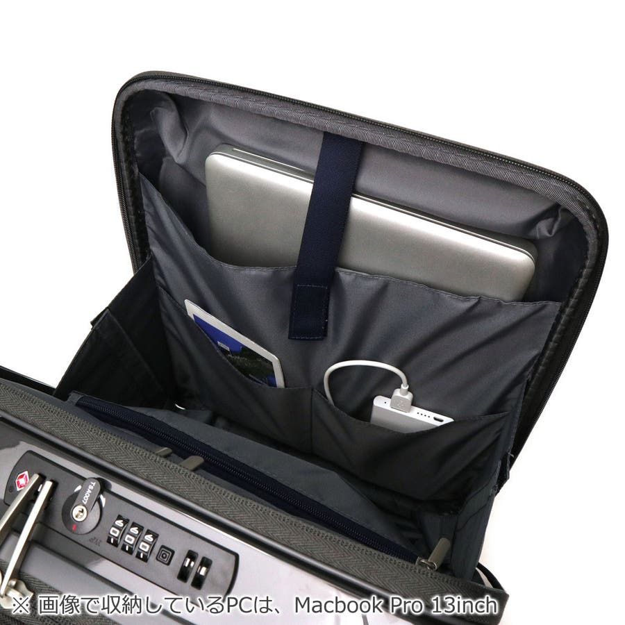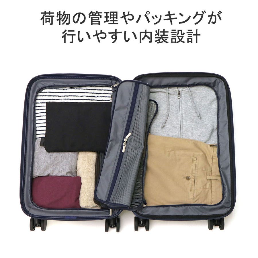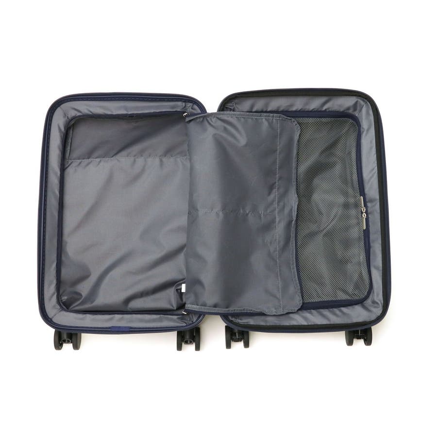 本体には、移動中でも荷物をスムーズに取り出すことができるフロントポケットを備えています。内部には細かな荷物の管理に役立つ小分けポケットや、13インチに対応したPC収納を装備。さらに背面部分のファスナーを使えば、簡単にメインルームへアクセスできます。メインルームはファスナー付き収納部を設け、荷物の整頓に配慮したつくり。さらに外側に備わったファスナーを広げる事で容量を拡張する事ができる為、出先で荷物が増えた際も安心して対応できます。その他にも、旋回性に優れた双輪キャスターや、不意な走行を防止するキャスターストッパー、安心のTSAダイヤルロックを備えた申し分のない機能性が魅力となっています。