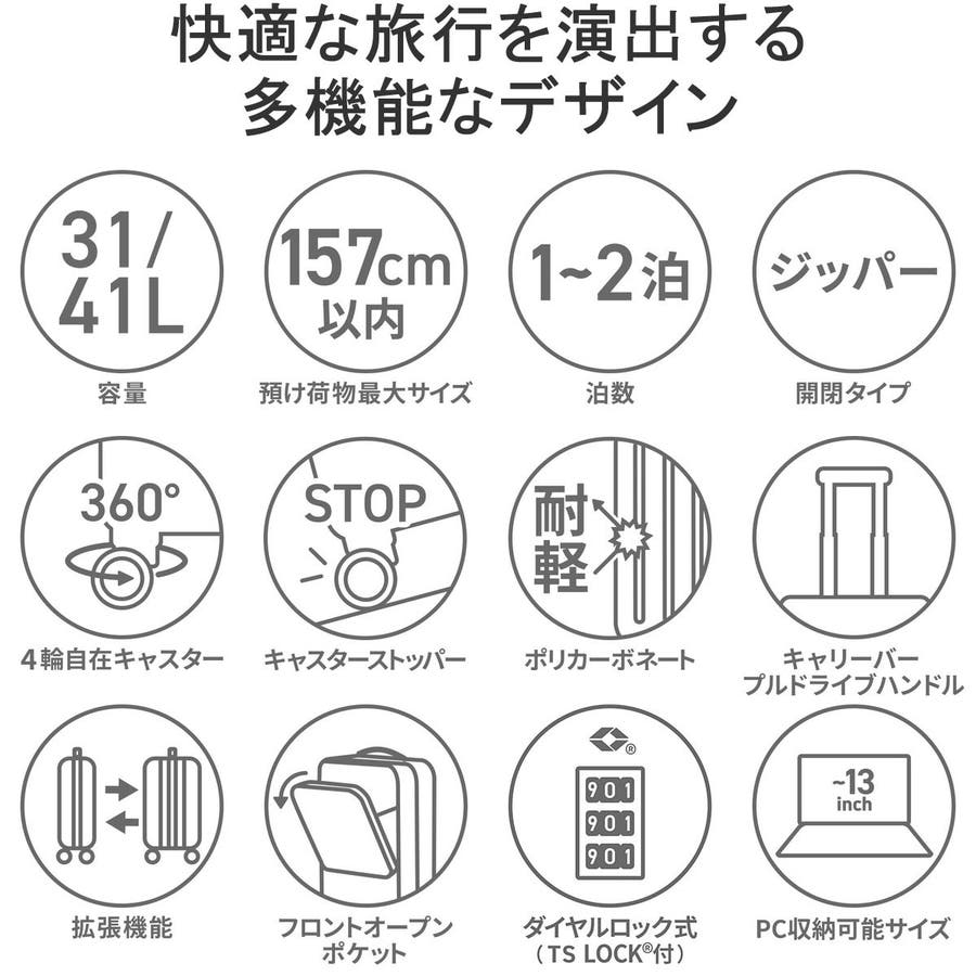 旅行は勿論、出張などにも活躍する洗練されたデザインが魅力のスーツケース。こちらは、31Lから41Lに容量の拡張が可能なエキスパンダブル機能が備わり、1~2泊の旅行に最適なモデルです。移動中は勿論、パッキングも行いやすく、快適な旅を演出してくれる仕上がりになっています。