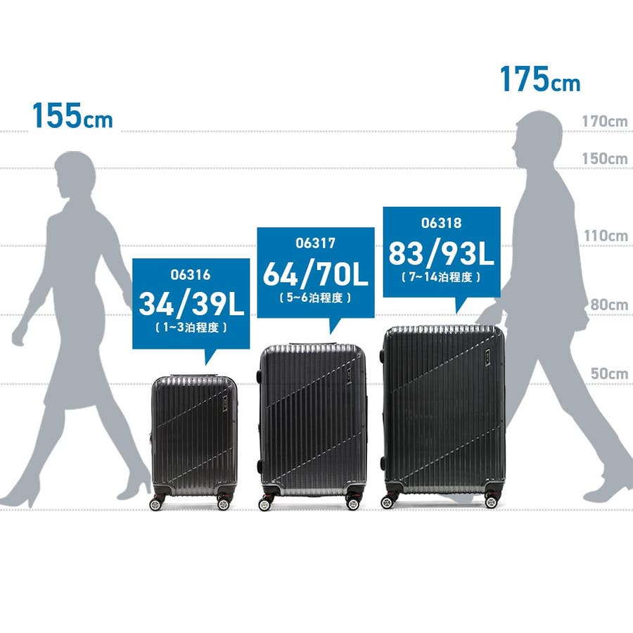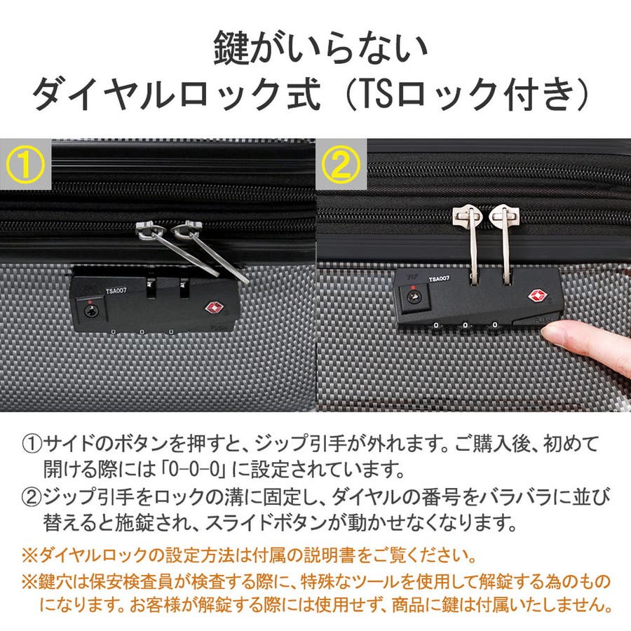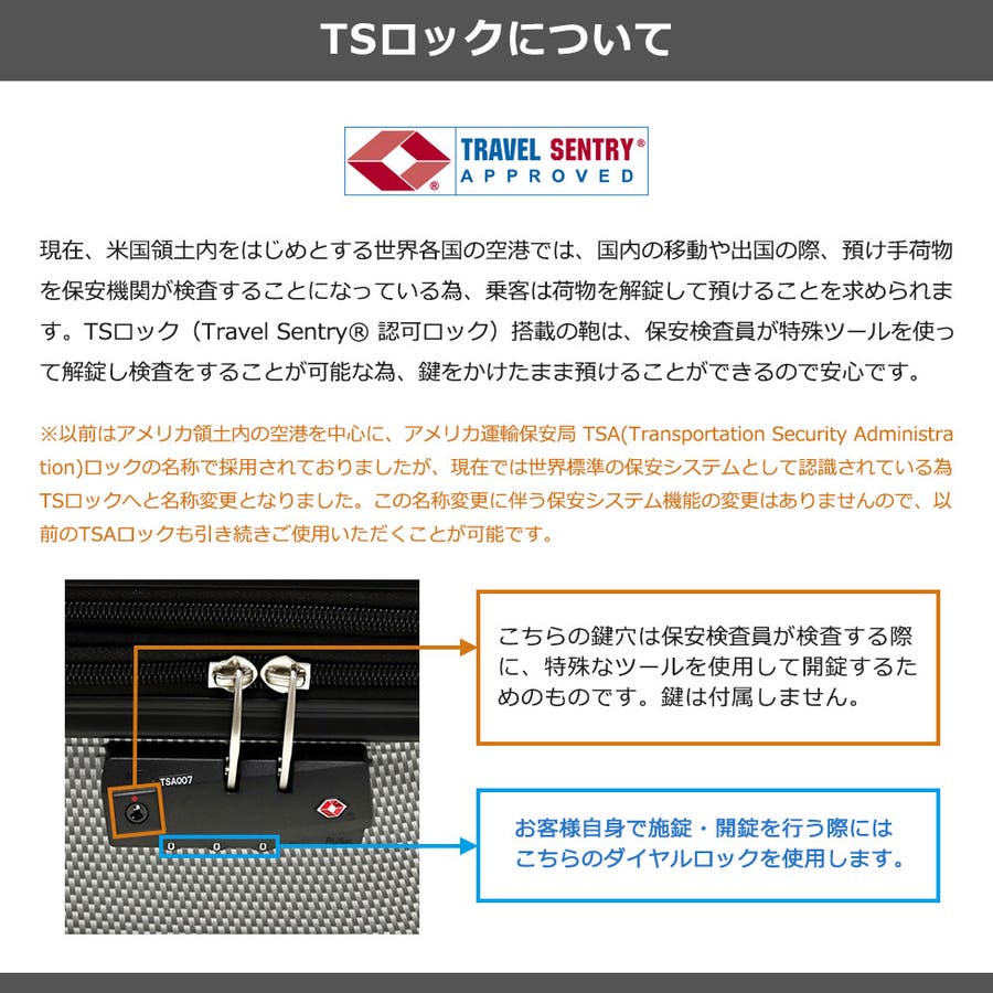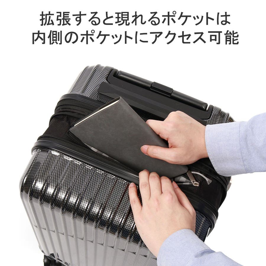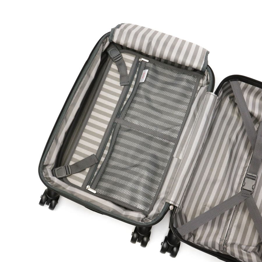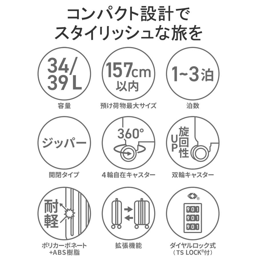 スタイリッシュなボディデザインで、旅行は勿論、出張にも最適な『クレスタ』シリーズのスーツケース。こちらは、通常時の容量は34Lですが、マチを広げると39Lまで拡張することができます。拡張せずに使用した場合、機内持ち込みが可能なモデルとなっています。また、拡張時には内側のポケットにアクセスできる仕様となっており、シンプルでありながら、使い心地の良い内装設計や、TSダイヤルロックなどの機能性を併せ持ち、快適な旅を演出してくれます。