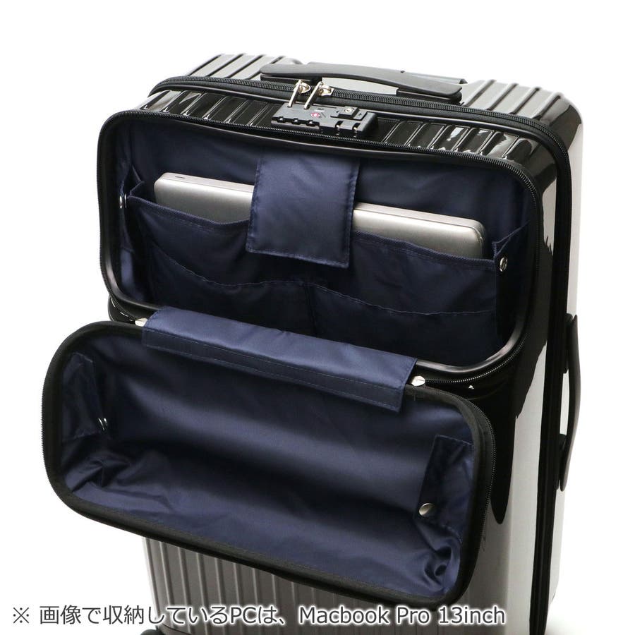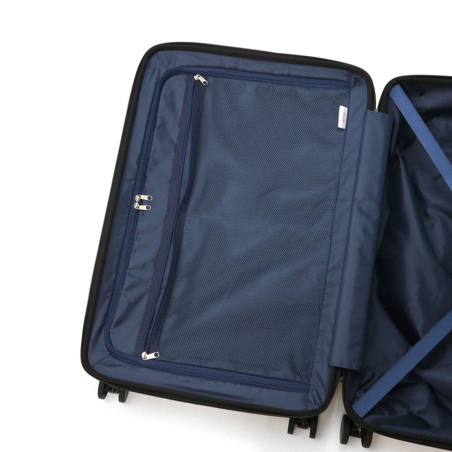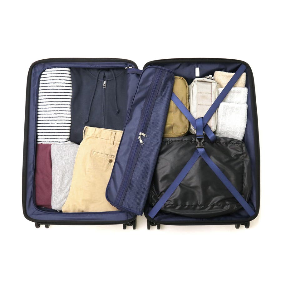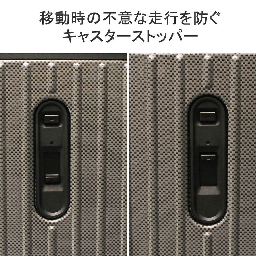 どんな場面でも使いやすい、シンプルなスーツケースです。3~5泊分の荷物が収まる59Lの本体には、PC収納やフロントオープンポケットなど、利便性の高いスペックを完備。不意な動きを防ぐストッパーや、旋回性に優れた双輪キャスターも搭載され、移動時のストレスをも軽減する機能性を搭載しています。