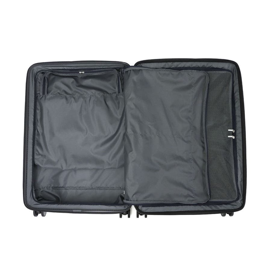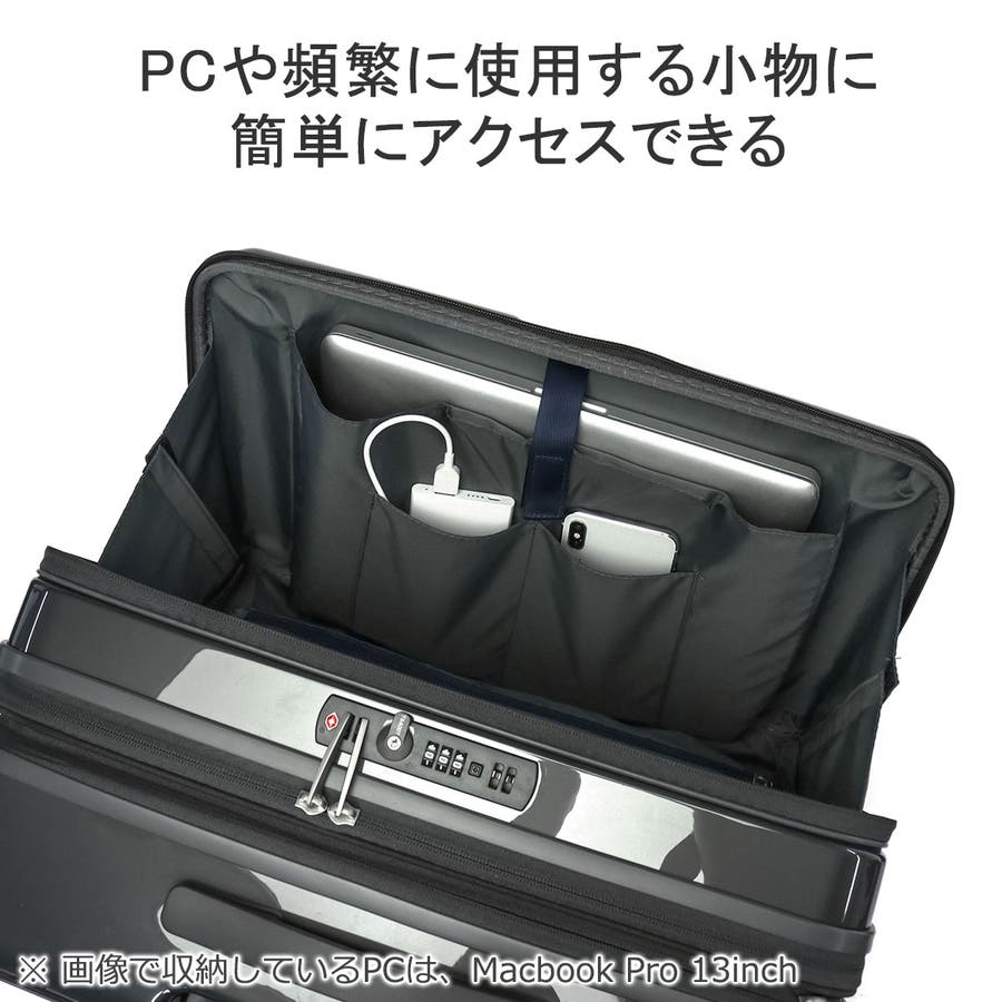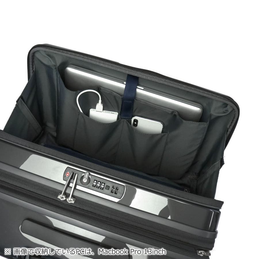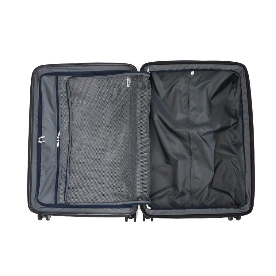 本体のフロントには、移動中でも荷物を取り出しやすいフロントポケットを備えています。内部には細かな荷物の管理に役立つ小分けポケットや、15.6ンチに対応したPC収納を装備。さらに背面部分のファスナーを使えば、メインルームへ簡単にアクセスできます。メインルームはメッシュ仕様のファスナー付き収納部を設け、荷物の整頓に配慮したつくり。さらに外側に備わったファスナーを広げる事で容量を拡張する事ができる為、出先で荷物が増えた際も安心して対応できます。その他にも、旋回性に優れた双輪キャスターや、不意な走行を防止するキャスターストッパー、安心のTSAダイヤルロックを備えた申し分のない機能性が魅力となっています。