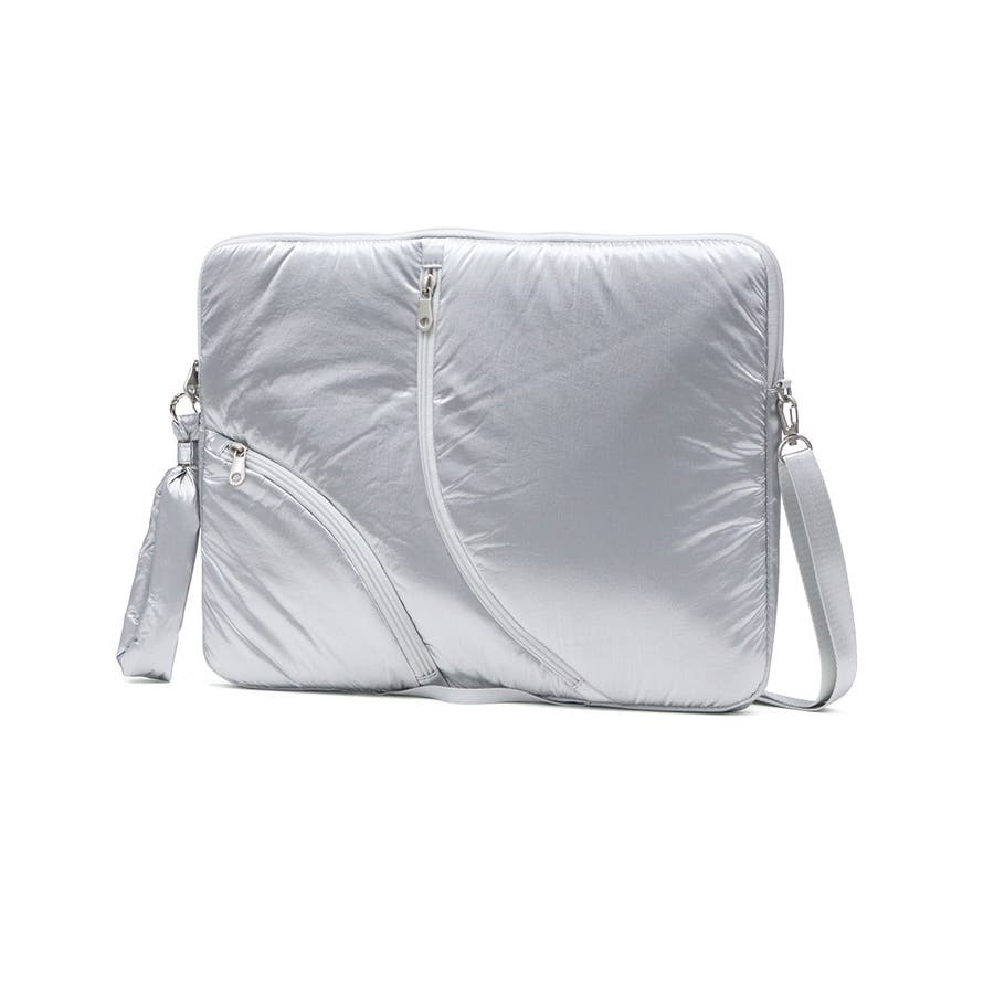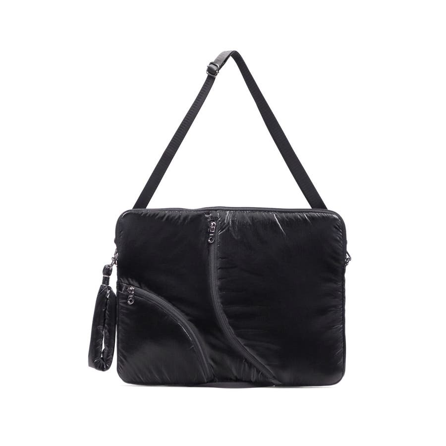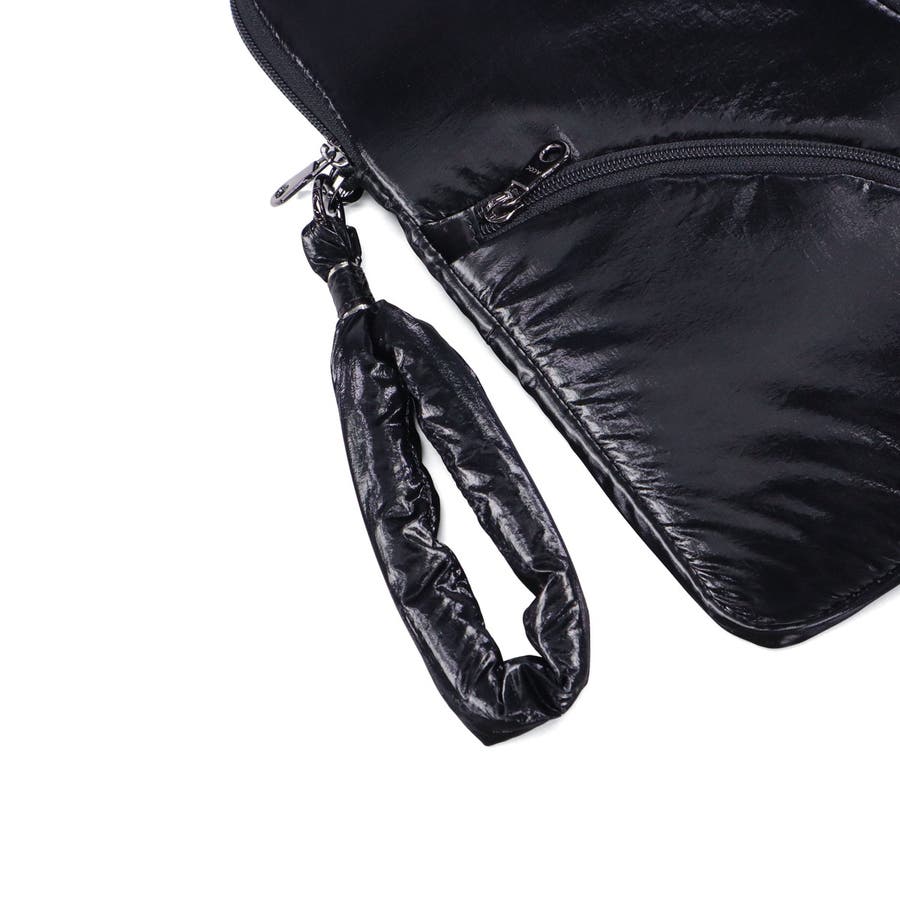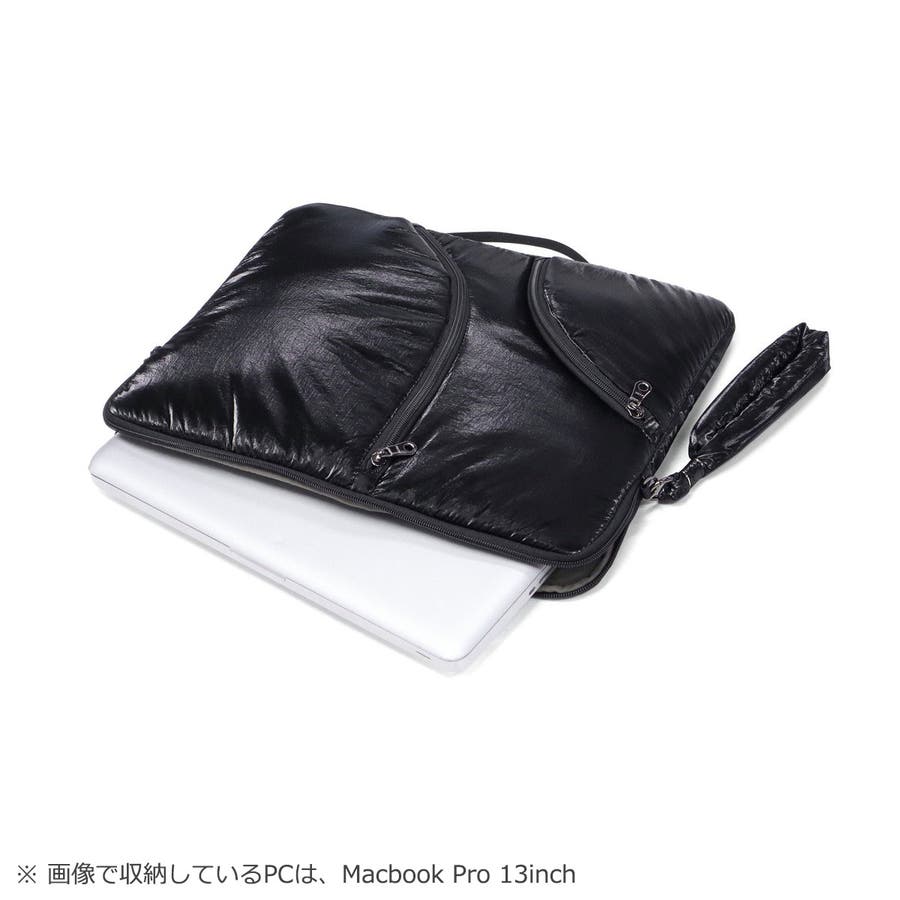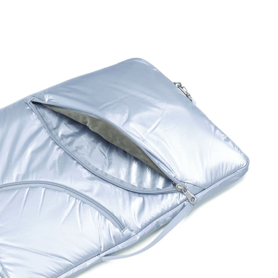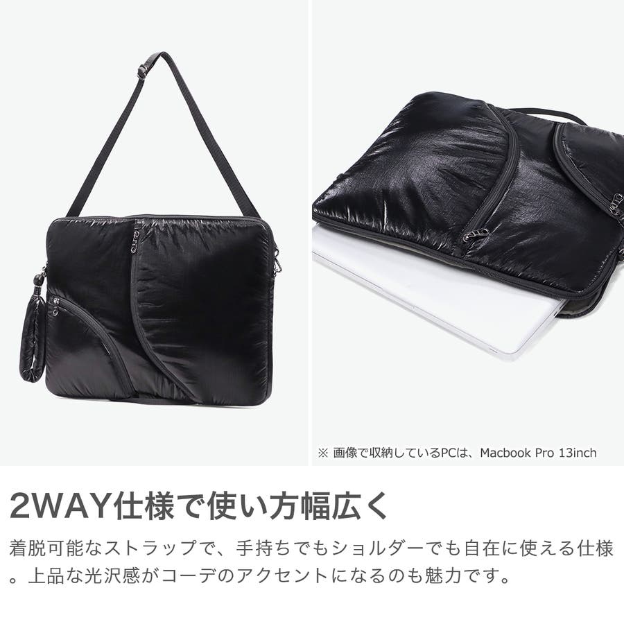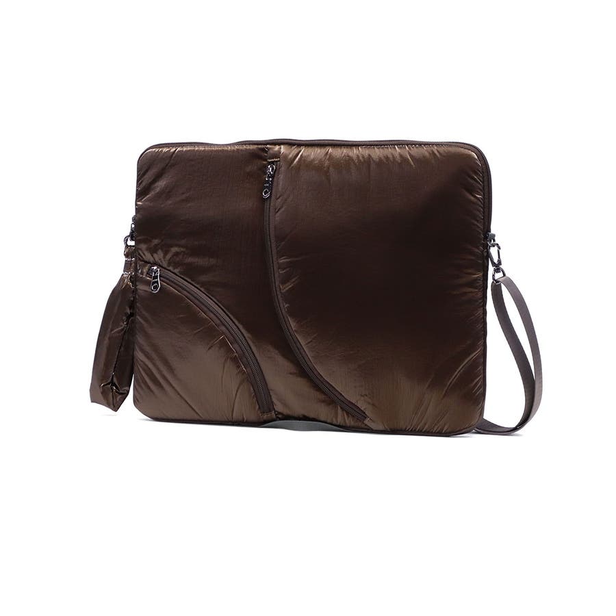 単体での使用にも便利なショルダーストラップ付き。光沢感のある柔らかな手触りの生地がおしゃれな印象です。フロントのジップポケットは実用性を高めるだけでなく、デザインのポイントにもなる個性的な仕様。負担にならない軽量さもポイントです。