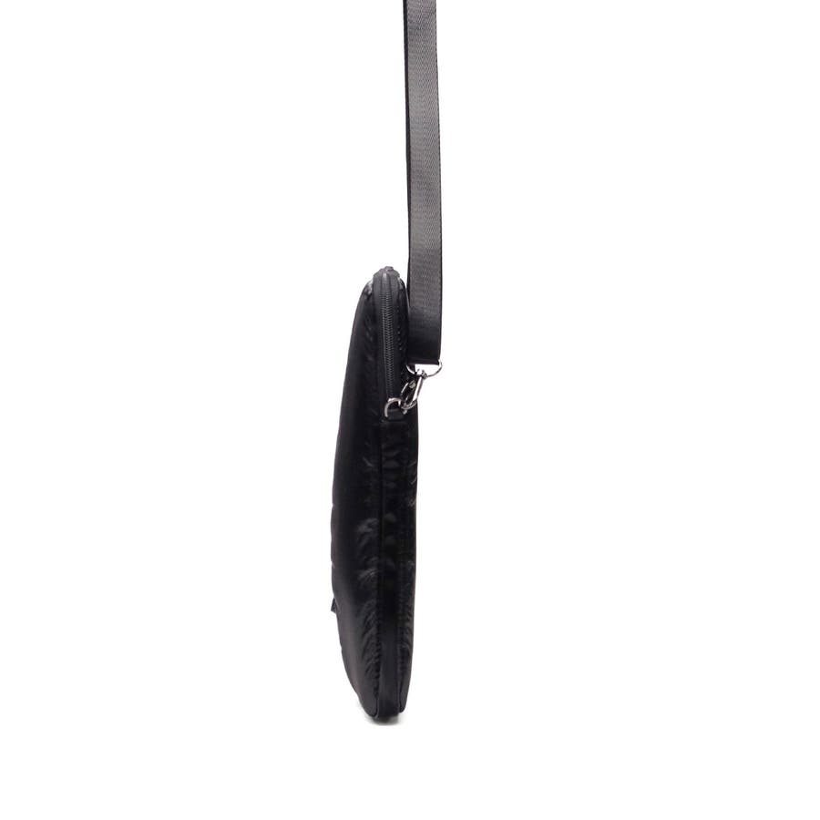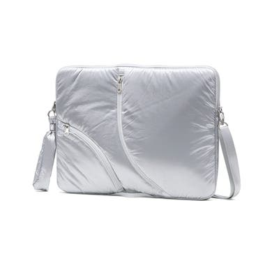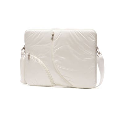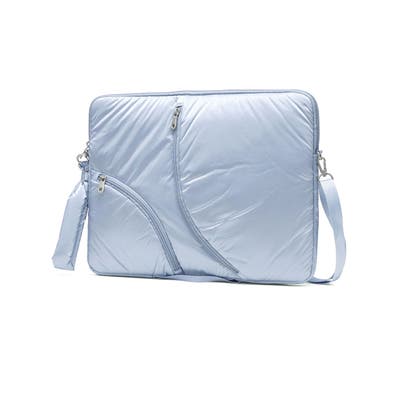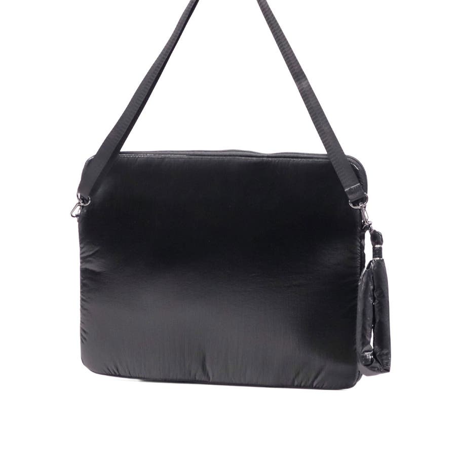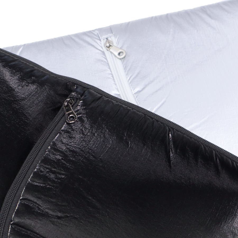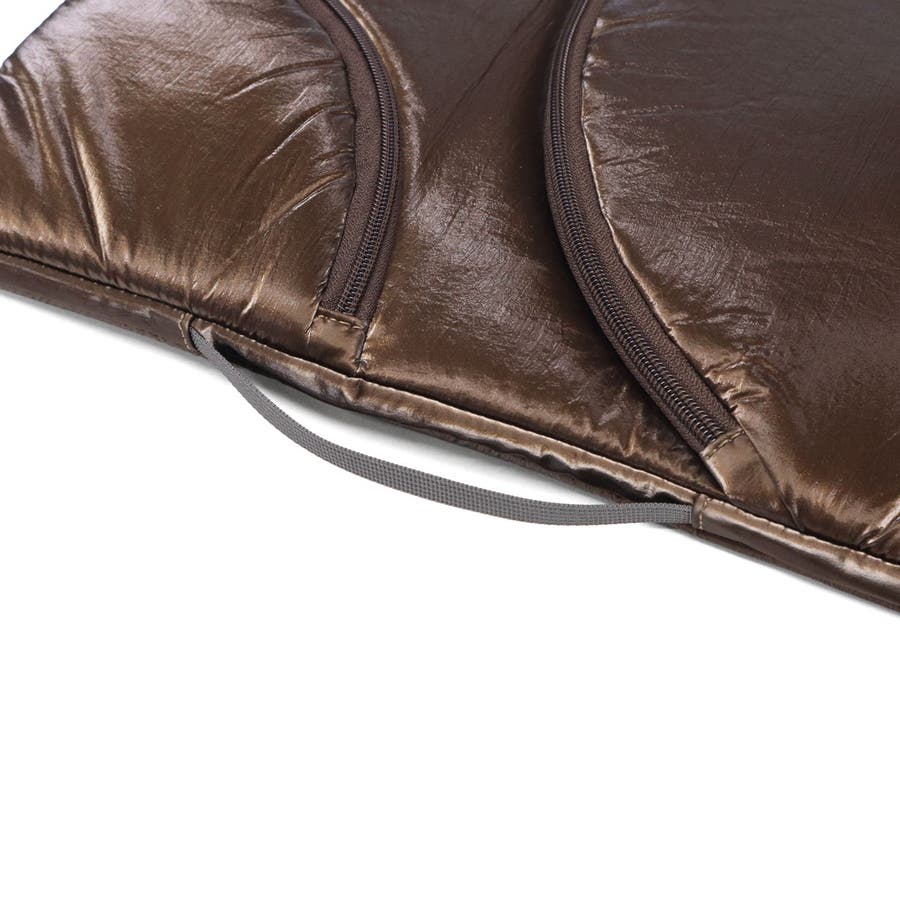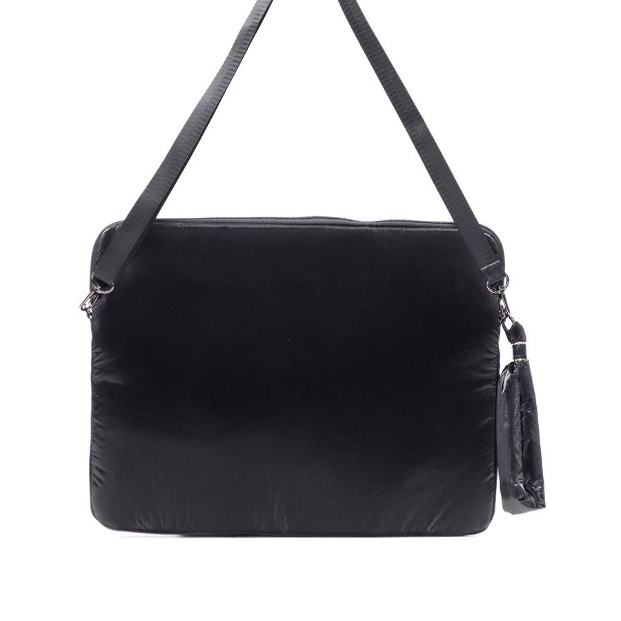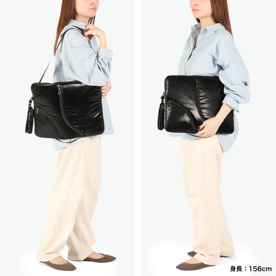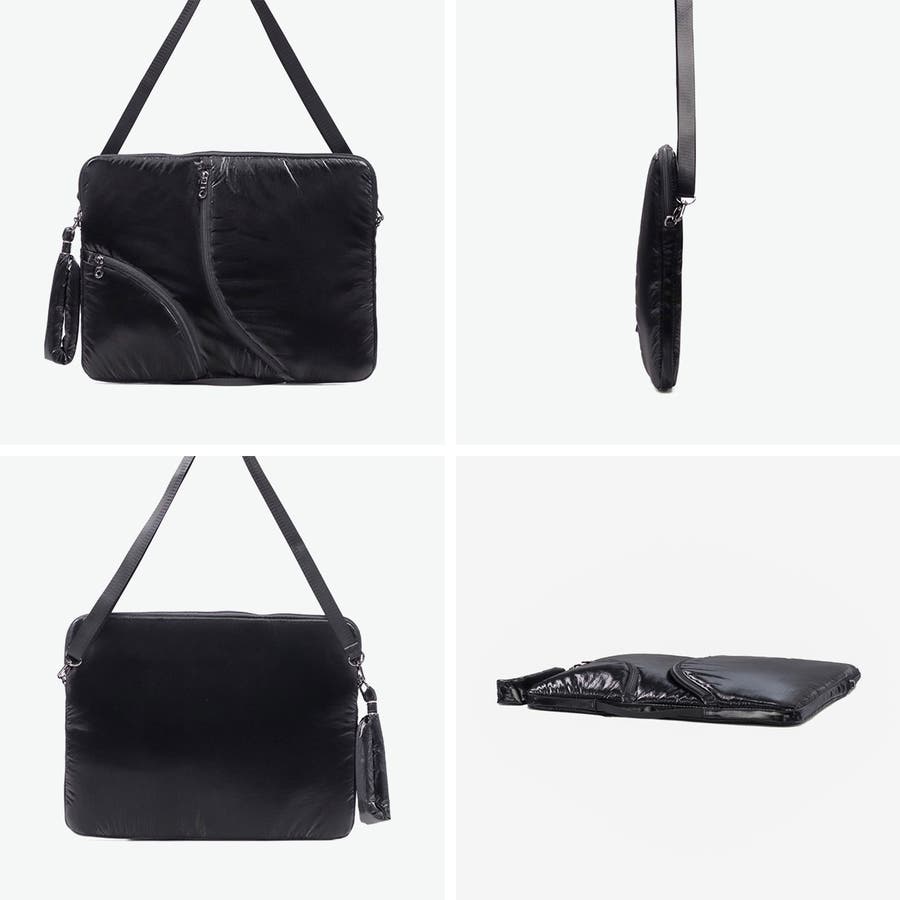 単体での使用にも便利なショルダーストラップ付き。光沢感のある柔らかな手触りの生地がおしゃれな印象です。フロントのジップポケットは実用性を高めるだけでなく、デザインのポイントにもなる個性的な仕様。負担にならない軽量さもポイントです。