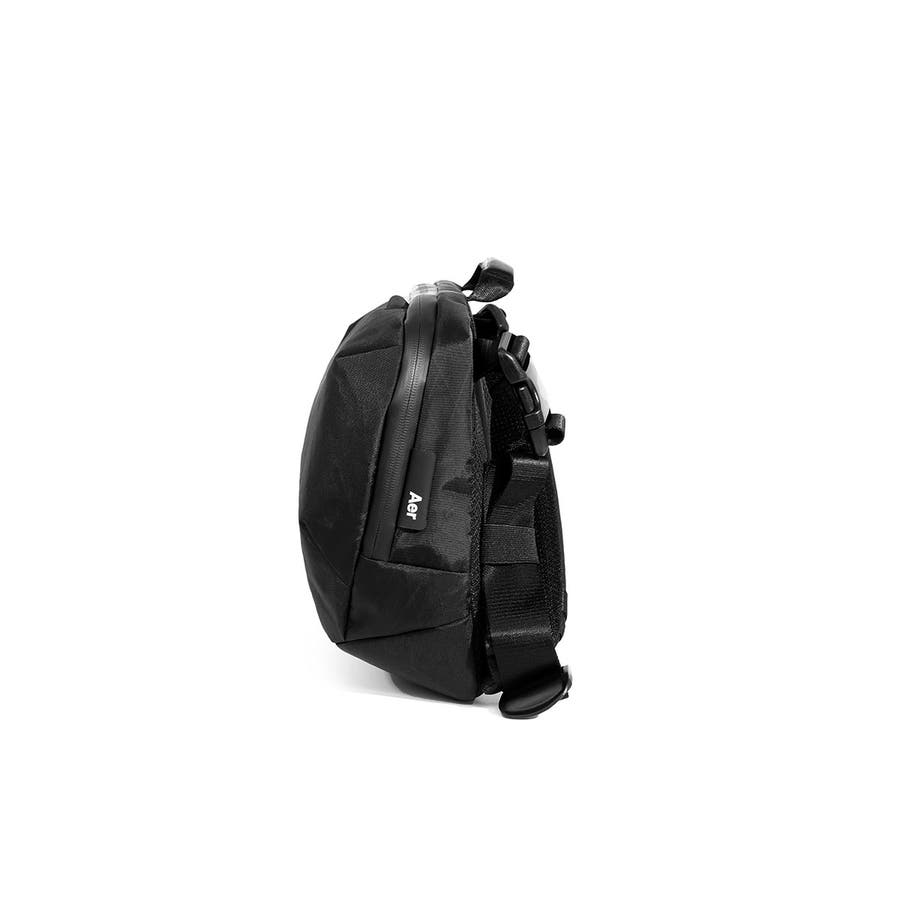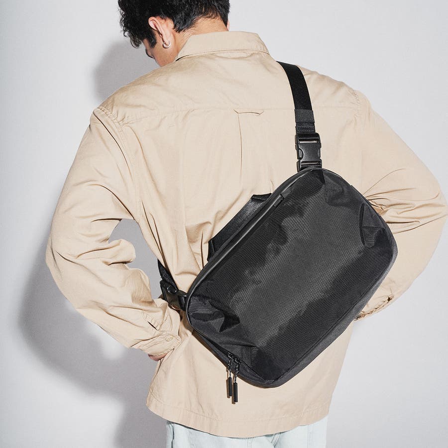 日々の必需品をスマートに収納できるボディバッグ。素材は、軽量で防水性に優れたDimension-Polyant社のVX-42 X-Pacを使用しています。PCやモバイルガジェットをまとめて収納できる複数のポケットに加え、左右どちらの肩でも使えるショルダーストラップが特徴です。