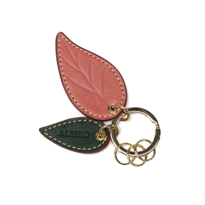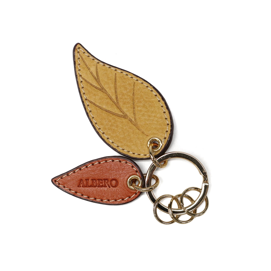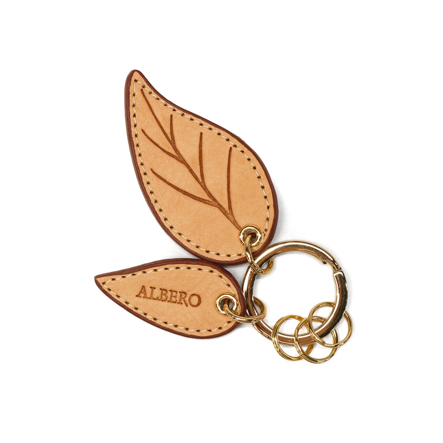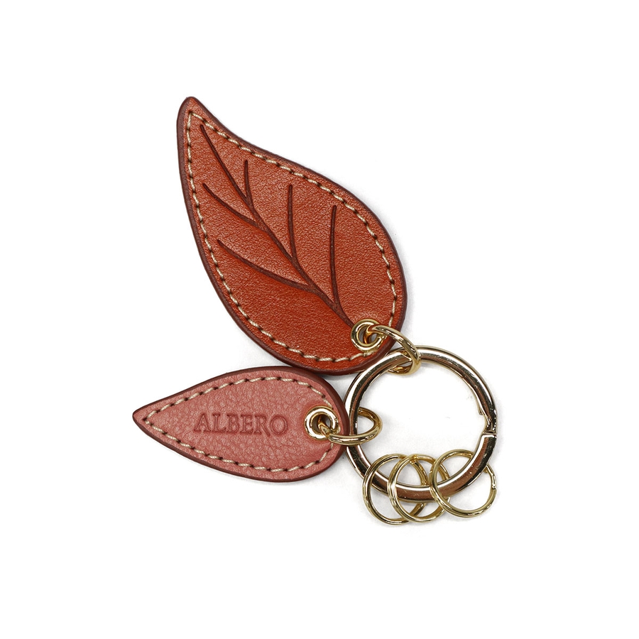 使い込むほどに光沢が増すタンニン鞣し革を使用したキーリング。可愛らしい葉っぱモチーフが2つ付いた印象的なデザインです。鍵などを取り付けられる小さめのリングを3つ設けており、お好みでチャーム等でアレンジも可能です。