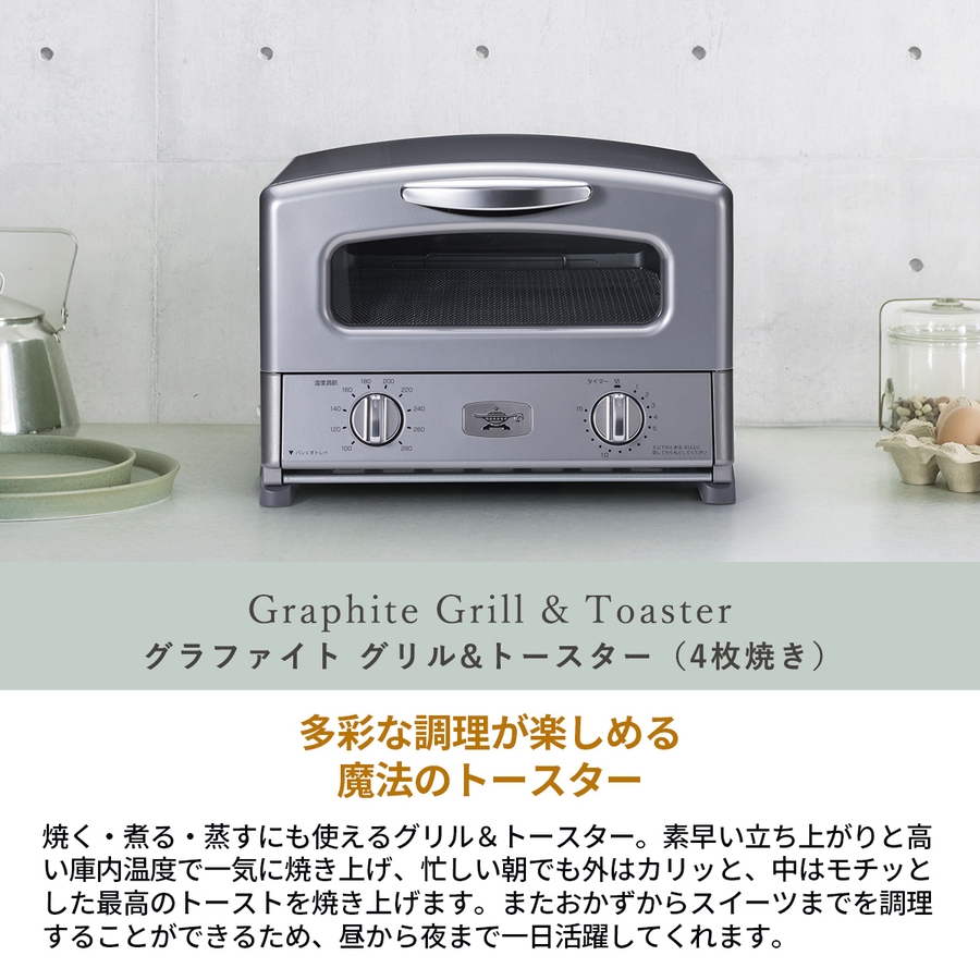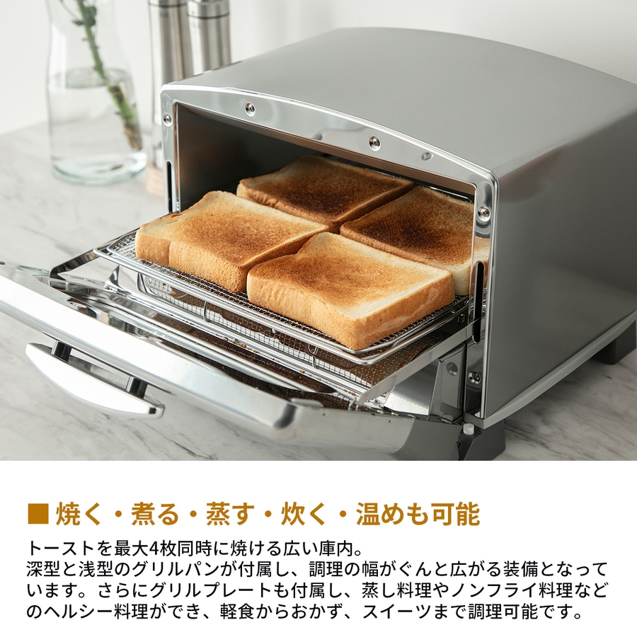 焼く・煮る・蒸すにも使えるグリル&トースター。素早い立ち上がりと高い庫内温度で一気に焼き上げ、忙しい朝でも外はカリッと、中はモチッとした最高のトーストを焼き上げます。またおかずからスイーツまでを調理することができるため、昼から夜まで一日活躍してくれます。