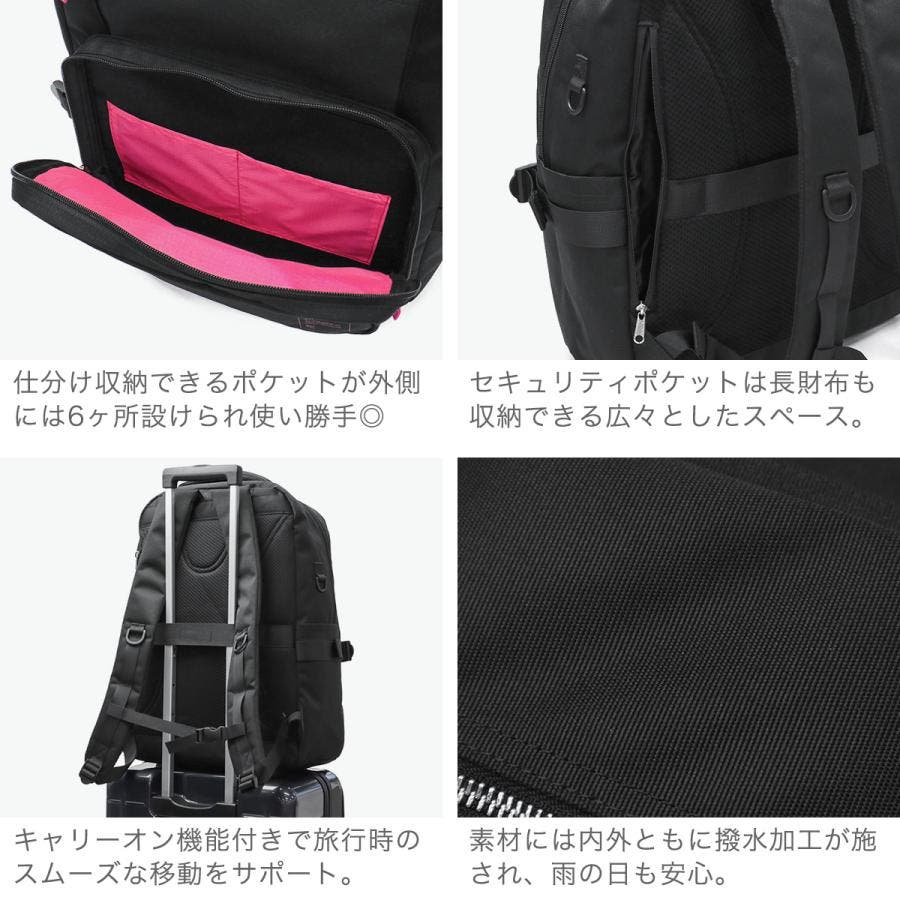 たっぷりと収納できる35Lサイズに仕分けのしやすい計11ヶ所のポケットが設けられ、収納力と機能性の備わったリュックです。背面とハンドル、ショルダー部分には柔らかいクッション材を使用し快適な背負い心地を実現。使いやすいブラックベースのカラー展開で普段使い、荷物の多い方、旅行など、学生から大人まであらゆるシーンで大活躍!