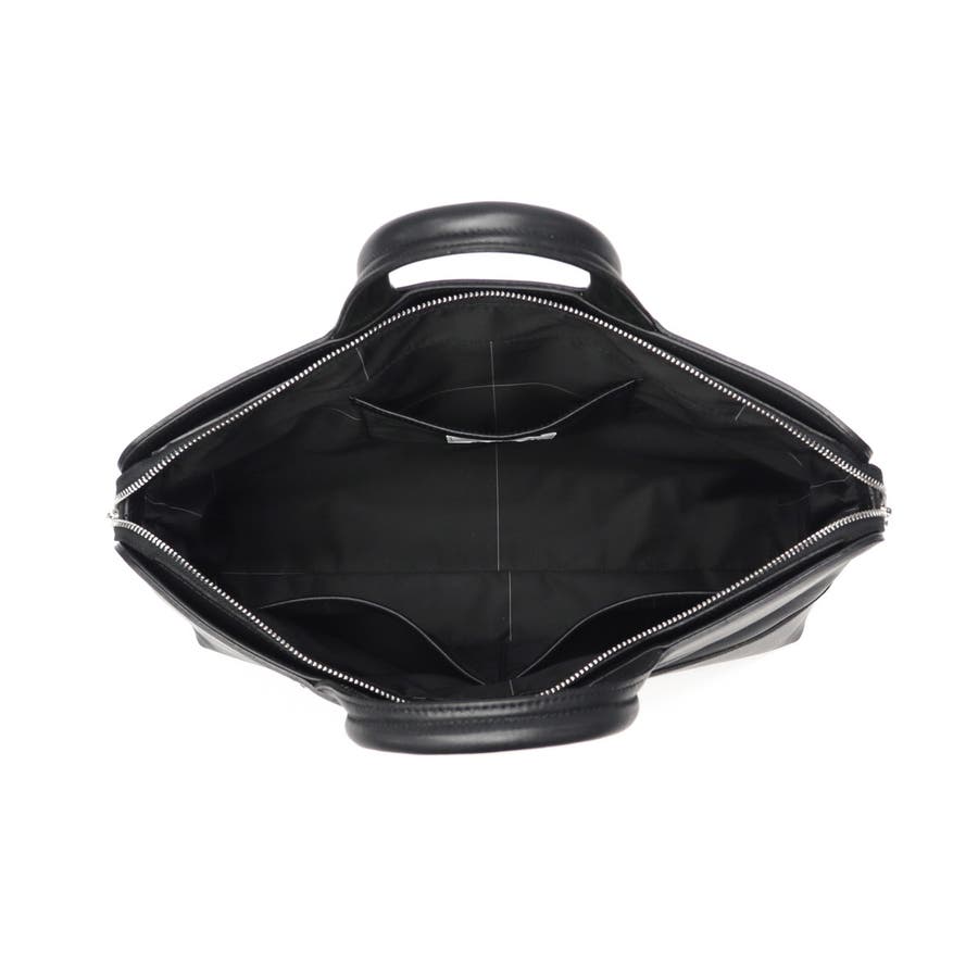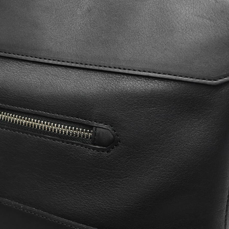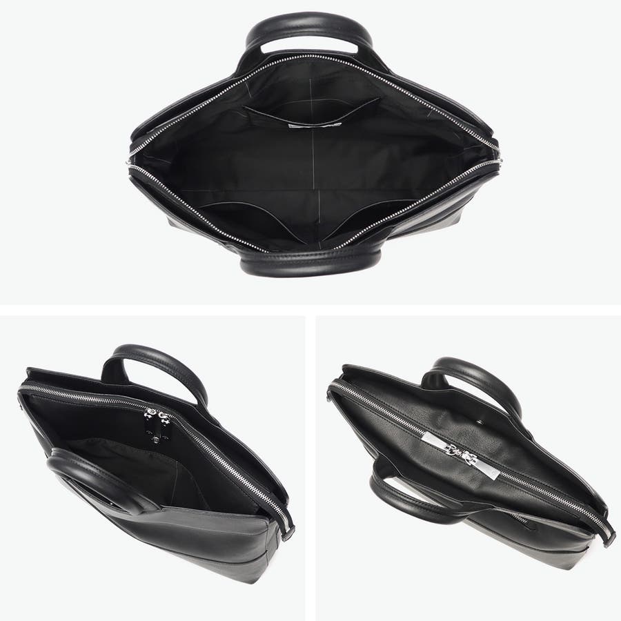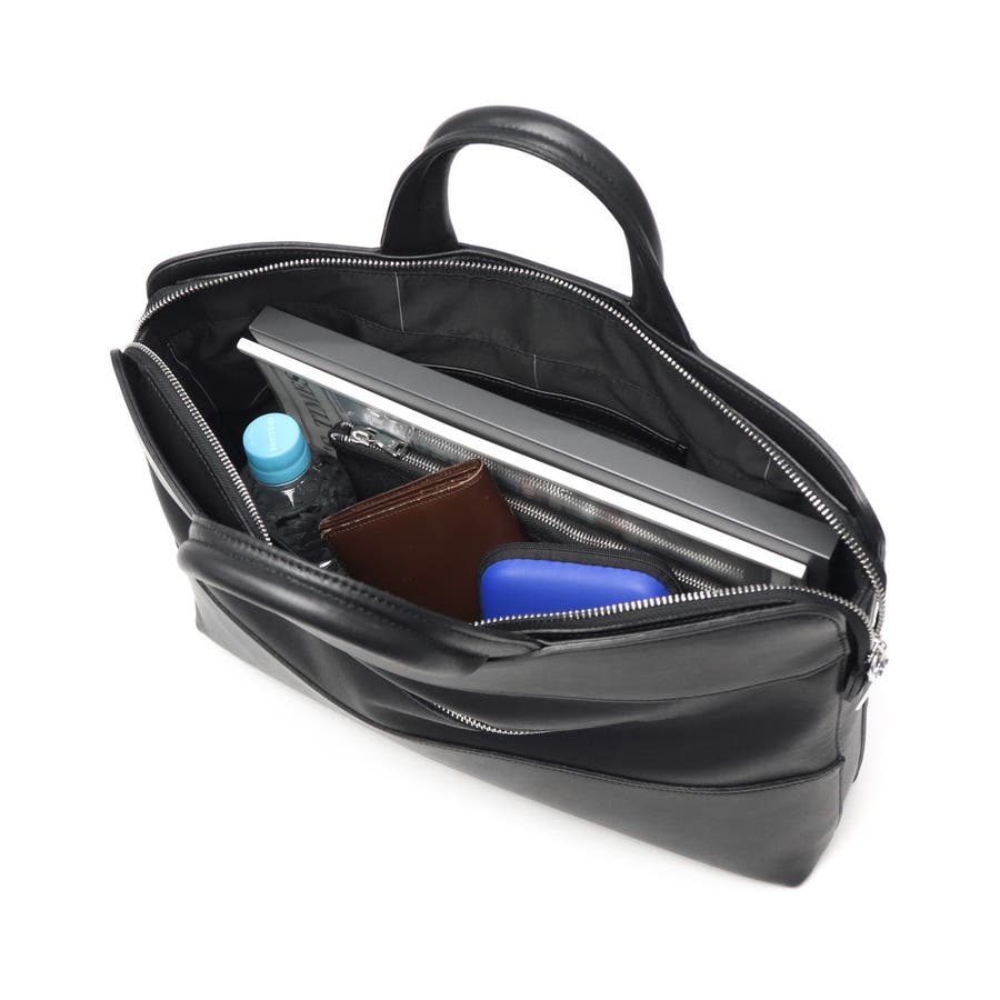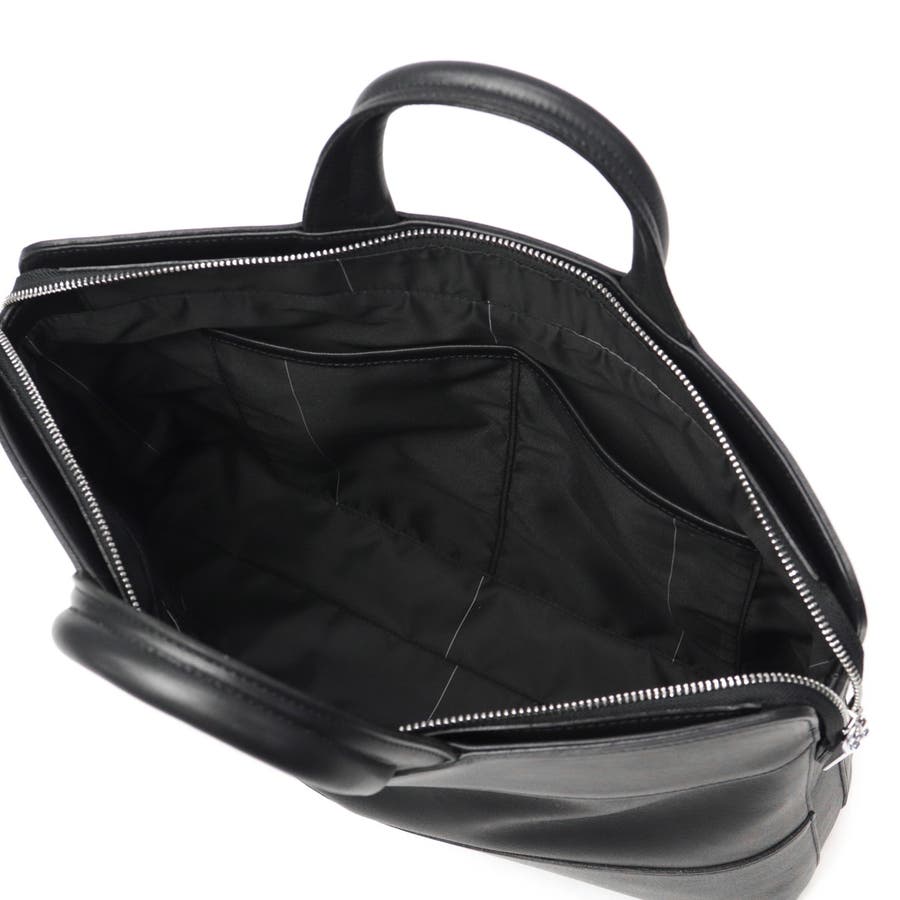 細部への気配りと美しいバランスが魅力のブリーフバッグです。角の部分はさりげなくラウンドに仕上げ、フロントのファスナーポケットには両サイドに小さな目隠しレザーを配置。これにより、ファスナー特有のごちゃごちゃ感を軽減し、洗練された印象を与えています。コンセプトは“固さと柔らかさ”。土台とサイド部分はしっかりとした骨組みで構築しながら、上部のレザーは柔らかく仕上げることで、実用性とデザイン性を両立しました。
