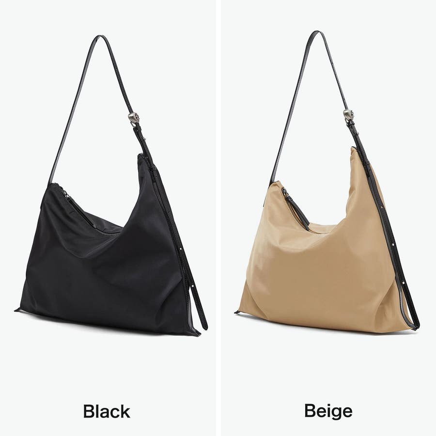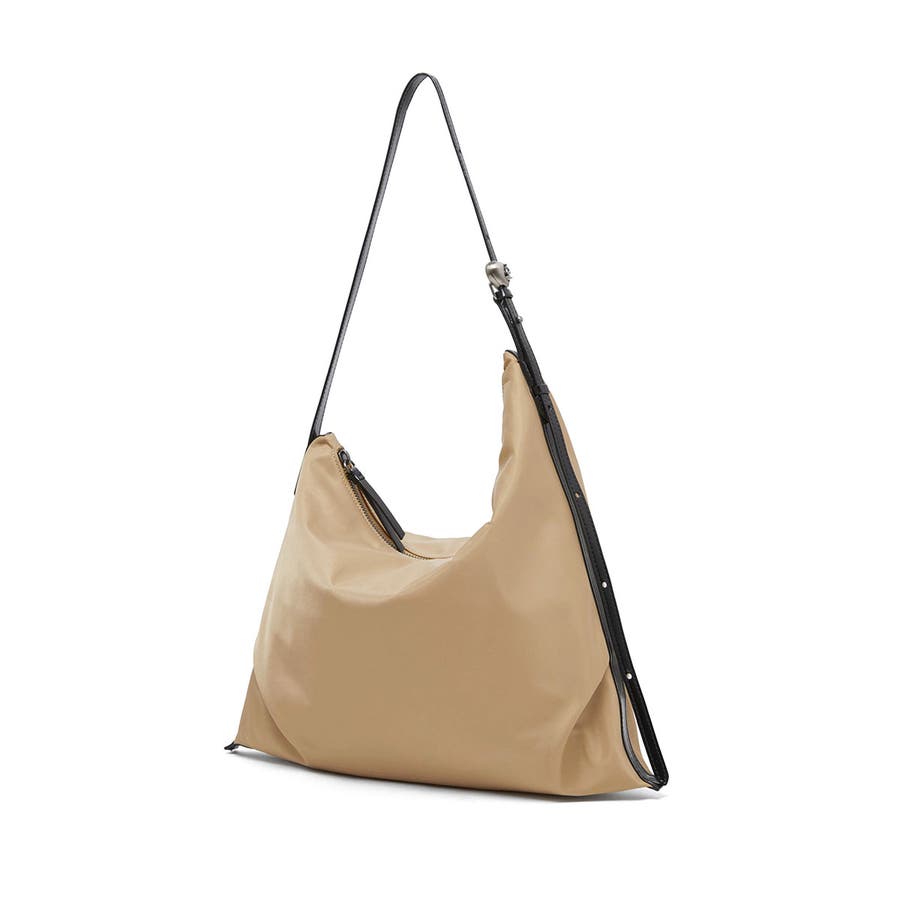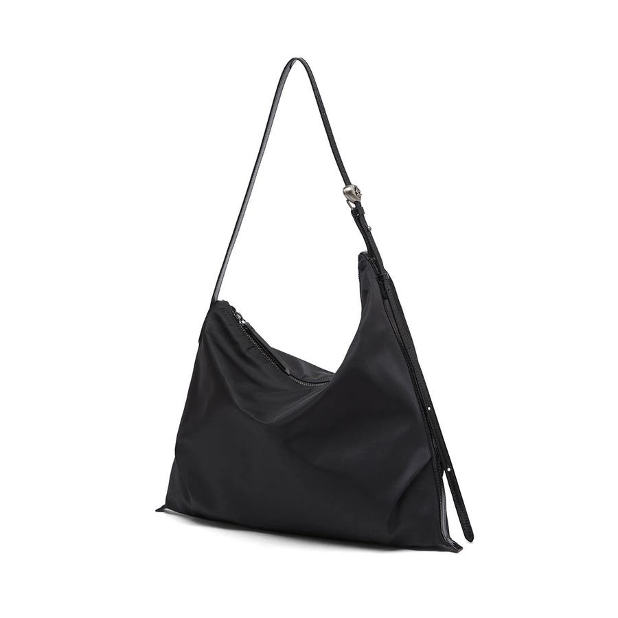 ハートのストッパー飾りがポイントの、ナイロン製ホーボーバッグ。ストラップの長さはショルダーからクロスボディまで調節が可能です。周りと一歩差をつけるアシンメトリーなフォルムは、いつものコーデにアクセントを加えてくれます。