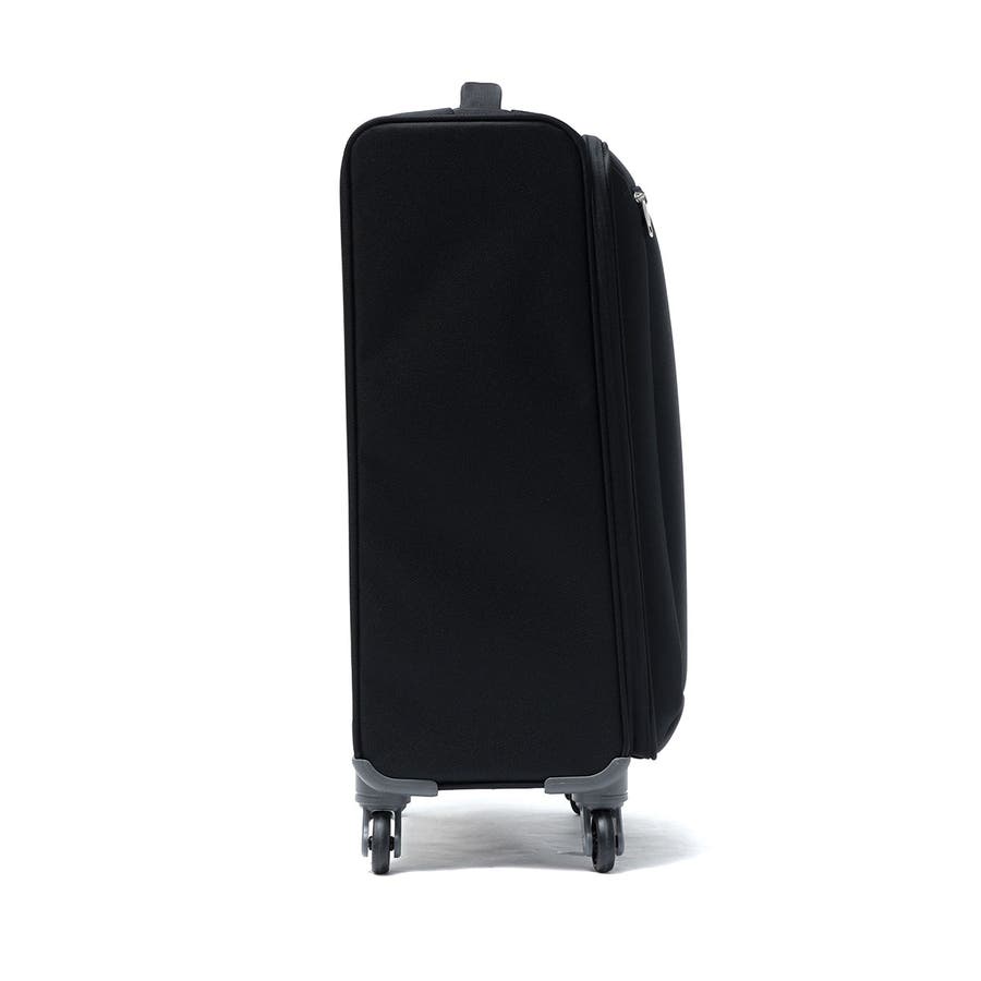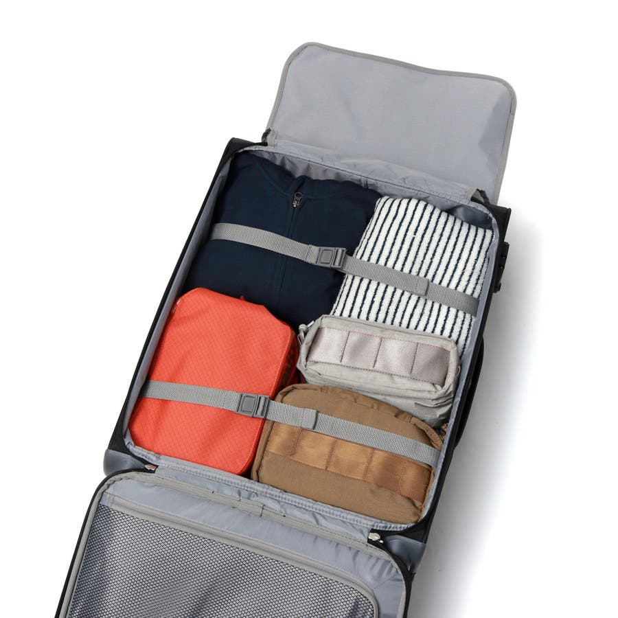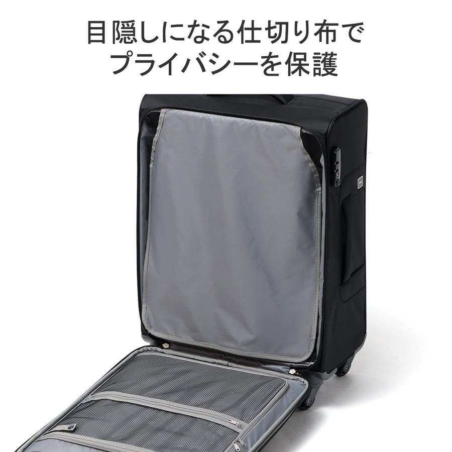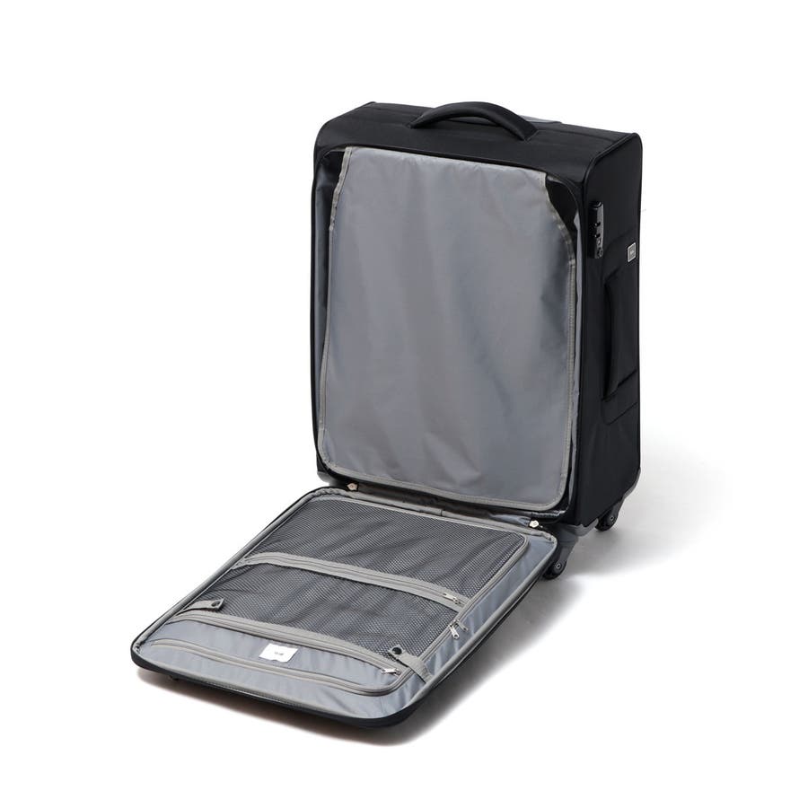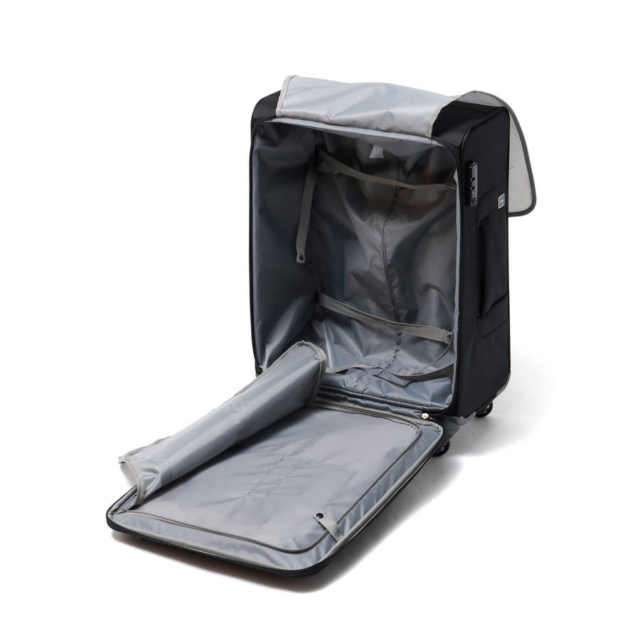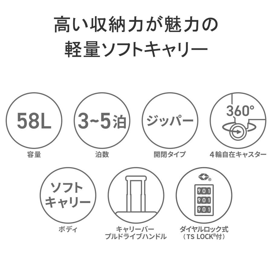 軽量かつ丈夫な素材を採用し、耐久性と軽量性を両立したソフトトローリー。こちらは3~5泊程度の旅行に適した容量58Lサイズです。開閉は縦開きタイプで、両脇のベルトをスナップで留めればハーフオープンにすることが出来ます。収納部には目隠しになる仕切り布がついており、空港などで荷物を取り出す際も安心です。旋回性に優れたキャスターやTSロックなど、旅に必要な機能を搭載したベーシックなアイテムです。