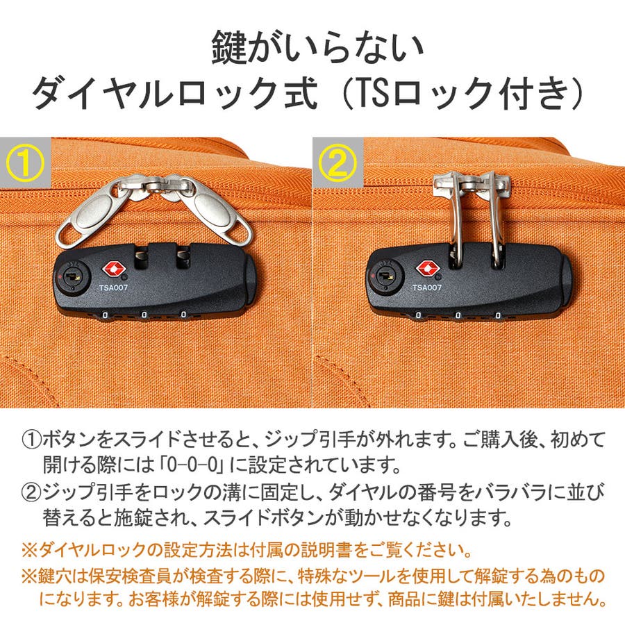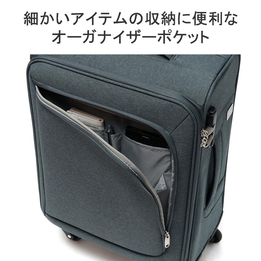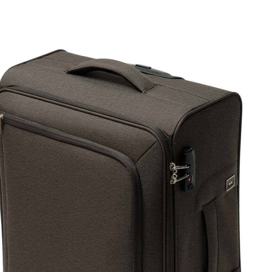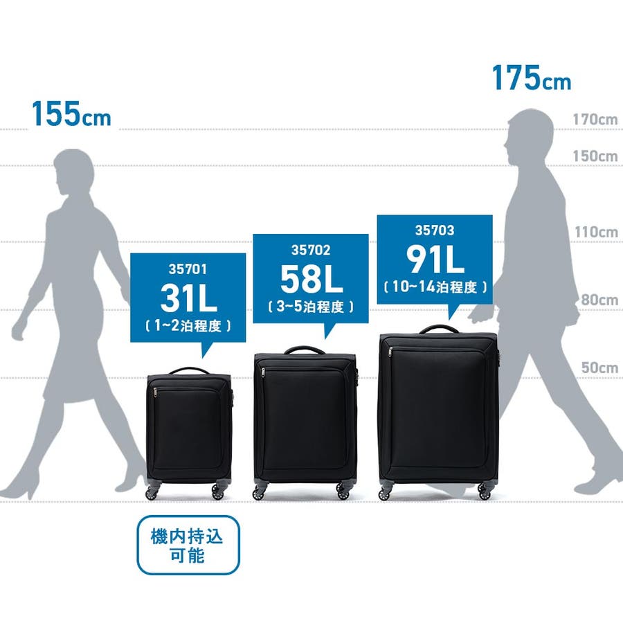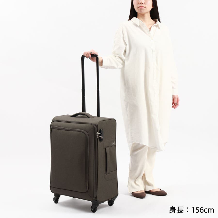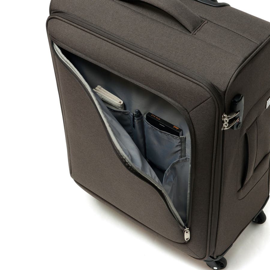 軽量かつ丈夫な素材を採用し、耐久性と軽量性を両立したソフトトローリー。こちらは3~5泊程度の旅行に適した容量58Lサイズです。開閉は縦開きタイプで、両脇のベルトをスナップで留めればハーフオープンにすることが出来ます。収納部には目隠しになる仕切り布がついており、空港などで荷物を取り出す際も安心です。旋回性に優れたキャスターやTSロックなど、旅に必要な機能を搭載したベーシックなアイテムです。
