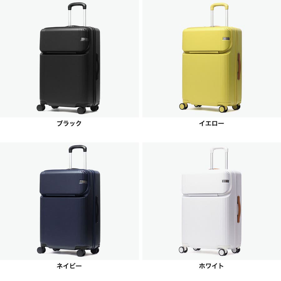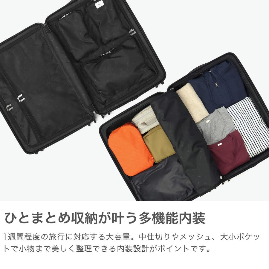 シンプルなデザインに、本革製のハンドルで高級感をプラスした『Furnit-Z/ファーニットZ』シリーズのスーツケース。こちらは、6~7泊程度の旅行に適した62L容量です。実用性に優れたフロントオープン機能や、セットアップ対応のトートバッグが付属し、快適な使い心地を実現しています。