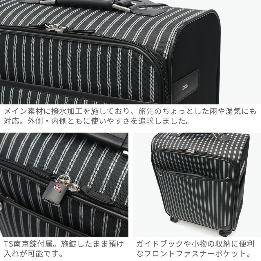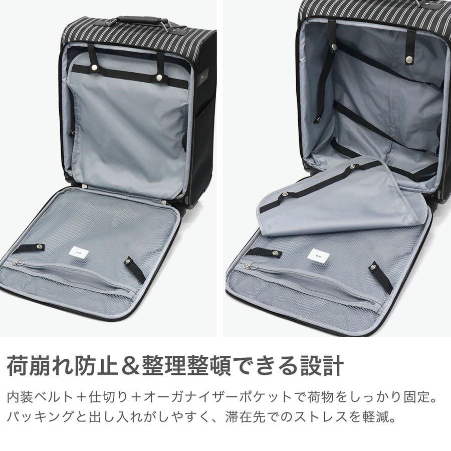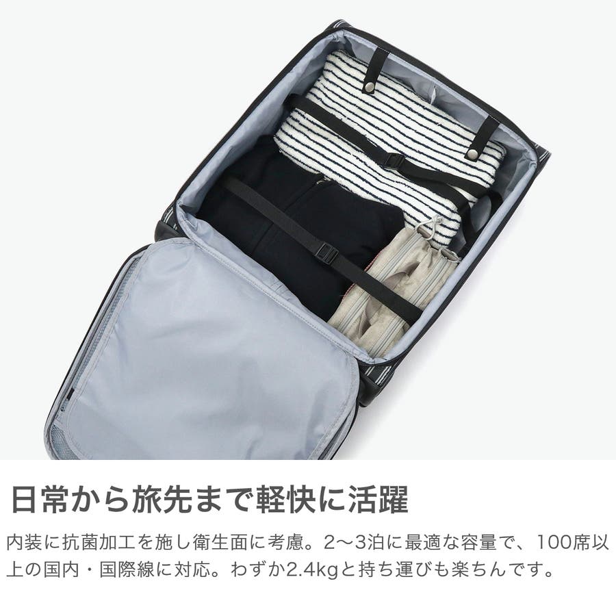 普段使いから2?3泊の旅行まで活躍するソフトキャリー。撥水・抗菌加工を施した生地を使用しており、快適にお使いいただけます。移動中に荷物が取り出せる縦開き仕様や、荷崩れを防ぐ内装ベルトなど、便利な機能が満載。TS南京錠も付属し、セキュリティも安心です。軽量かつコンパクトなサイズ感により、持ち運びや移動がストレスフリーに。スタイリッシュなデザインで、幅広い世代におすすめのアイテムです。
