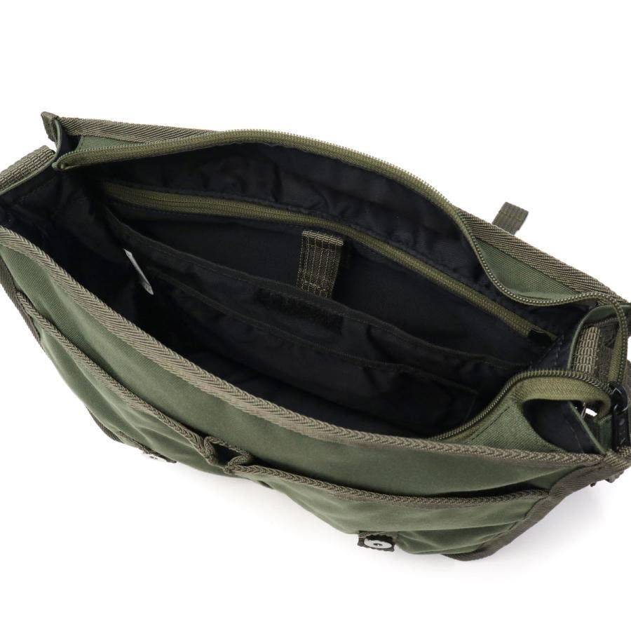 ポリエステルキャンバスを使用した人気シリーズ『EAGLE/イーグル』のショルダーバッグ。内装には片側クッションのポケットを備え、背面ファスナーから直接メインルームにアクセス可能な便利な造り。シリーズ共通の擦れプリントをアクセントとした、気軽にミリタリーテイストをスタイリングに取り入れられるアイテムです。