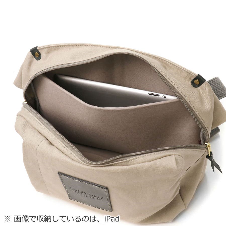 耐久性に優れた高密度帆布にヌメ革のアクセントが効いた、大容量のワンショルダーバッグ。使い込むことで味わいが増し、しなやかでナチュラルな雰囲気で男女問わずお使いいただけるデザインが特徴です。内装はA4サイズに対応しており、マチ幅もしっかり備わっているためファイルやお財布、ペットボトルなどおでかけに必要なアイテムときちんと収納できます。さらに、両側にクッション性を設けたデバイス収納ポケットを備えるなど、オンオフ問わずご使用いただけるのも魅力となっています。